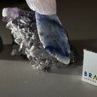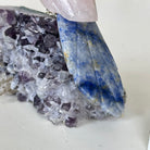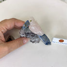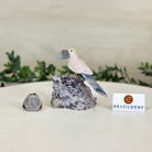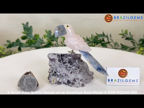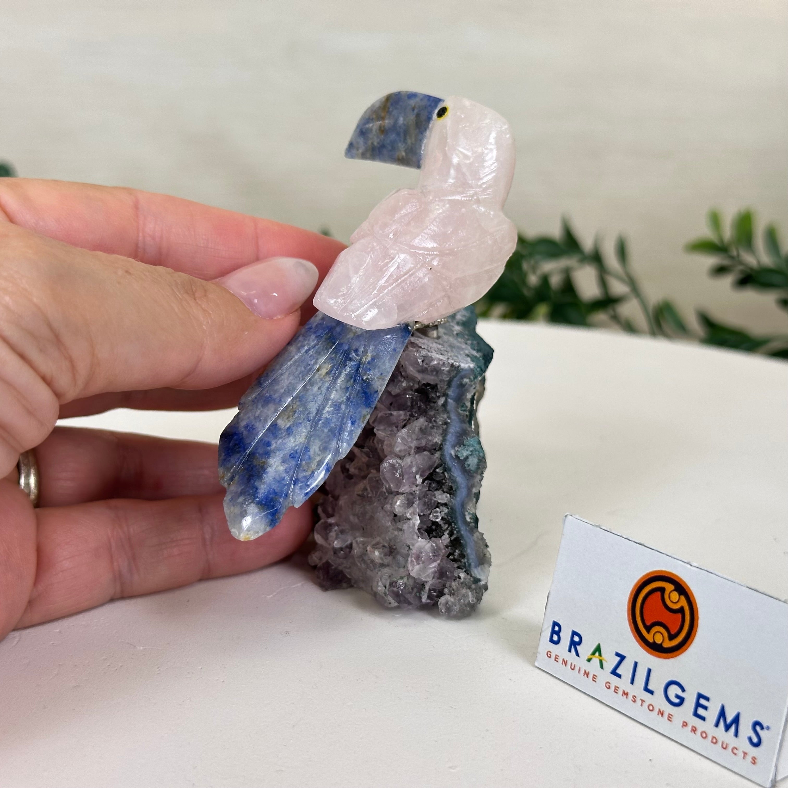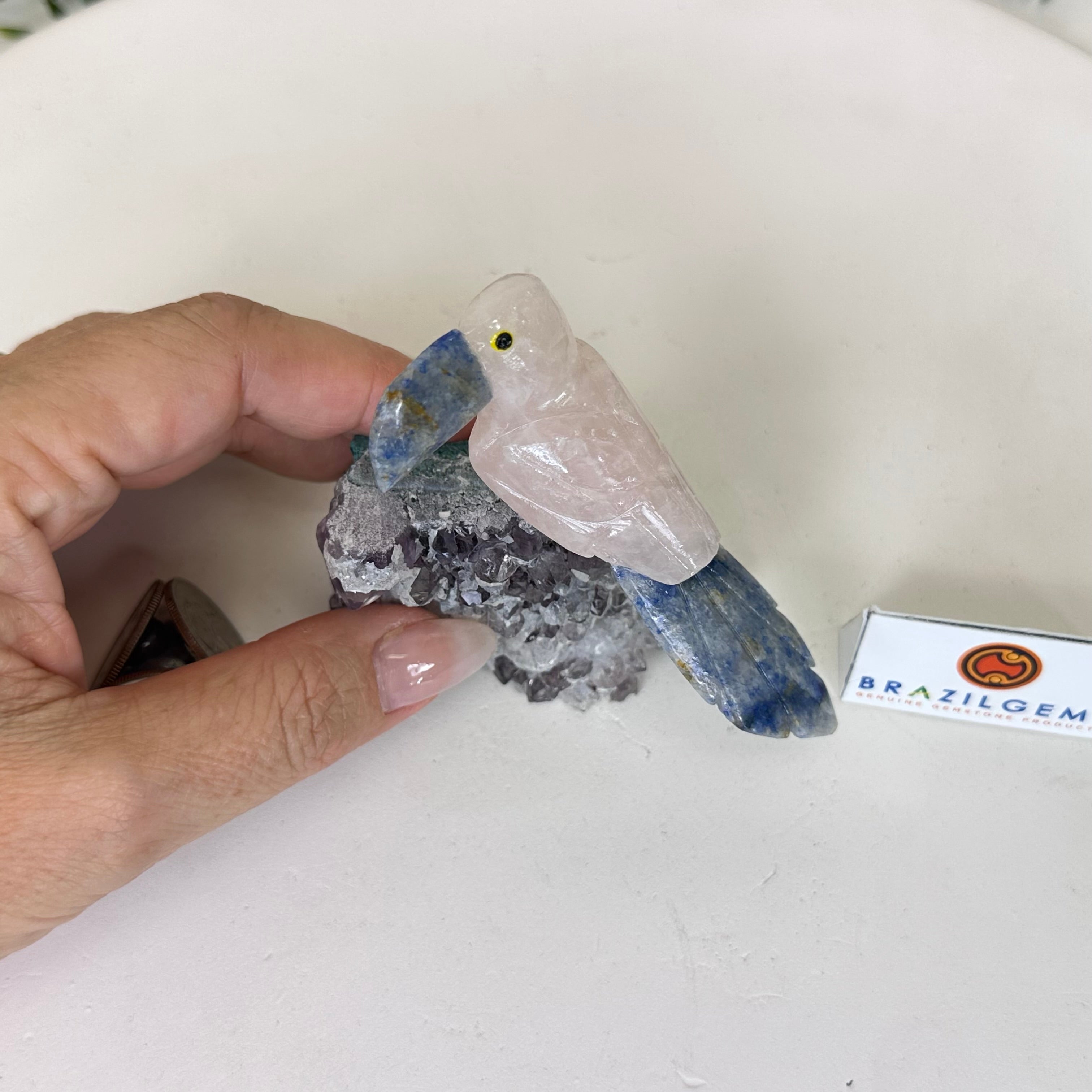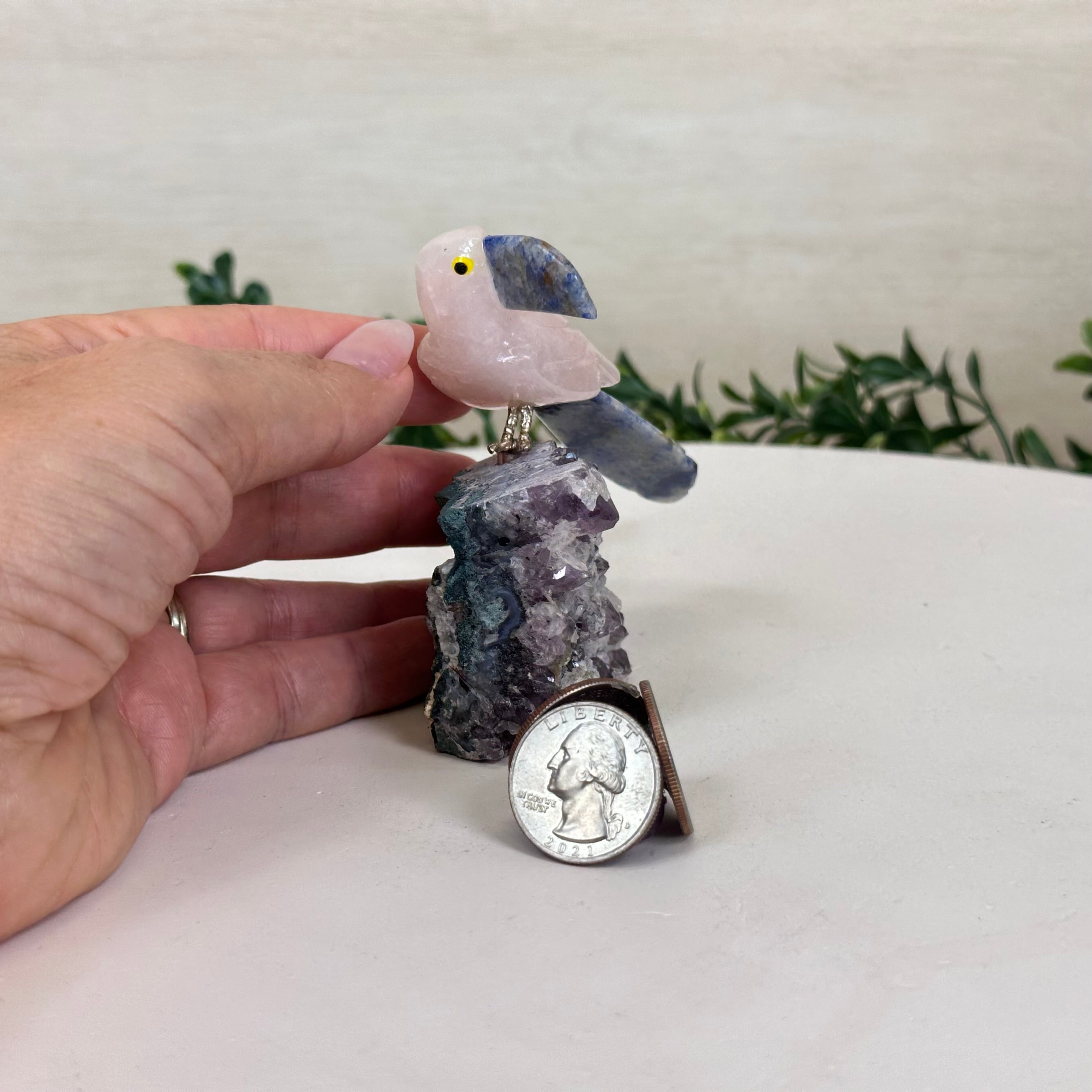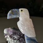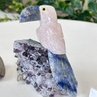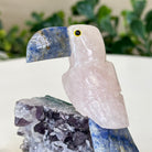 Marvel at our exquisite hand-carved X-Small Size Toucan gemstone bird perched on a captivating Amethyst cluster base, a harmonious blend of nature, art, and elegance. Crafted from premium Rose Quartz for its body, Sodalite for its beak, Sodalite for its tail and adorned with cute little metal feet, this stunning sculpture captures the essence of nature's beauty.
