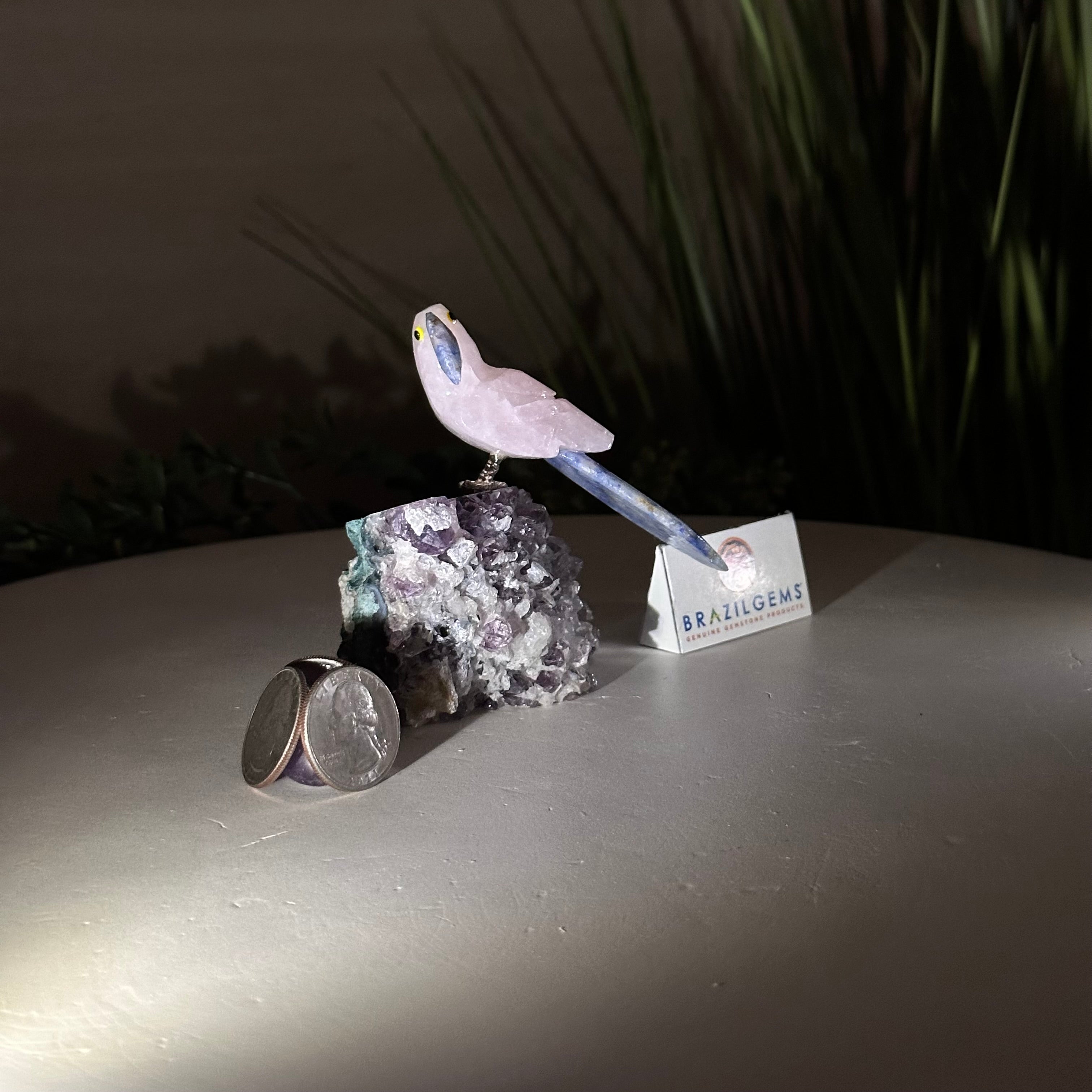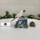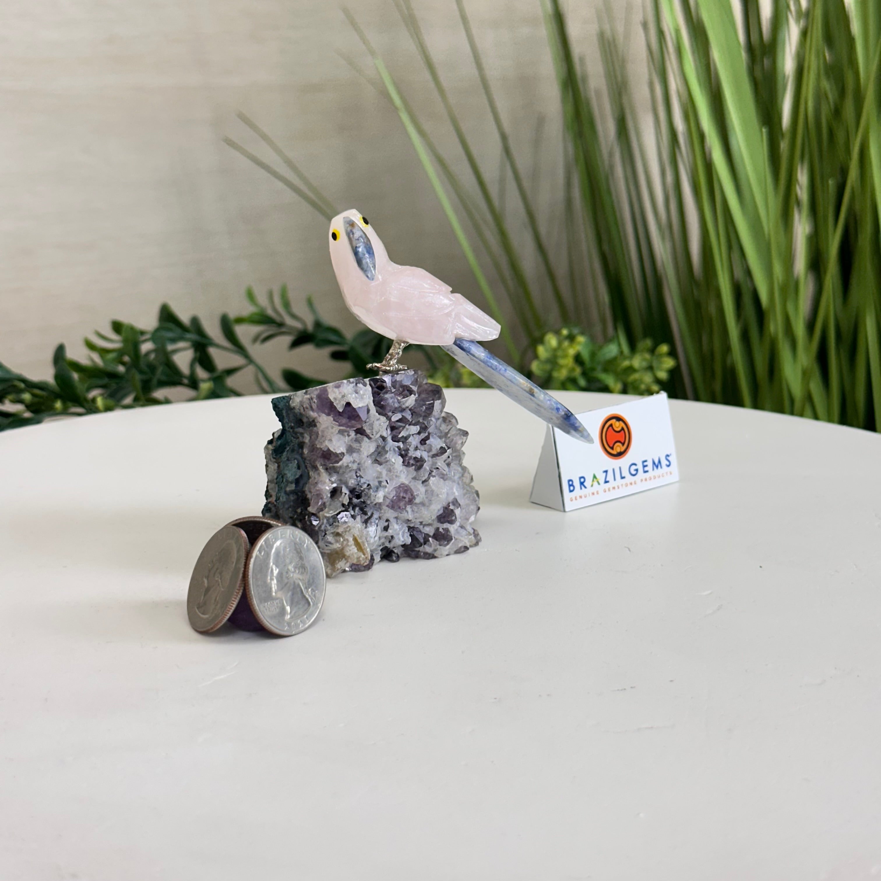 Disclaimer: This is a natural gemstone product sold by Brazil Gems® as is and as you see it in its images and video. The bird figurine has been hand carved out of natural gemstones and constructed together to give it its unique look. It and its cluster base may contain natural imperfections as well as imperfections, broken edges and repairs from the hand carving, extraction, mounting and prepping processes. The cluster base has a small hole drilled in the top for the bird to mount into. The crystal bird detaches from its base for shipping purposes. At Brazil Gems® we make every effort to get measurements as exact as possible but they are done by human hands and eyes and therefore may have minor discrepancies.