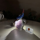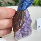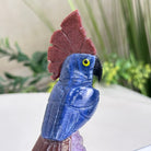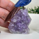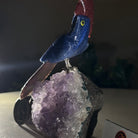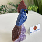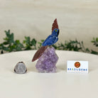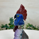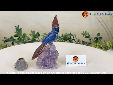 Marvel at our exquisite hand-carved X-Small Size Cockatoo gemstone bird perched on a captivating Amethyst cluster base, a harmonious blend of nature, art, and elegance. Crafted from premium Sodalite for its body, Black Onyx for its beak, Red Jasper for its crest and its tail and adorned with cute little metal feet, this stunning sculpture captures the essence of nature's beauty.