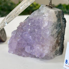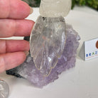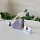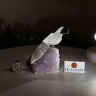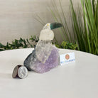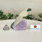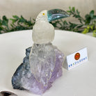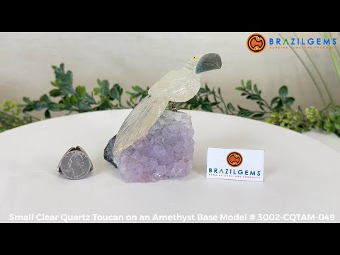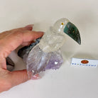 Marvel at our exquisite hand-carved Small Size Toucan crystal bird perched on a captivating Amethyst cluster base, a harmonious blend of nature, art, and elegance. Crafted from premium Clear Quartz for its body, Green Jasper for its beak, Clear Quartz for its tail and adorned with cute little metal feet, this stunning sculpture captures the essence of nature's beauty.
