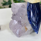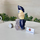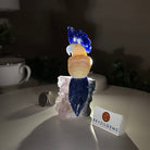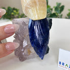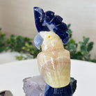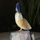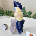 Marvel at our exquisite hand-carved Small Size Cockatoo crystal bird perched on a captivating Amethyst cluster base, a harmonious blend of nature, art, and elegance. Crafted from premium Honey Onyx for its body, Blue Quartz for its beak, Sodalite for its crest and tail and adorned with cute little metal feet, this stunning sculpture captures the essence of nature's beauty.