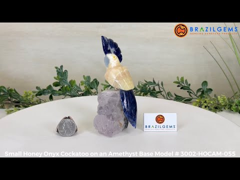 Each intricate detail of the bird is meticulously carved by skilled Brazilian artisans who have mastered the technique that combines the beauty of Brazil's gemstones with their colorful native birds into an amazing art piece. Elevate your space with the timeless charm of our Cockatoo gemstone bird on an Amethyst base.