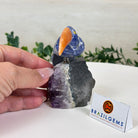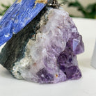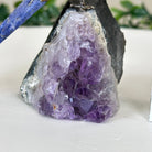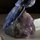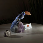 Marvel at our exquisite hand-carved Small Size Toucan crystal bird perched on a captivating Amethyst cluster base, a harmonious blend of nature, art, and elegance. Crafted from premium Sodalite for its body, Orchid Calcite for its beak, Sodalite for its tail and adorned with cute little metal feet, this stunning sculpture captures the essence of nature's beauty.