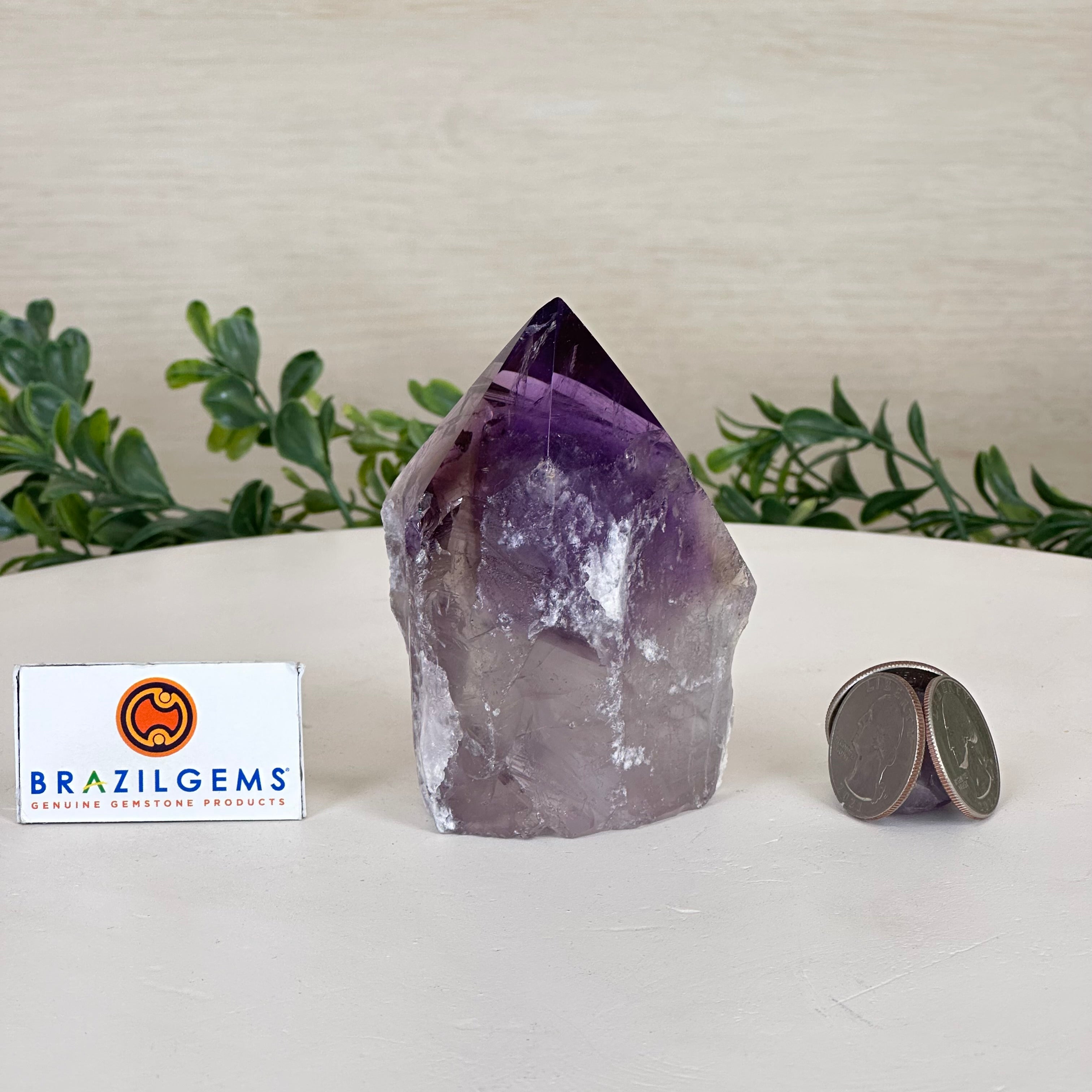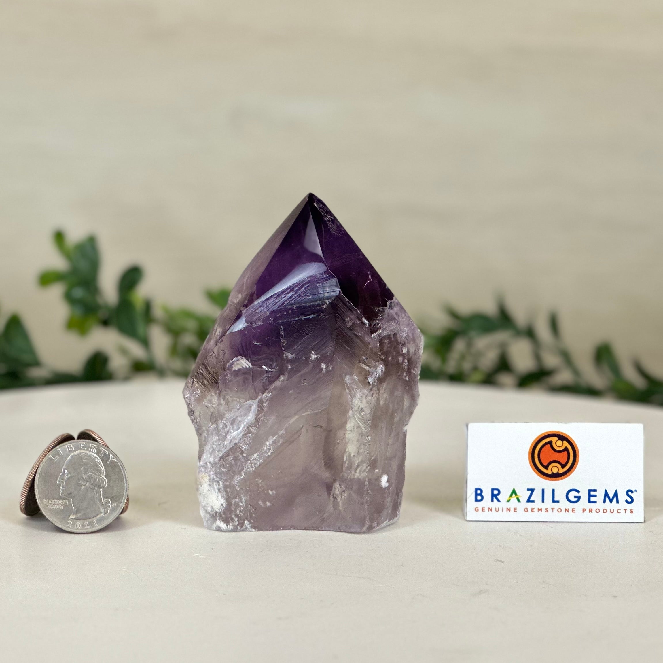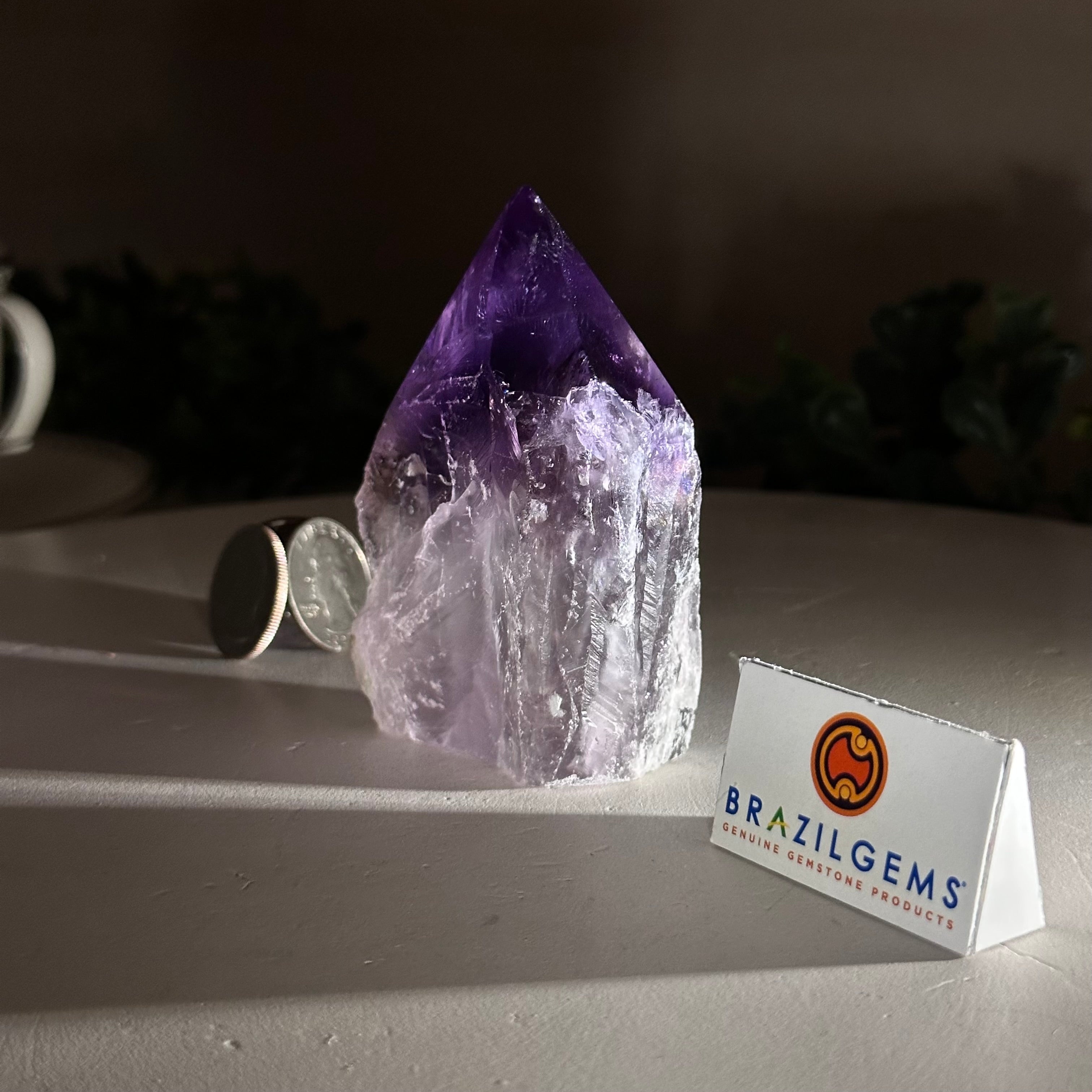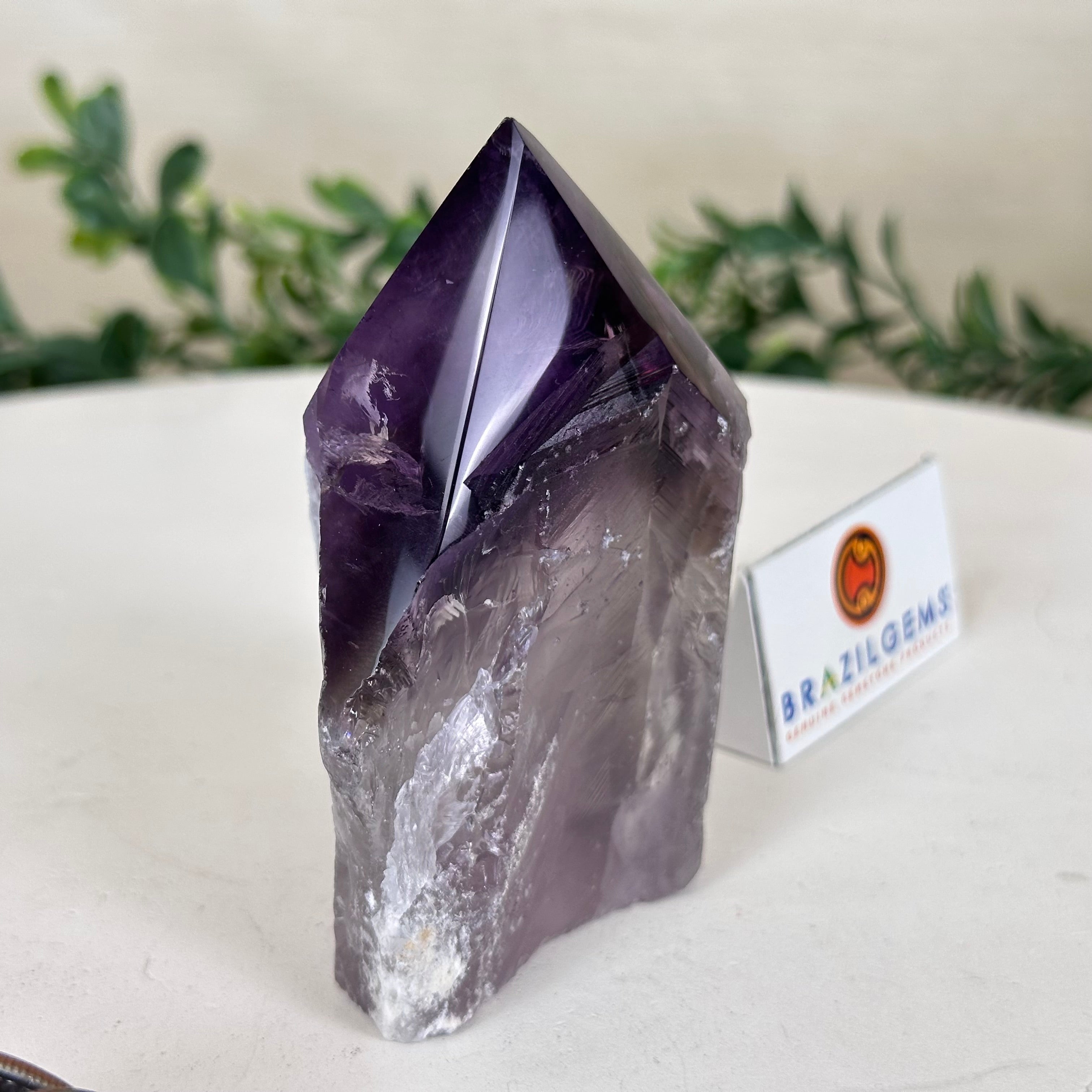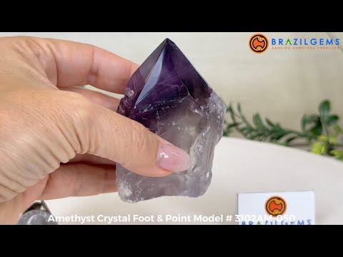 Elevate your spiritual rituals with Brazil Gems' Super Quality Polished Amethyst Crystal Foot & Point. Featuring deep purple tones, this exquisite crystal exudes incredible energy and exquisite artistry. Whether used in meditation or healing, it is a must-have for the refined crystal connoisseur. With its polished point, flat base, and raw side edges, this piece has a tactile and visual appeal, perfect to hold or display on a tabletop.