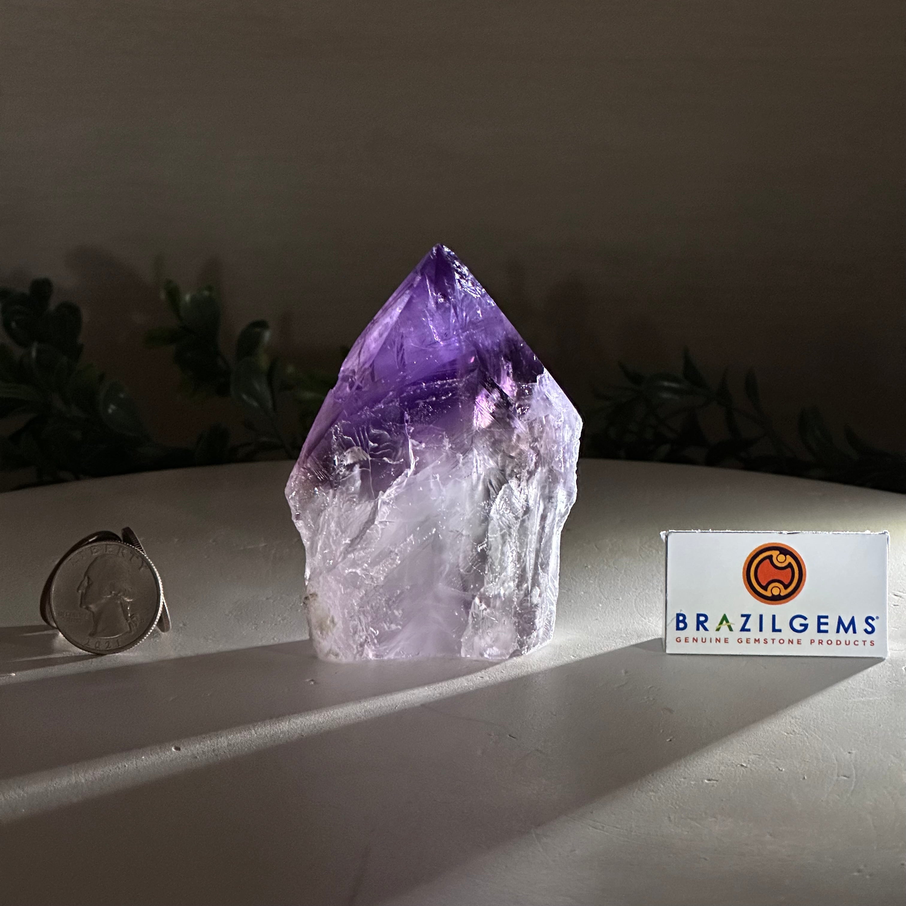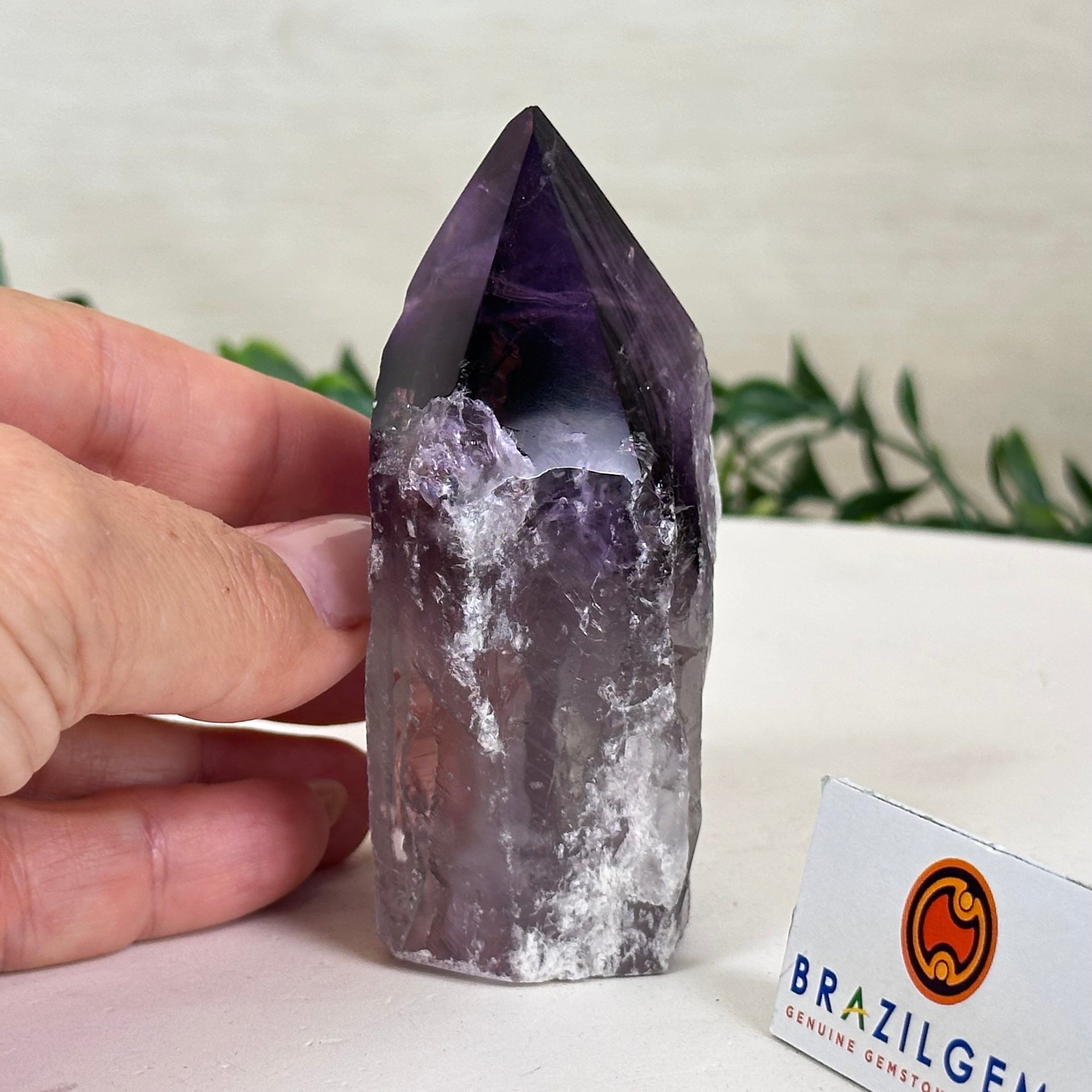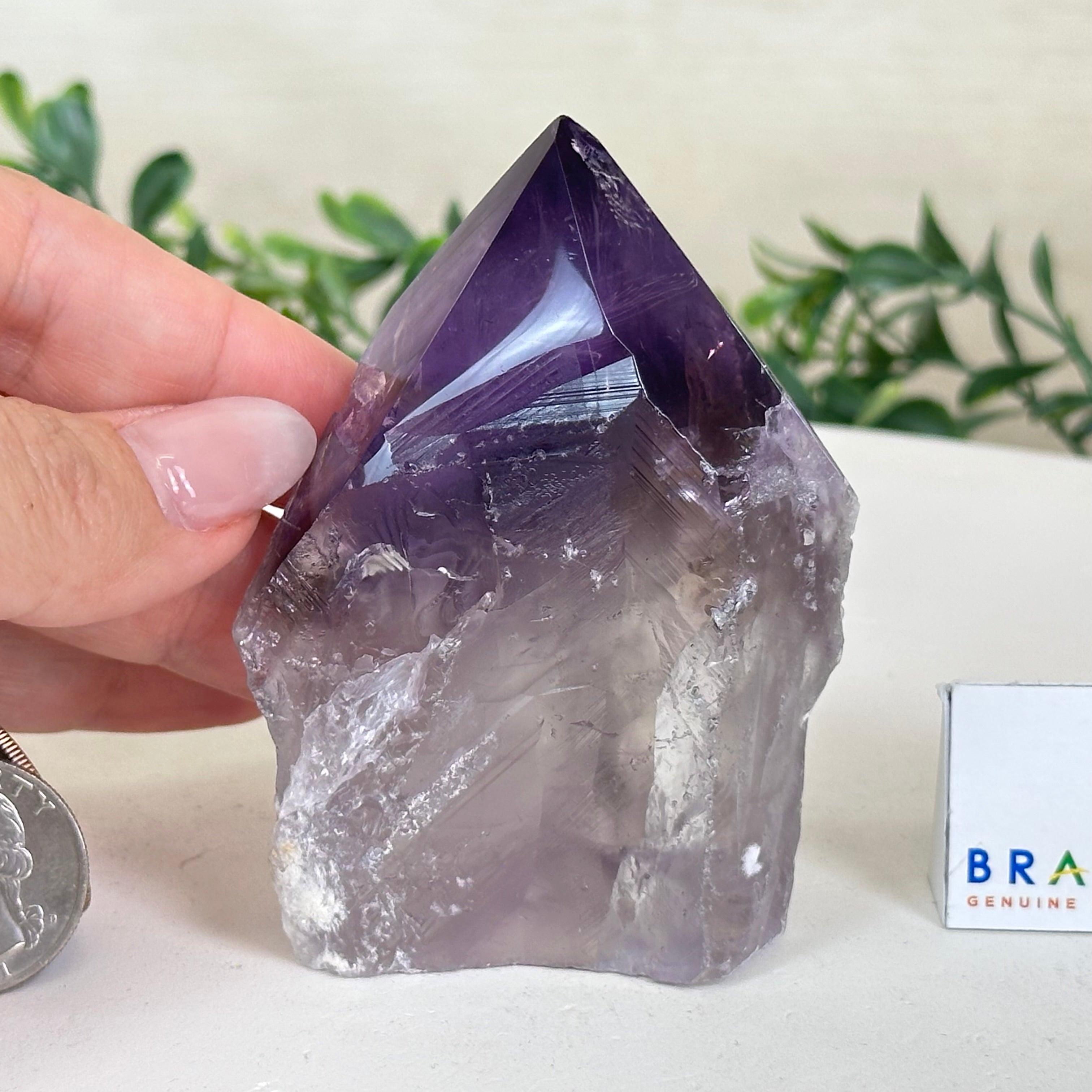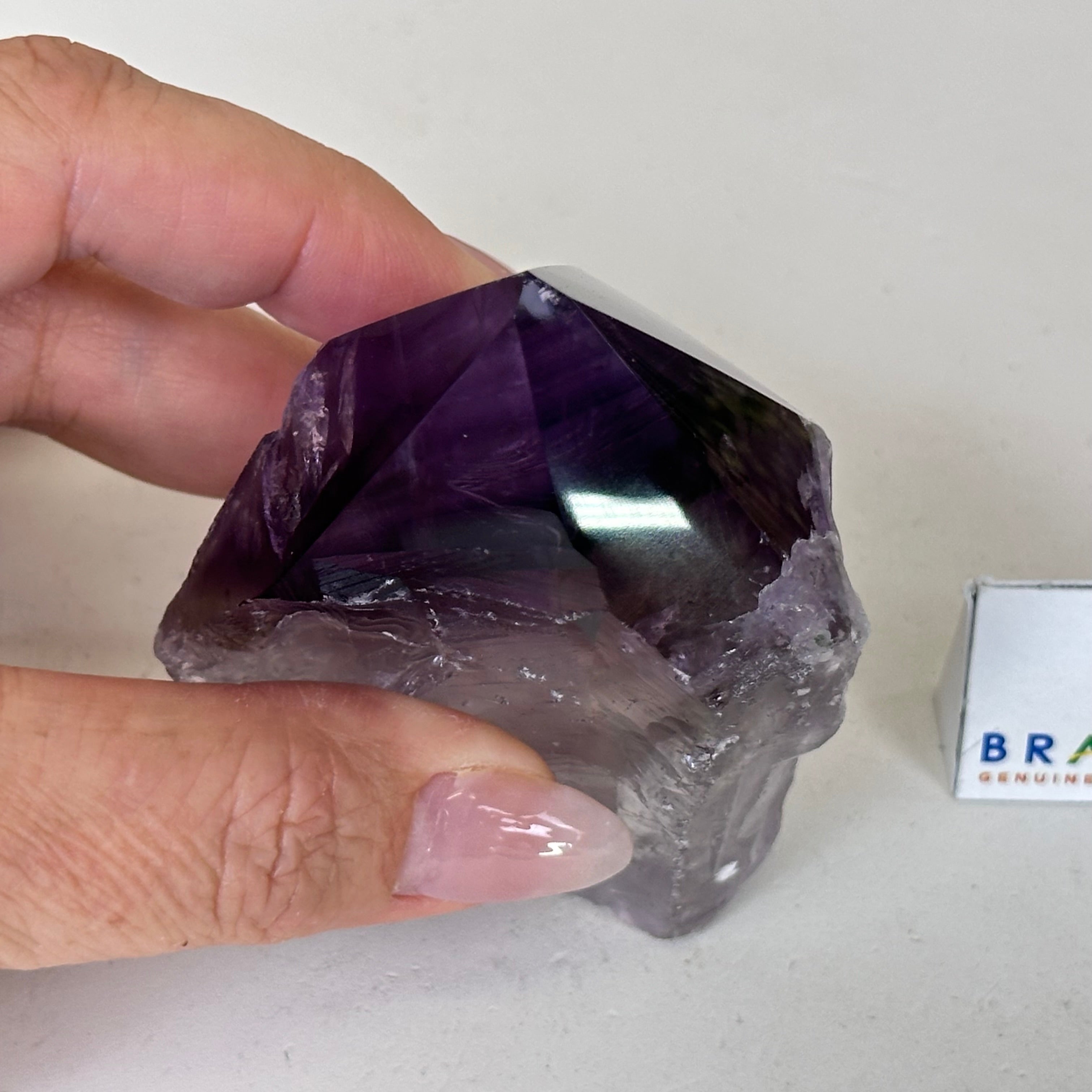 Elevate your spiritual rituals with Brazil Gems' Super Quality Polished Amethyst Crystal Foot & Point. Featuring deep purple tones, this exquisite crystal exudes incredible energy and exquisite artistry. Whether used in meditation or healing, it is a must-have for the refined crystal connoisseur. With its polished point, flat base, and raw side edges, this piece has a tactile and visual appeal, perfect to hold or display on a tabletop.