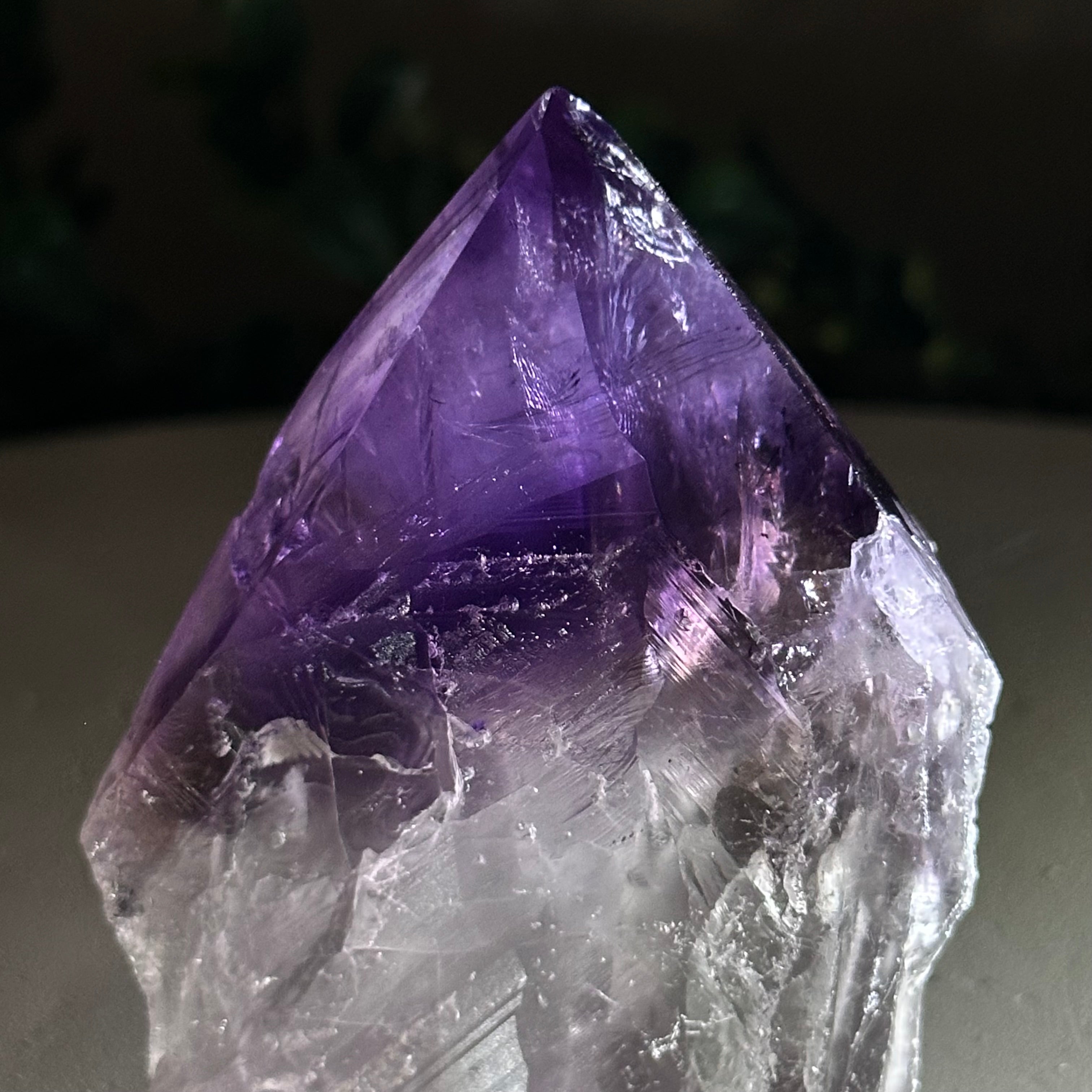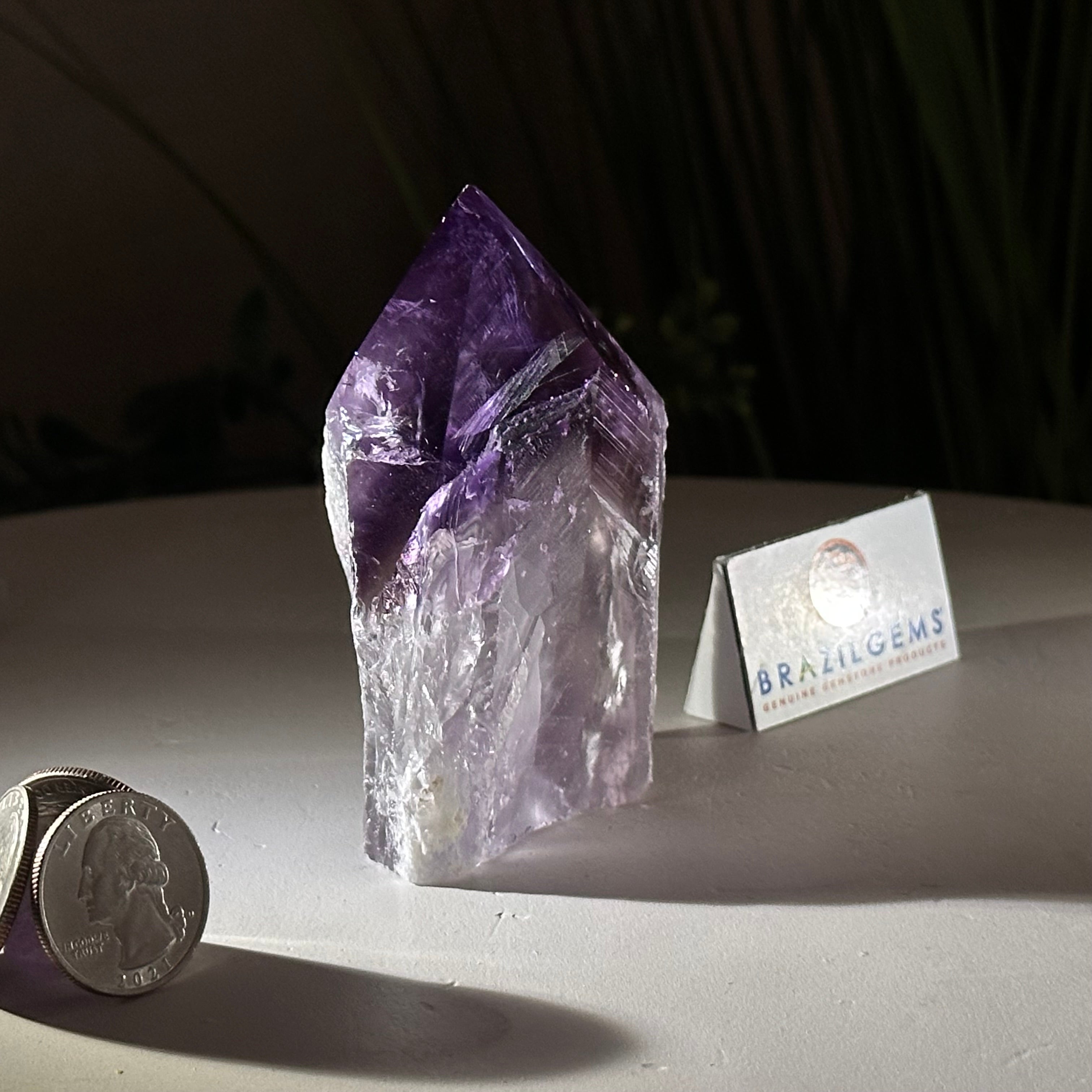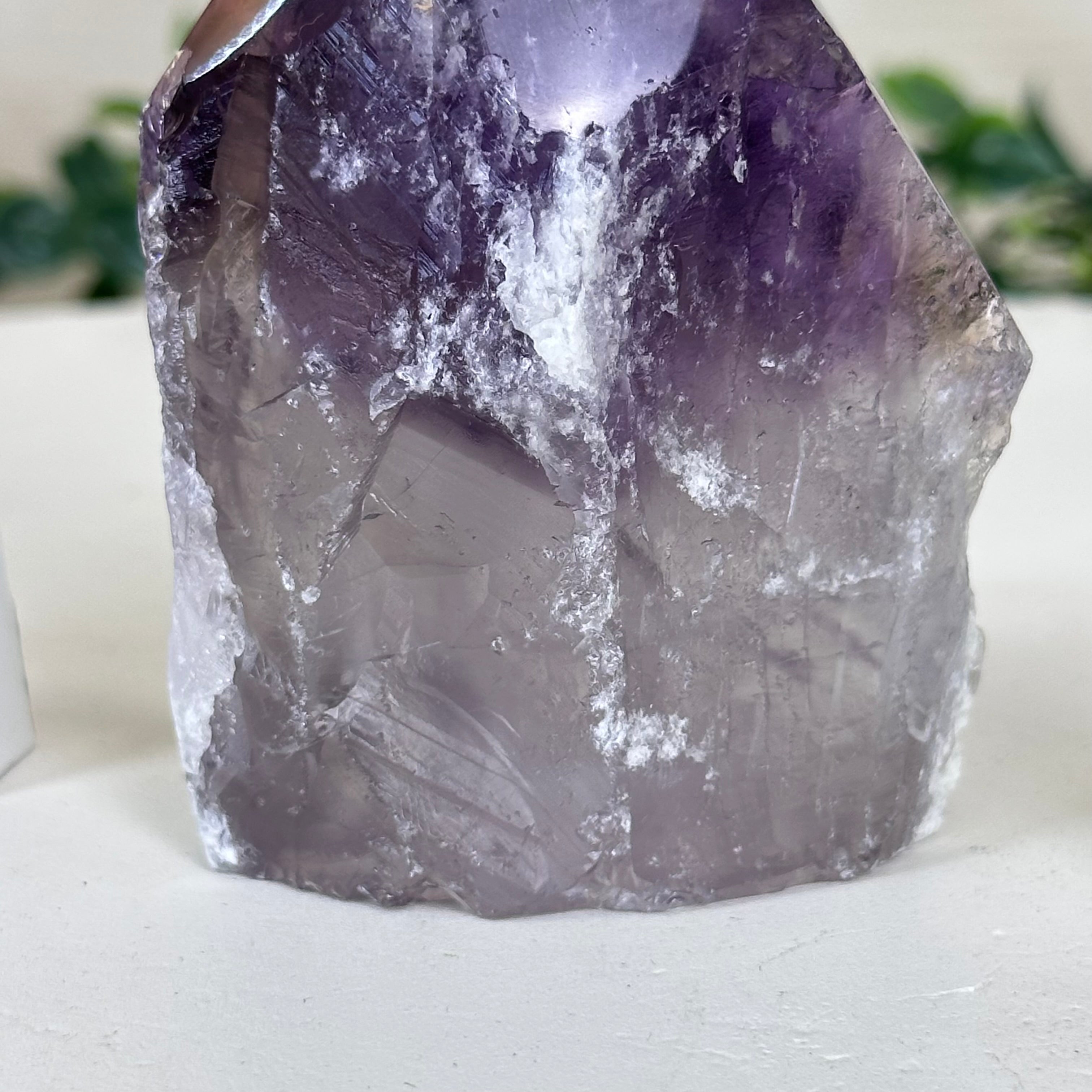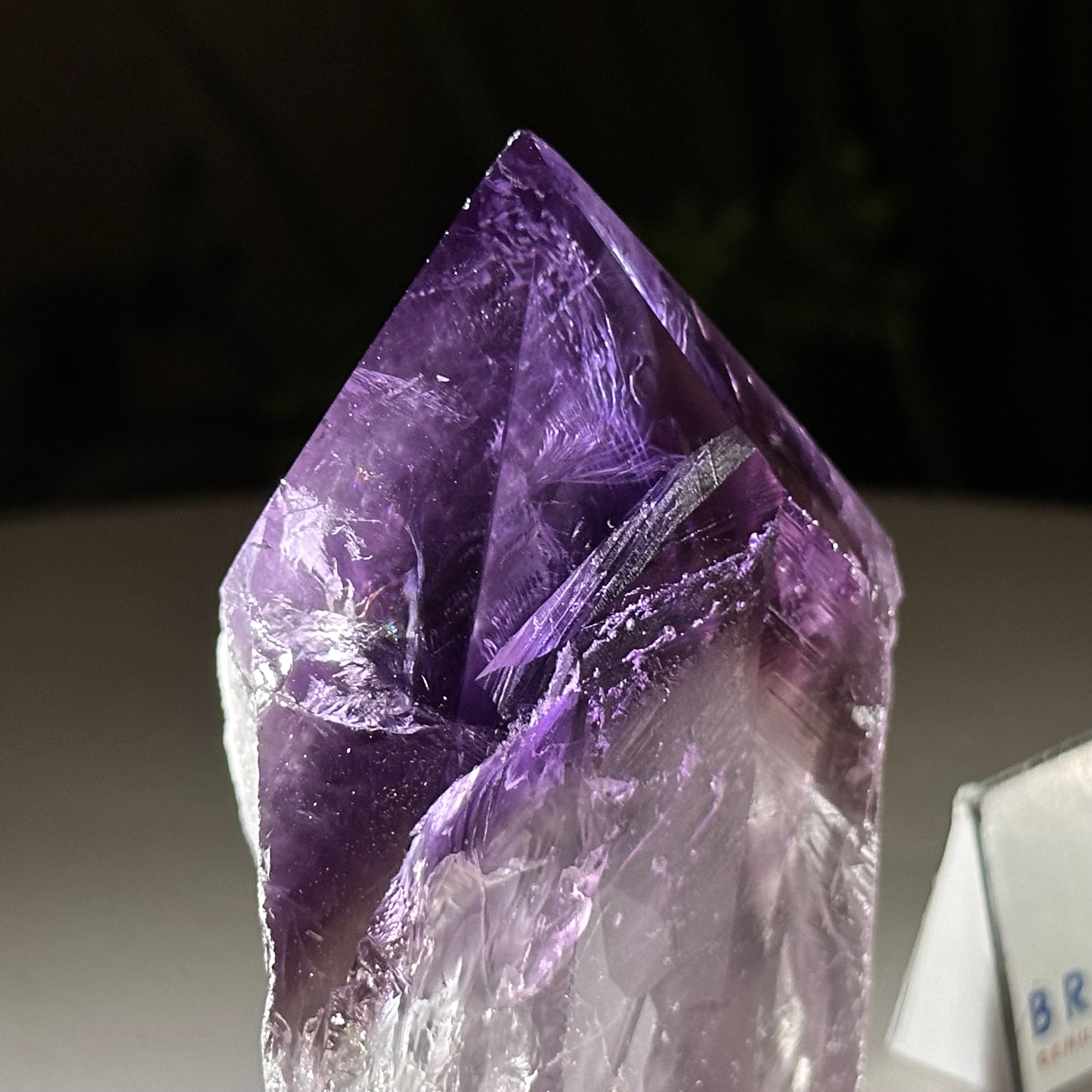 Elevate your spiritual rituals with Brazil Gems' Super Quality Polished Amethyst Crystal Foot & Point. Featuring deep purple tones, this exquisite crystal exudes incredible energy and exquisite artistry. Whether used in meditation or healing, it is a must-have for the refined crystal connoisseur. With its polished point, flat base, and raw side edges, this piece has a tactile and visual appeal, perfect to hold or display on a tabletop.