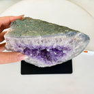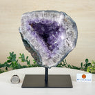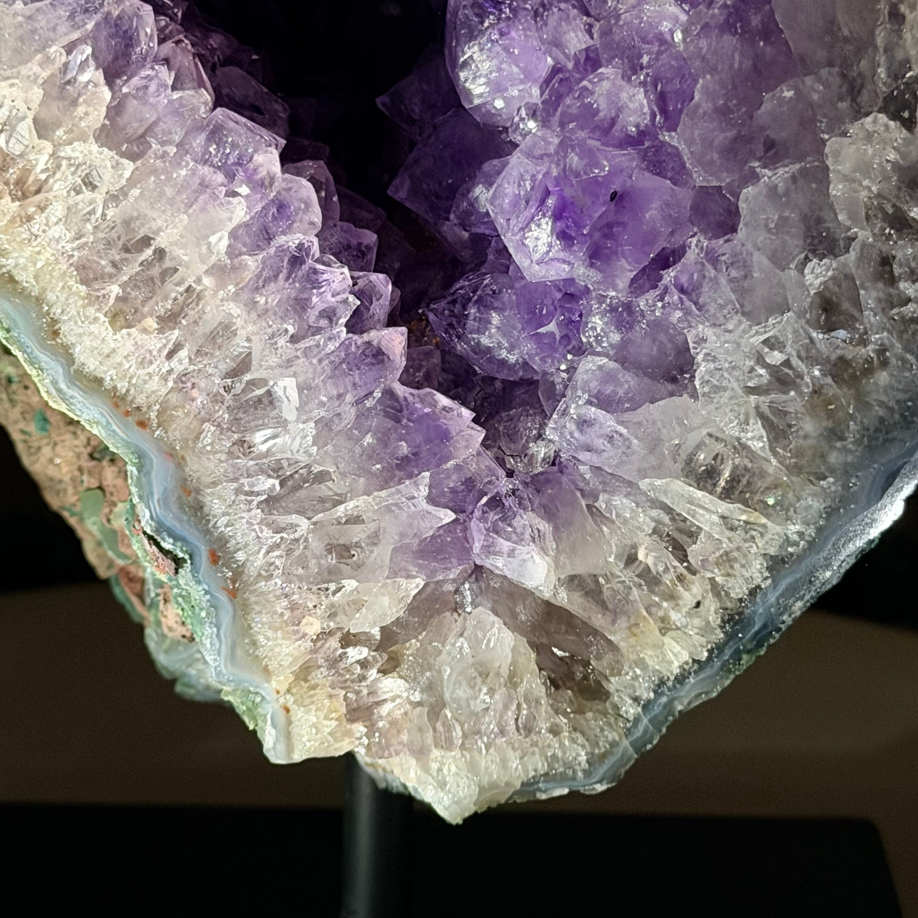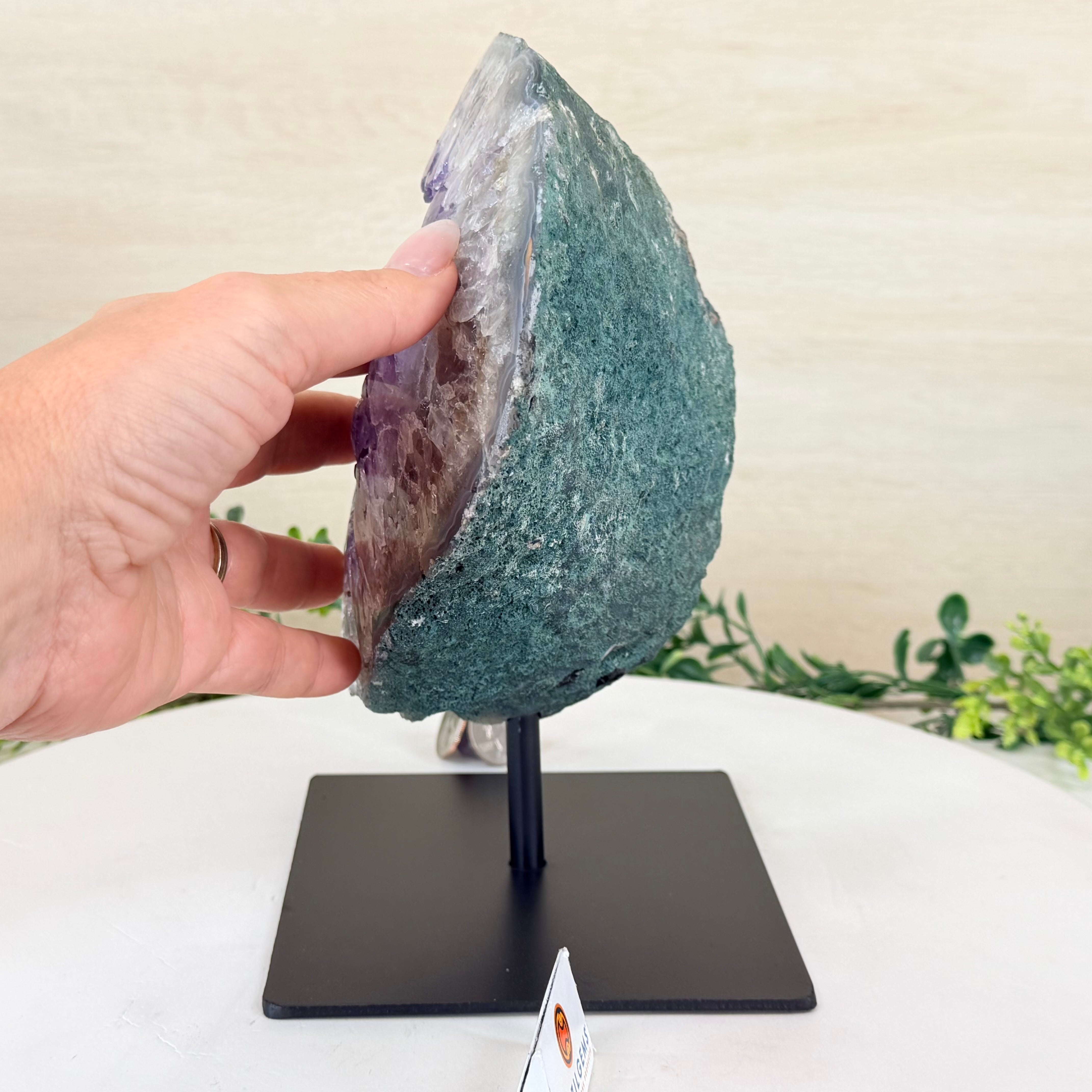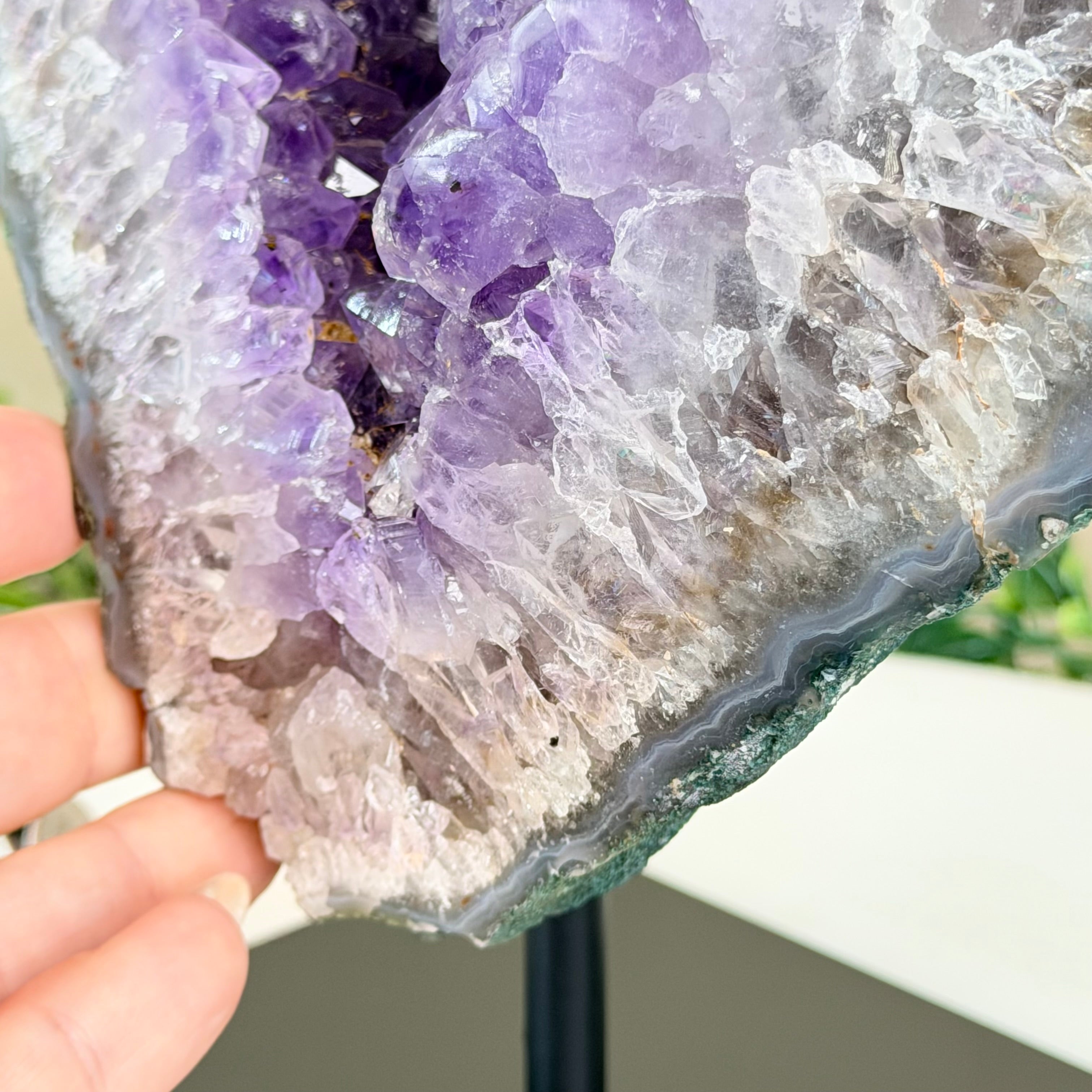 Add a touch of charm to your home or office decor with our Extra Quality Amethyst Cluster. This piece features amethyst points, polished edges and a rough natural outer shell mounted on a black metal stand (a drilled hole in the bottom of the piece allows it to mount and be upright on its stand). It's fabulous to display as a statement piece to elevate your space.