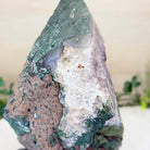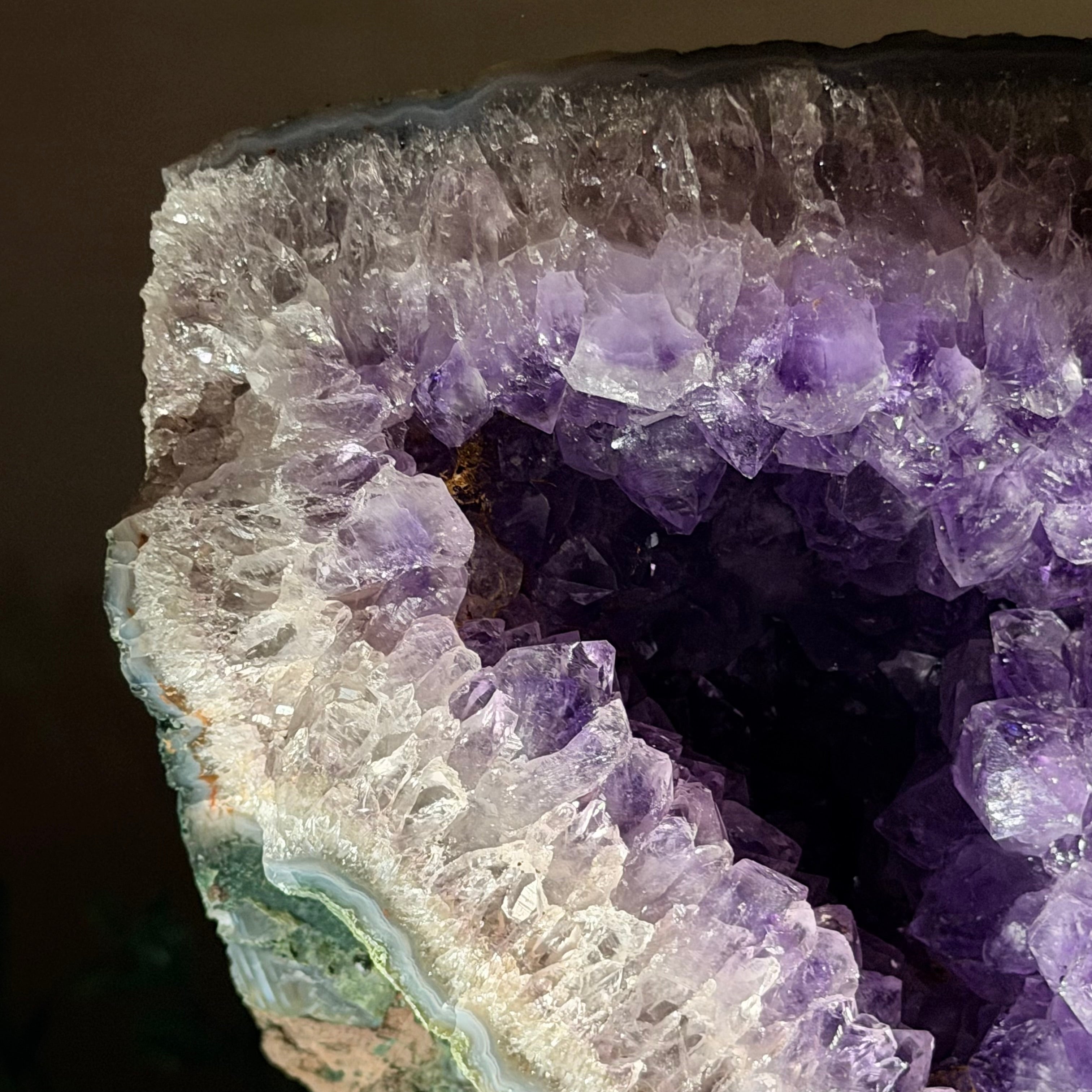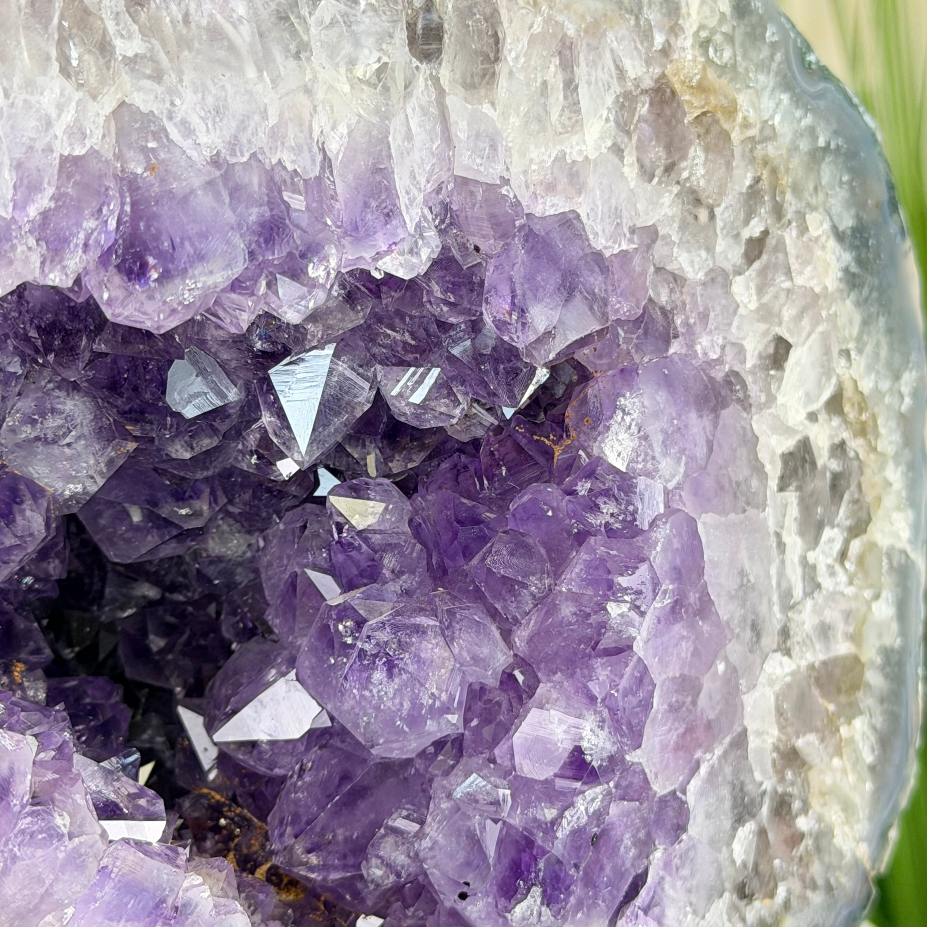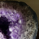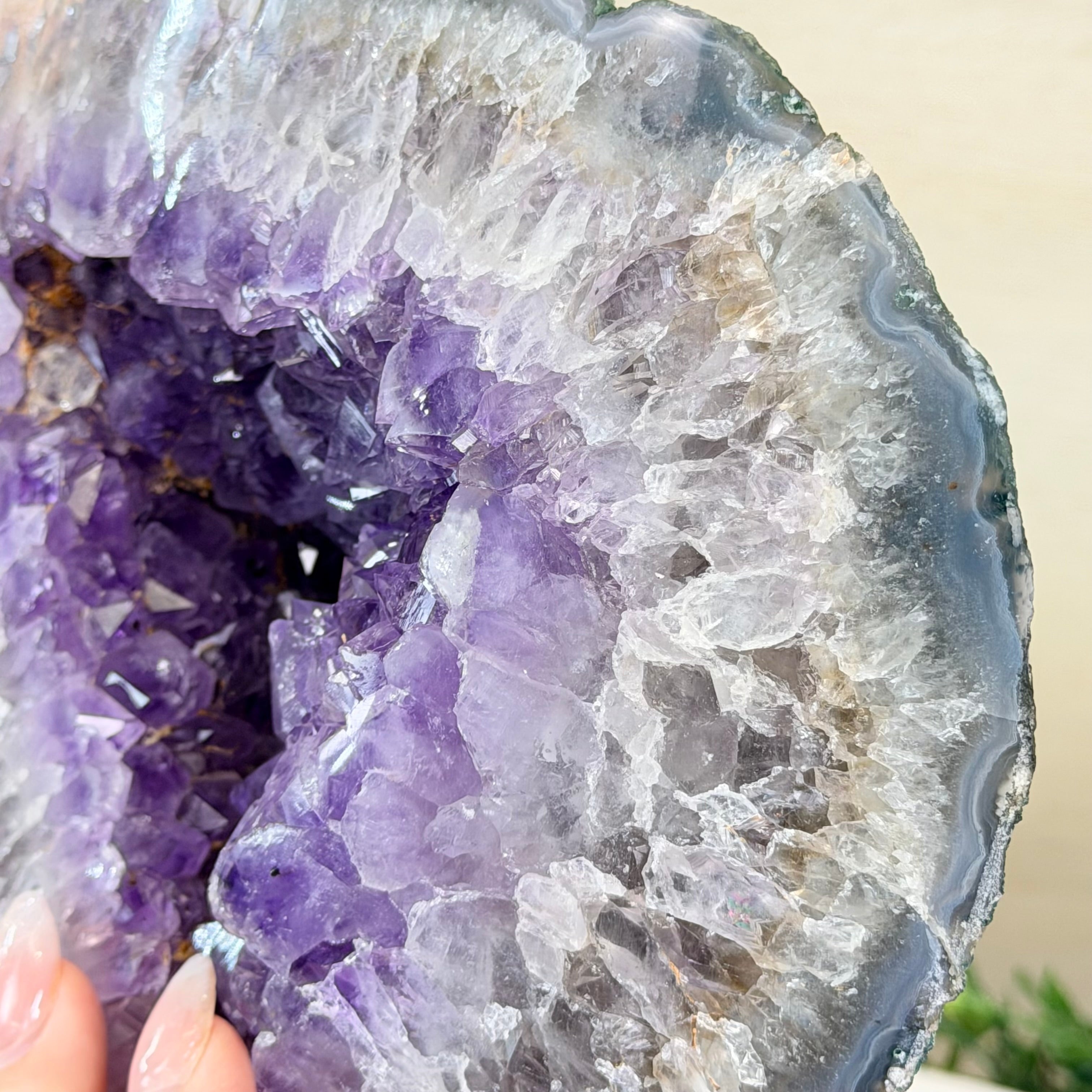 Add a touch of charm to your home or office decor with our Extra Quality Amethyst Cluster. This piece features amethyst points, polished edges and a rough natural outer shell mounted on a black metal stand (a drilled hole in the bottom of the piece allows it to mount and be upright on its stand). It's fabulous to display as a statement piece to elevate your space.