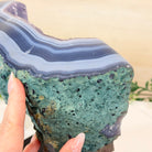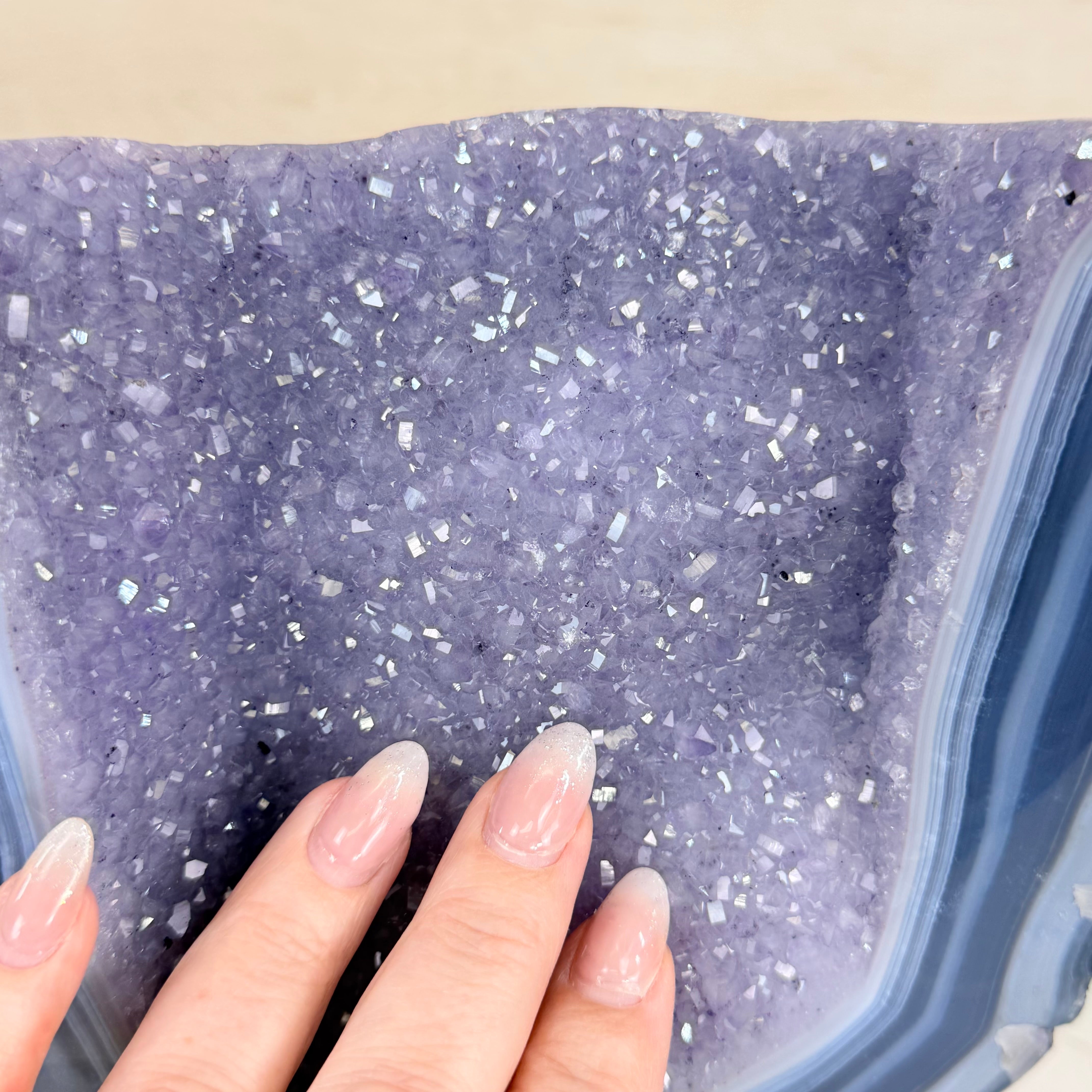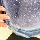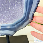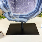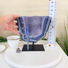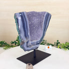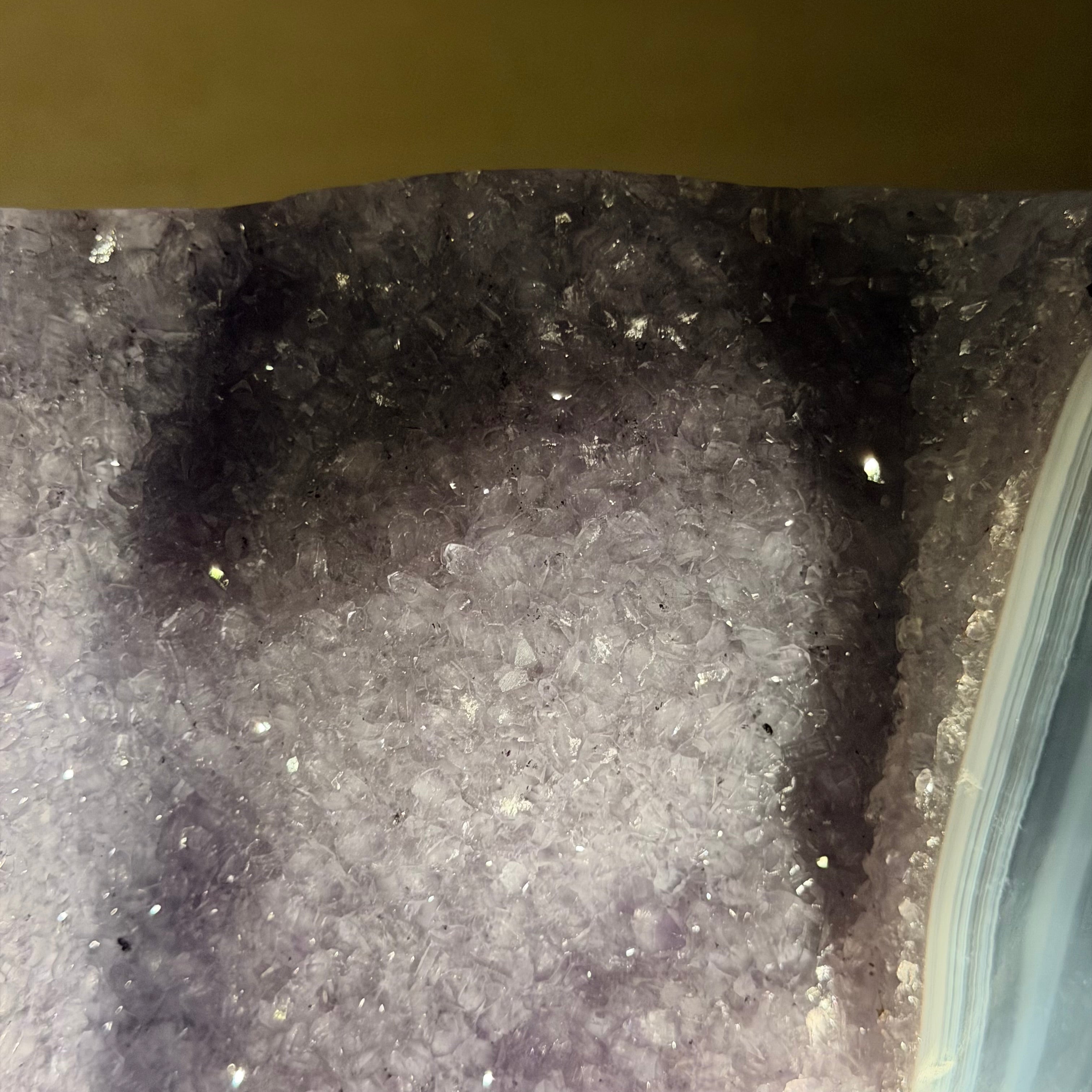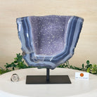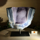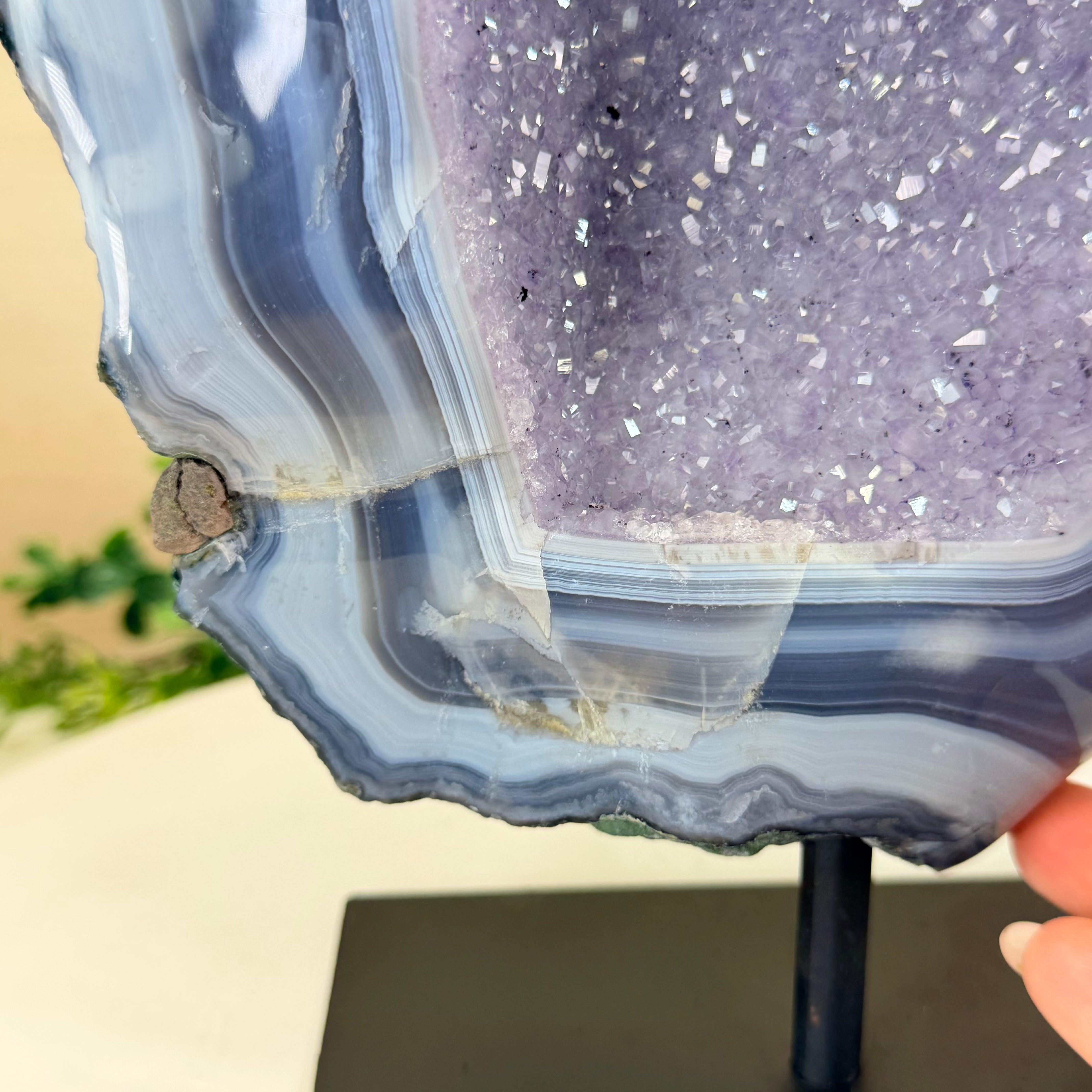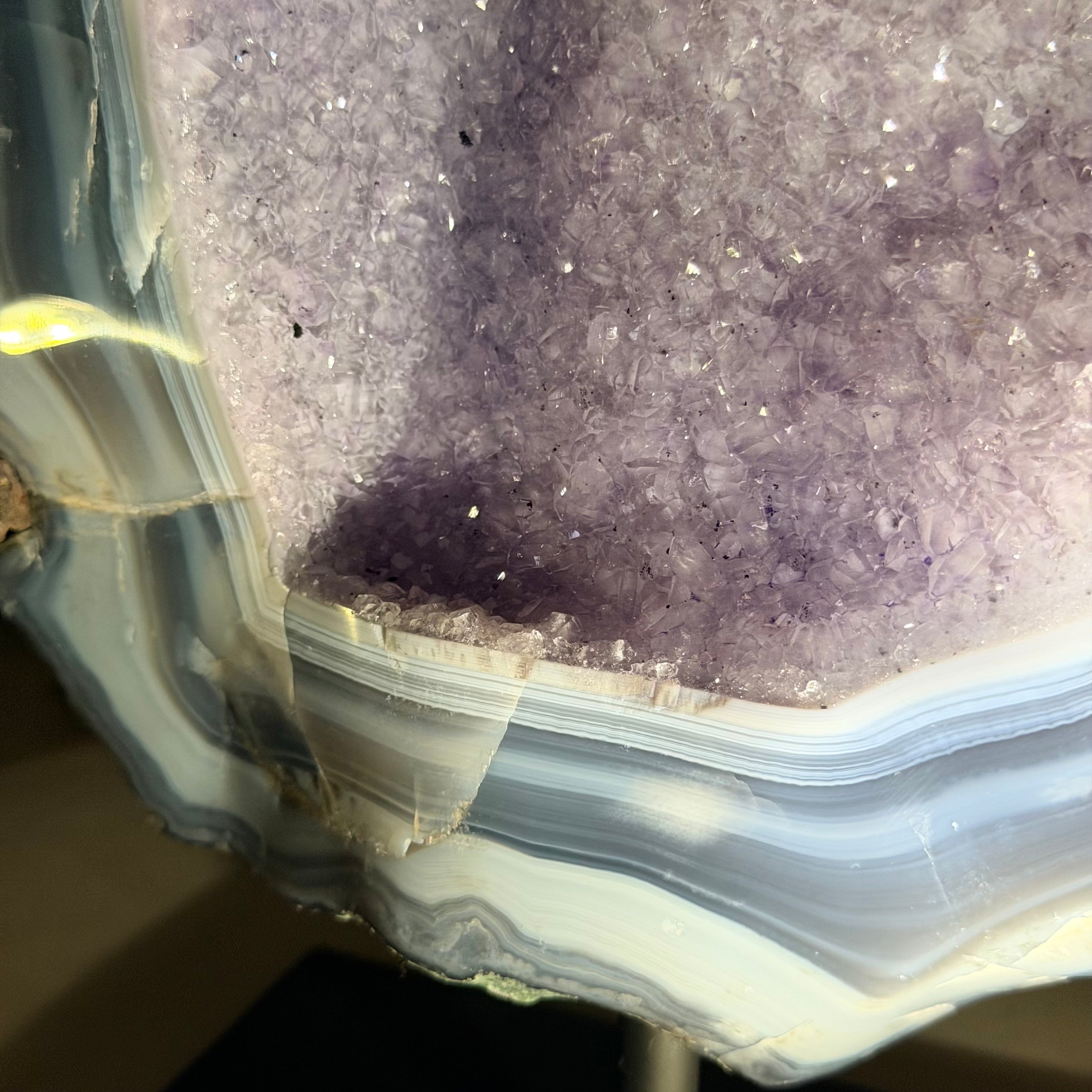 Add a touch of charm to your home or office decor with our Extra Quality Amethyst Cluster. This piece features small and sparkly amethyst points, polished edges with agate bands and a rough natural outer shell mounted on a black metal stand (a drilled hole in the bottom of the piece allows it to mount and be upright on its stand). It's fabulous to display as a statement piece to elevate your space.