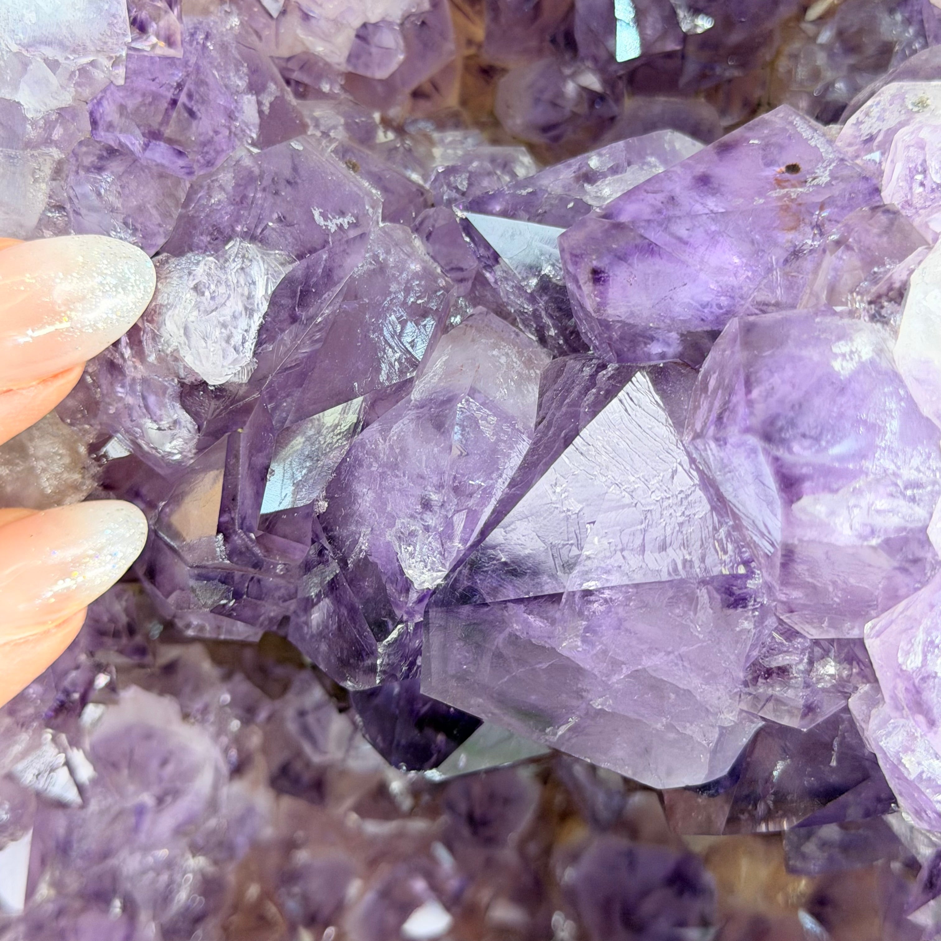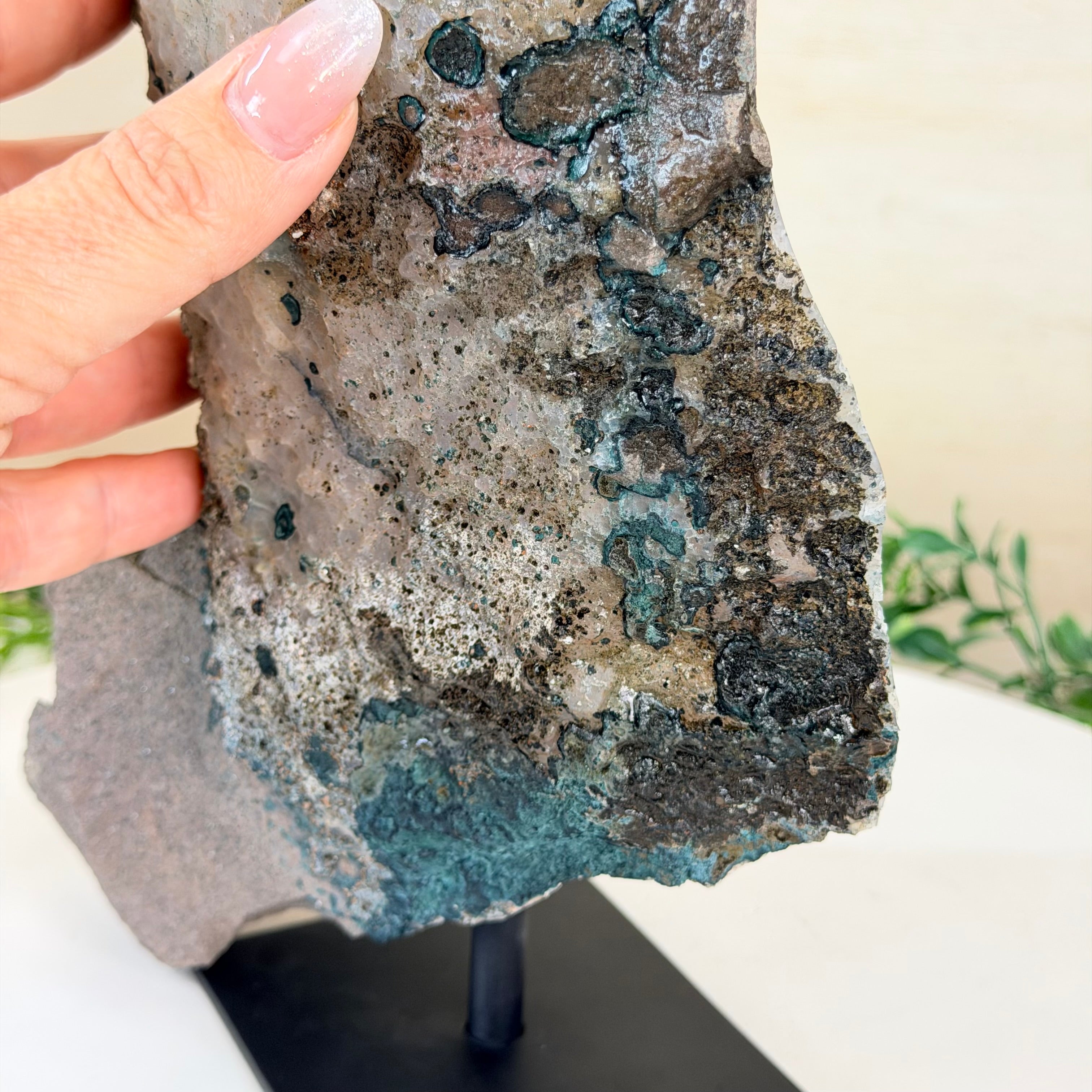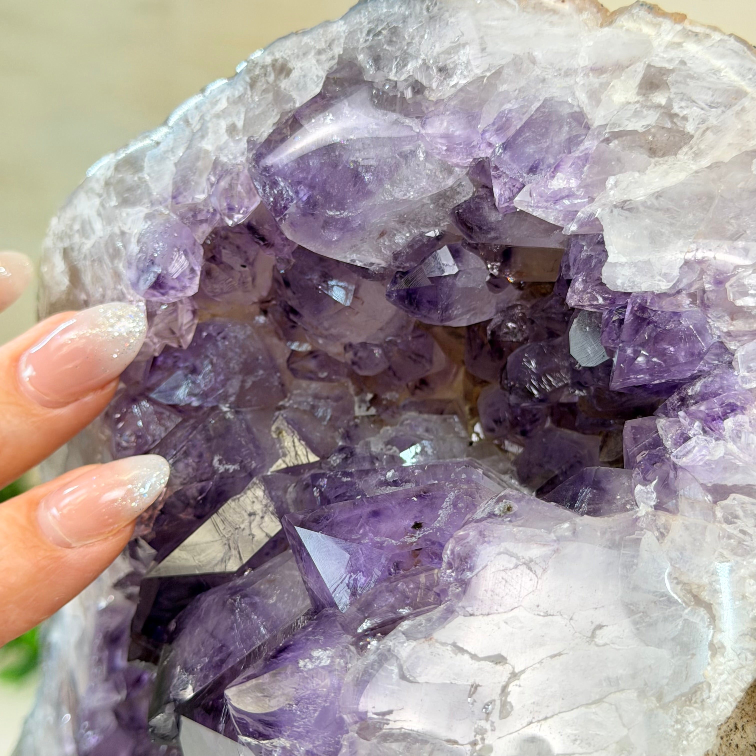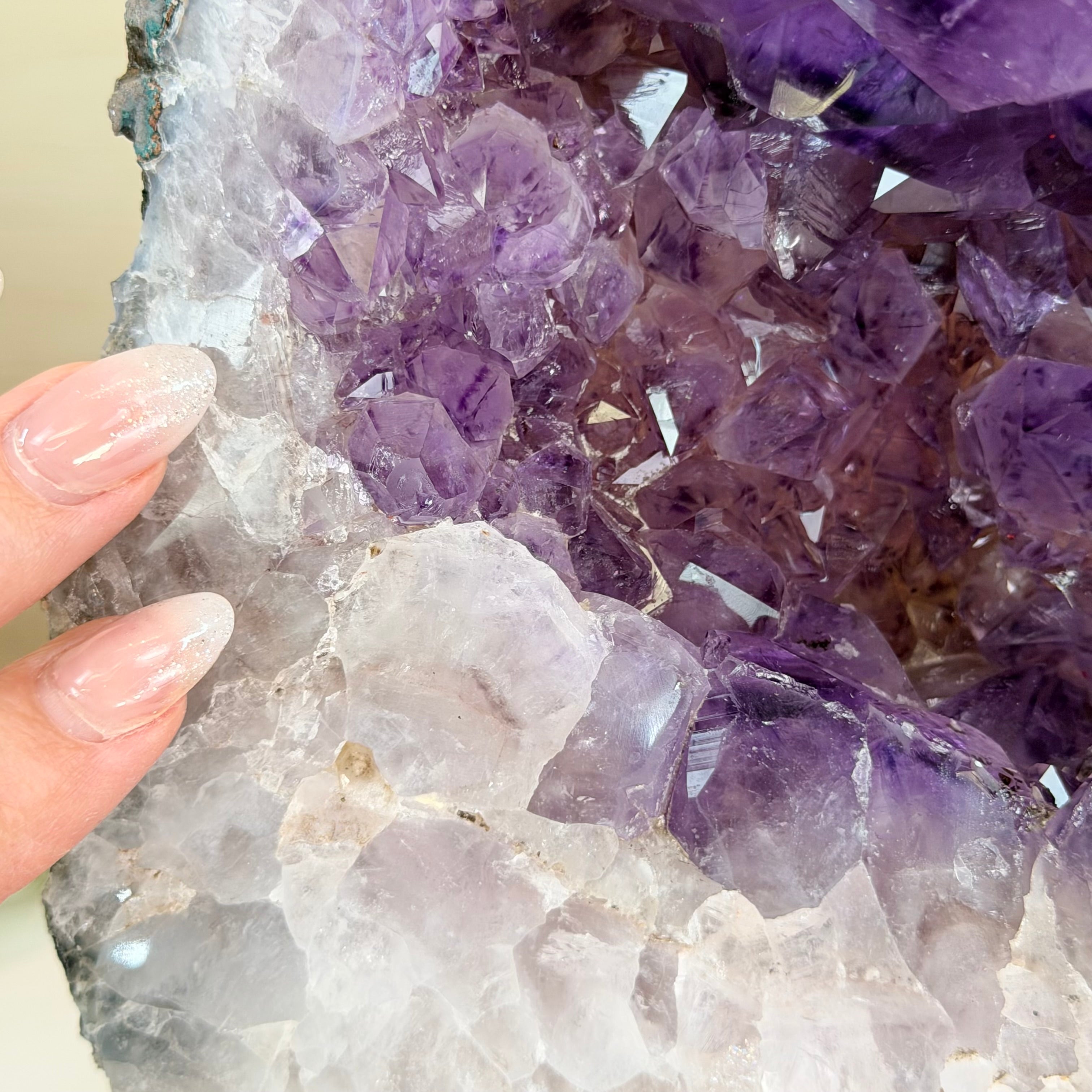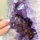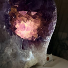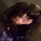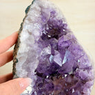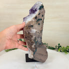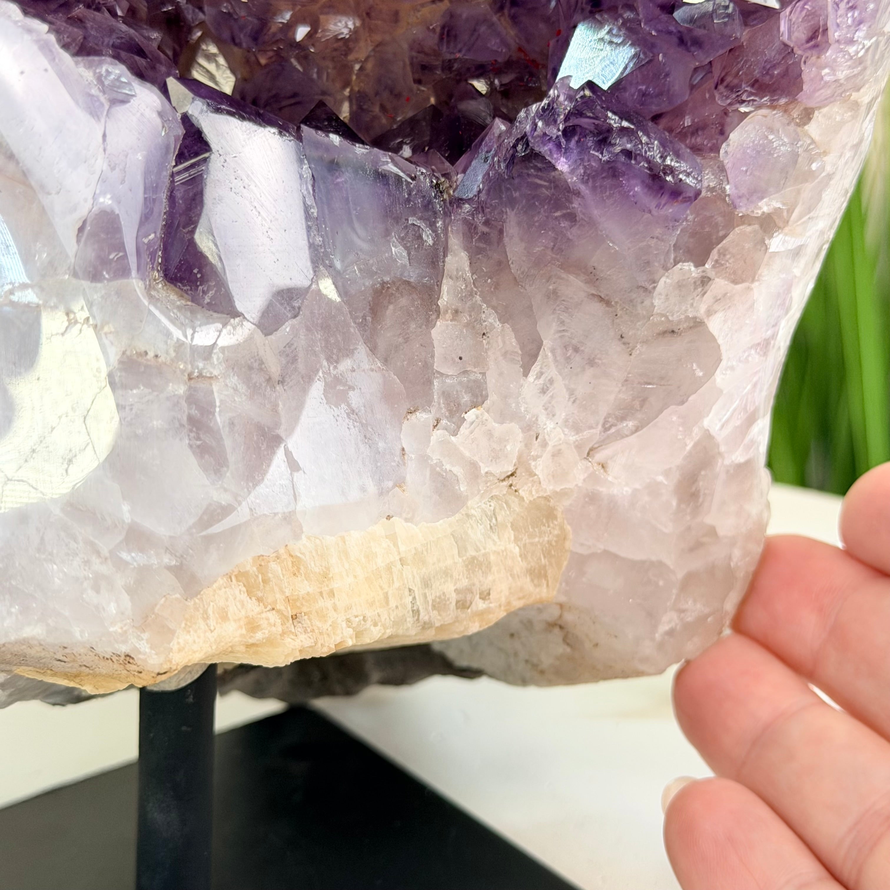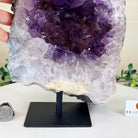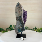 Add a touch of charm to your home or office decor with our Extra Quality Amethyst Cluster. This piece features amethyst points, polished edges and a rough natural outer shell mounted on a black metal stand (a drilled hole in the bottom of the piece allows it to mount and be upright on its stand). It's fabulous to display as a statement piece to elevate your space.