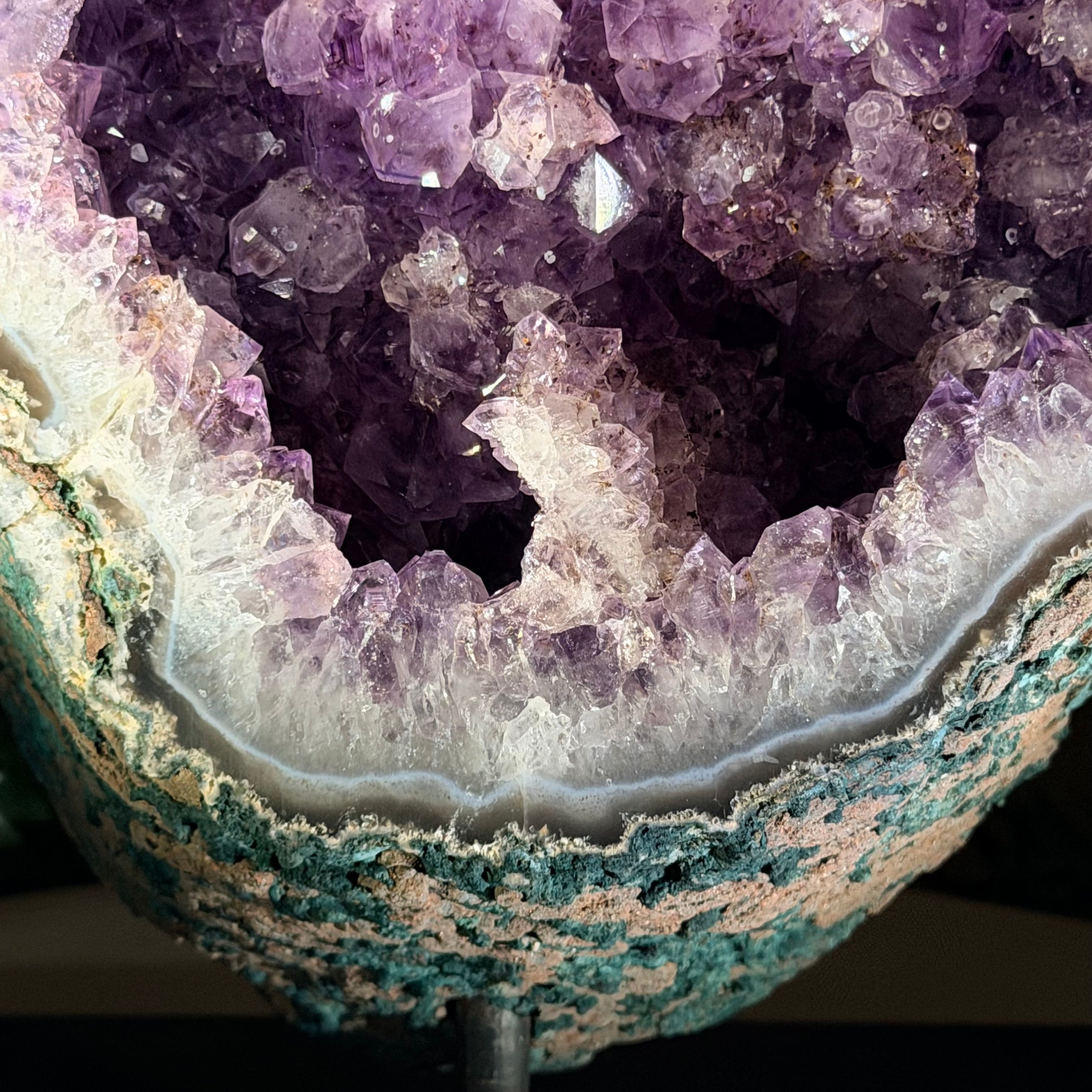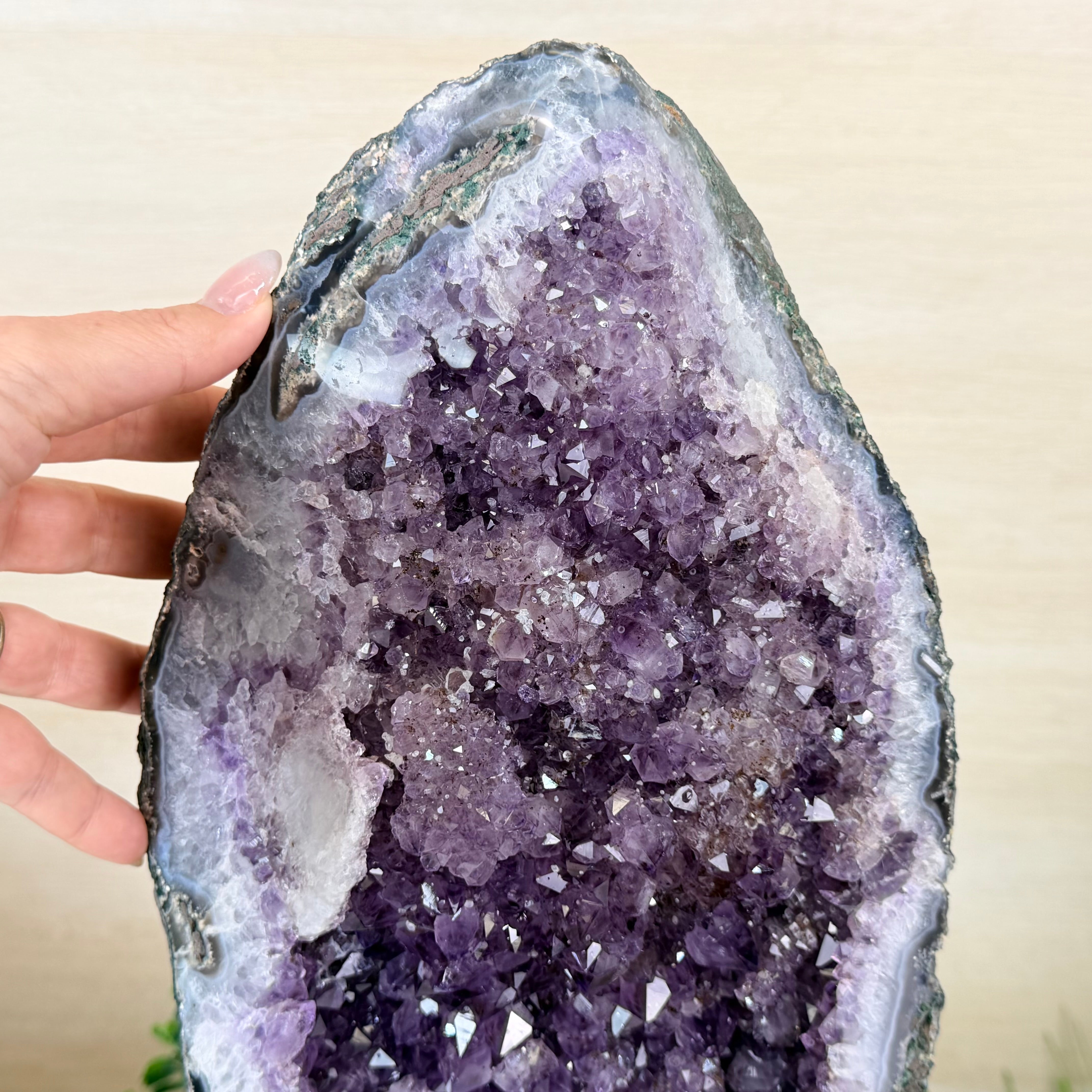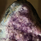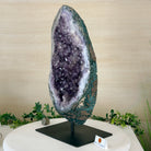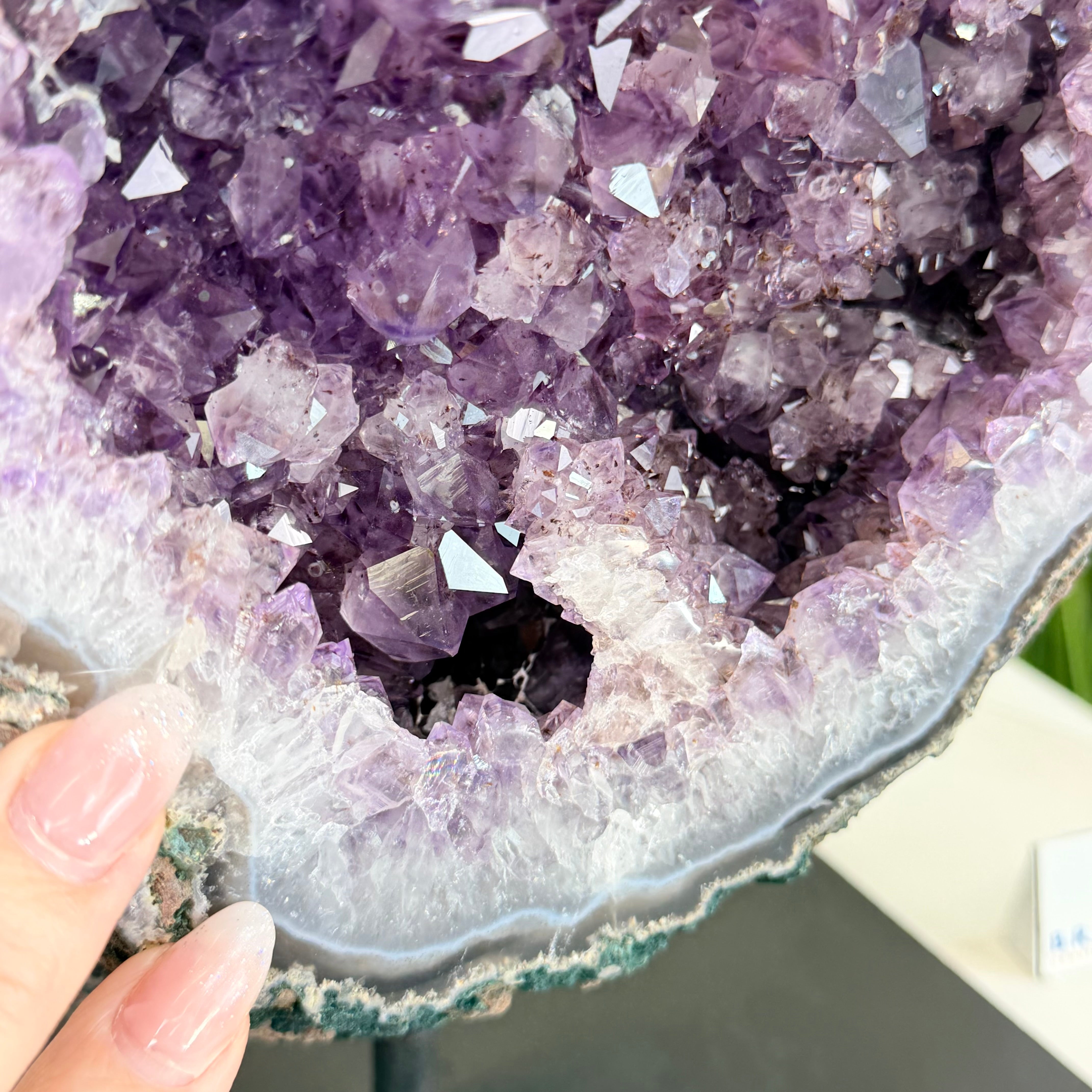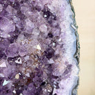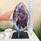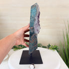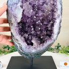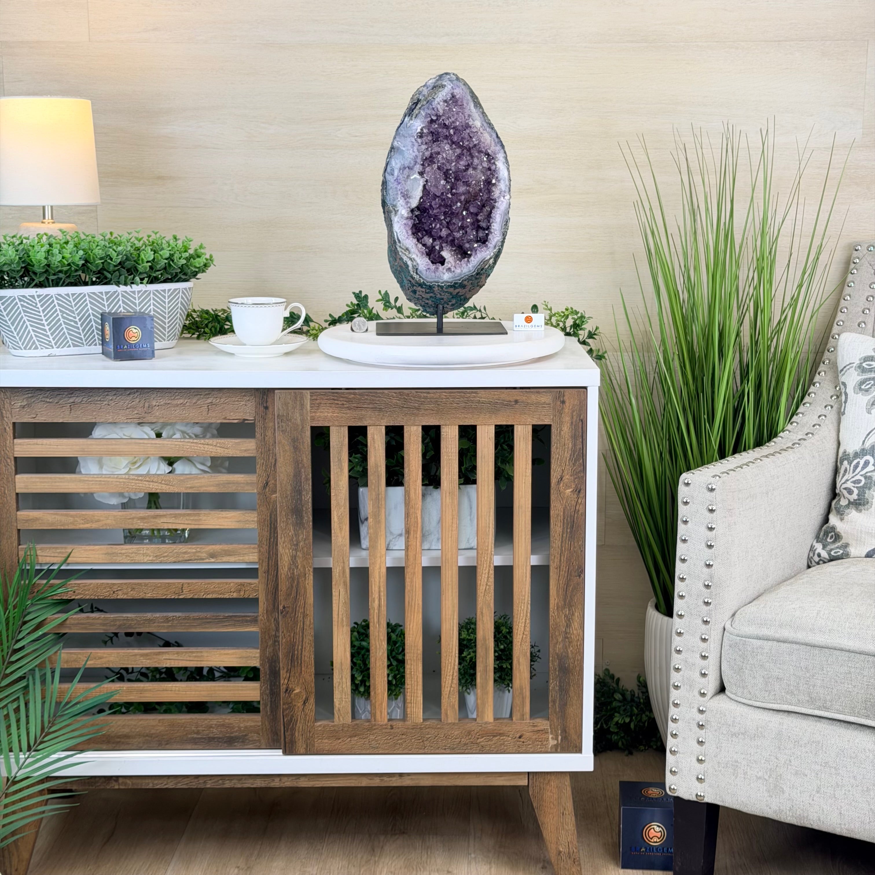 Add a touch of charm to your home or office decor with our Extra Quality Amethyst Cluster. This piece features amethyst points, polished edges and a rough natural outer shell mounted on a black metal stand (a drilled hole in the bottom of the piece allows it to mount and be upright on its stand). It's fabulous to display as a statement piece to elevate your space.