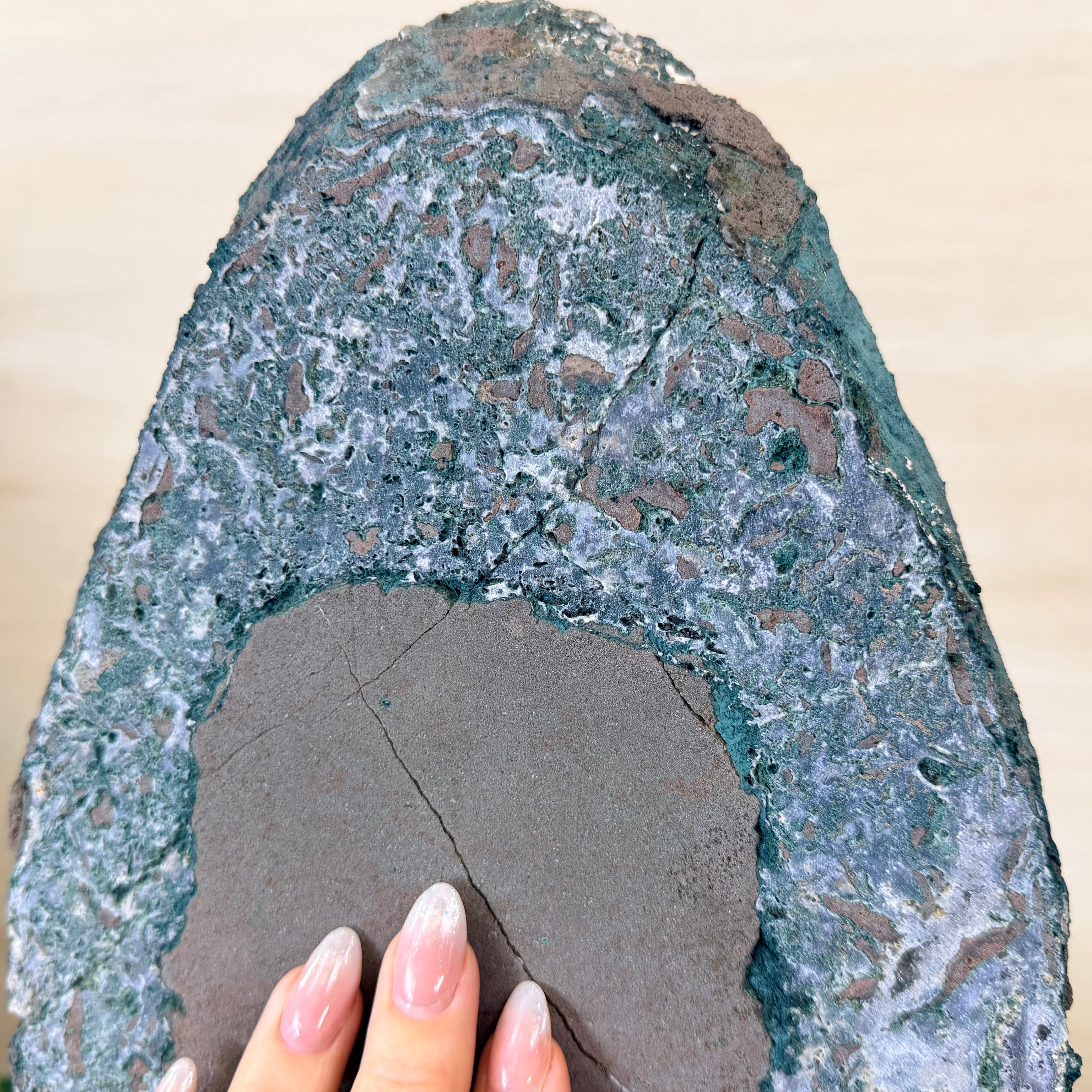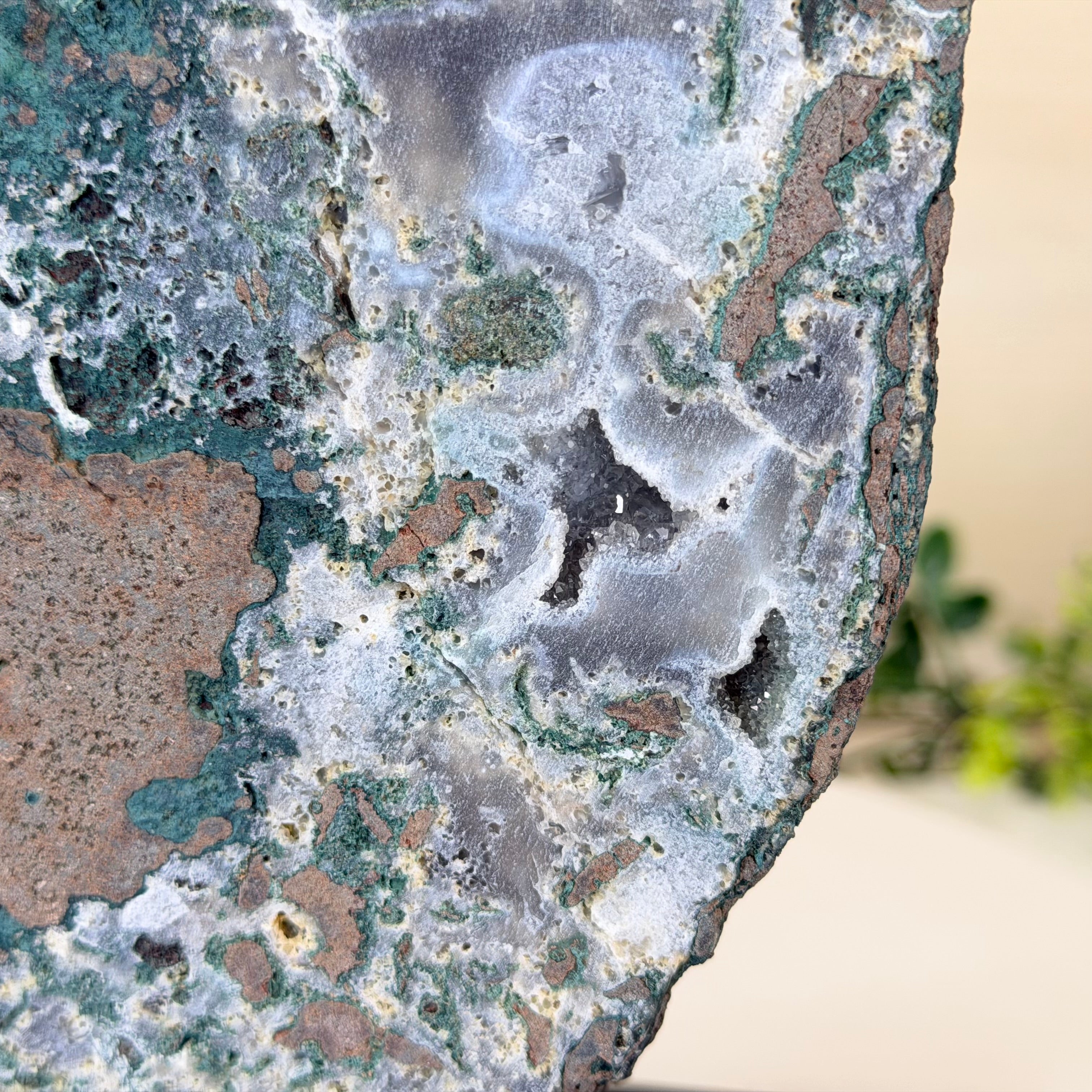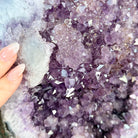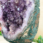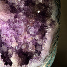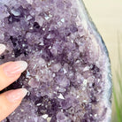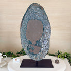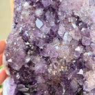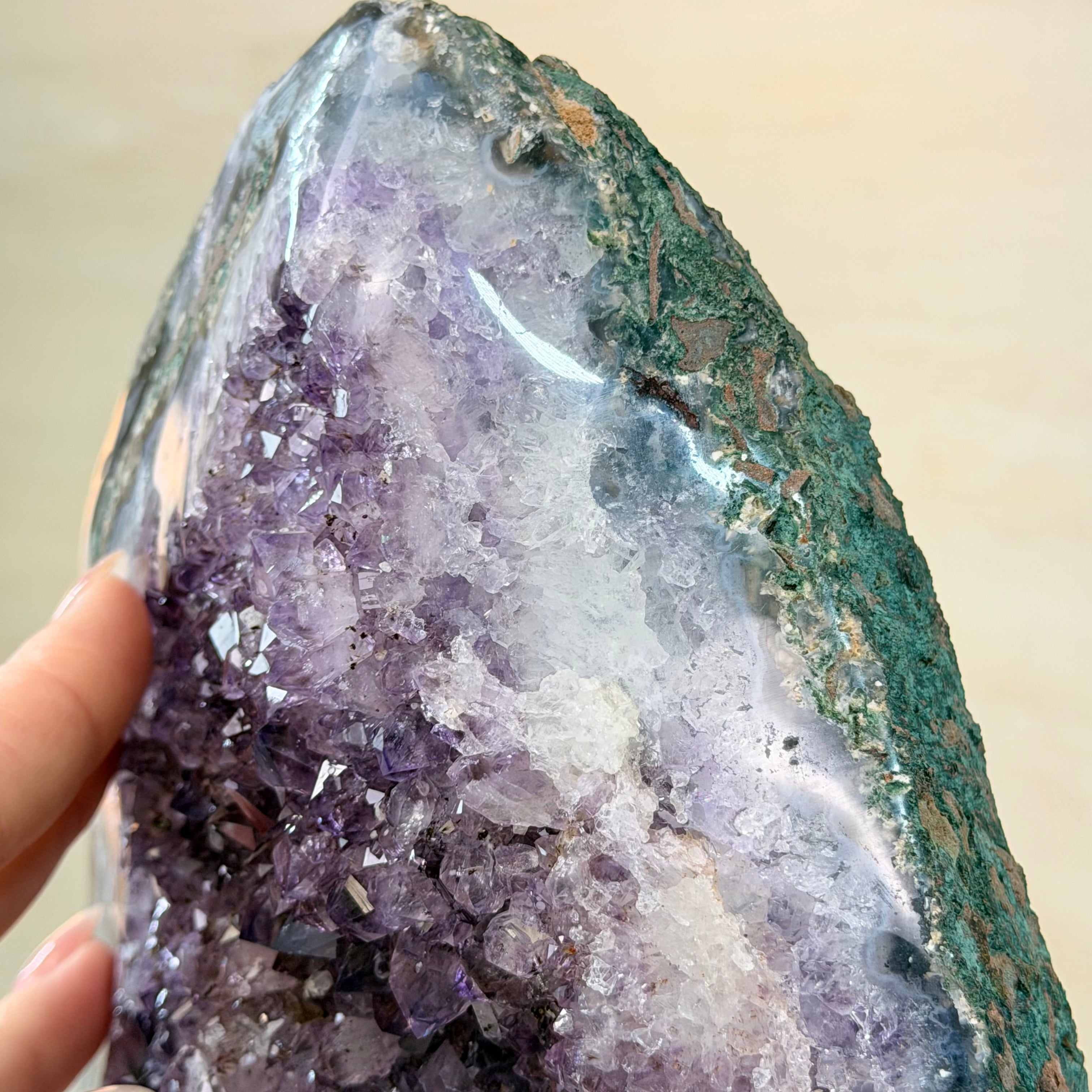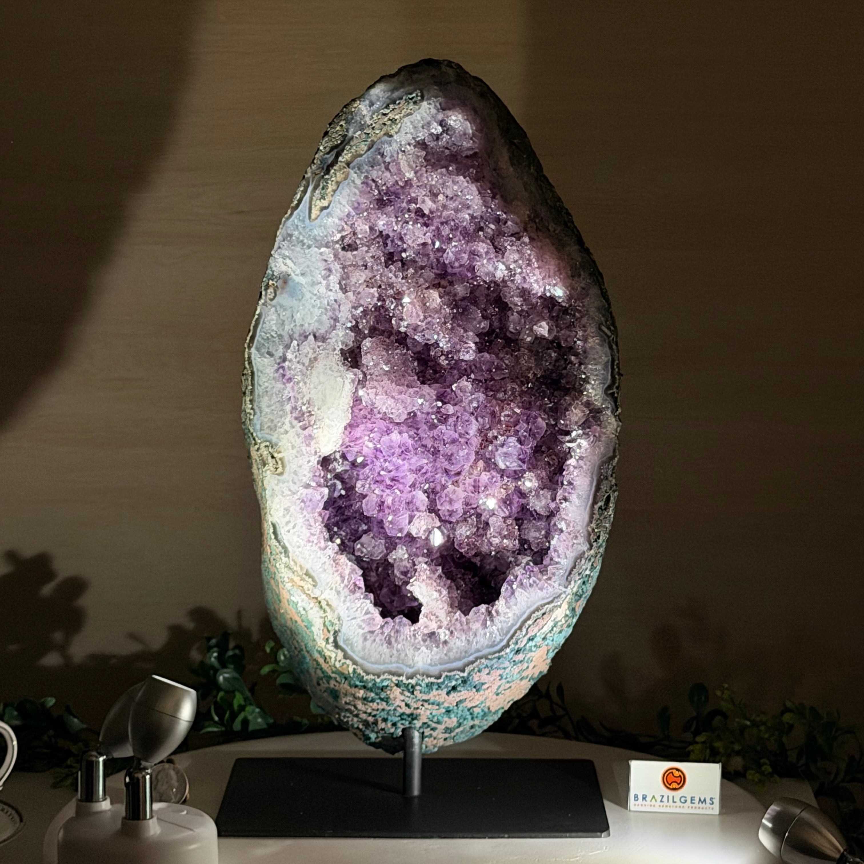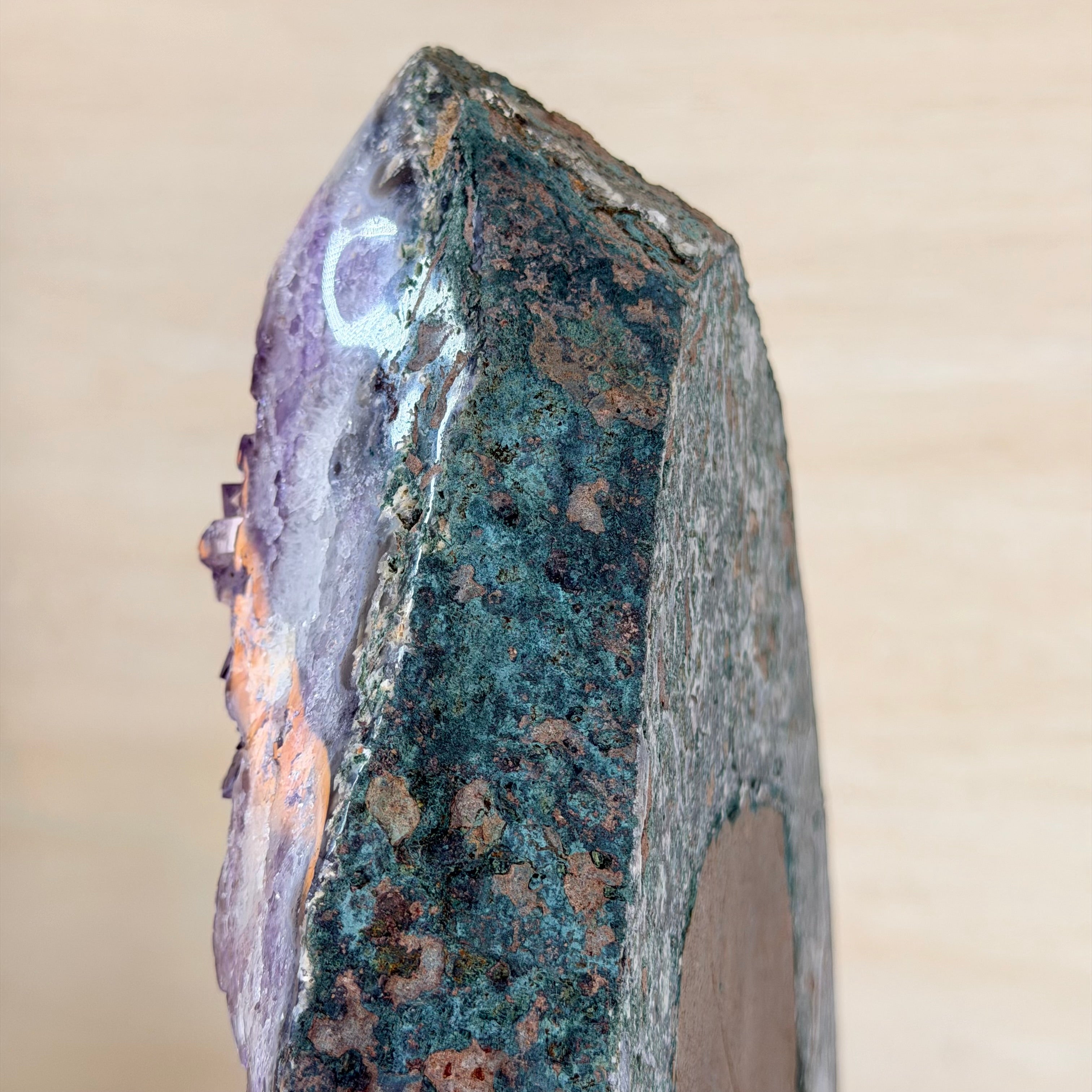 Add a touch of charm to your home or office decor with our Extra Quality Amethyst Cluster. This piece features amethyst points, polished edges and a rough natural outer shell mounted on a black metal stand (a drilled hole in the bottom of the piece allows it to mount and be upright on its stand). It's fabulous to display as a statement piece to elevate your space.