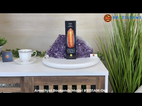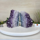 Formed from genuine Brazilian amethyst geodes, these Amethyst Crystal bookends showcase sparkling drusy crystal points across the front, with interior sides and bases polished smooth for balance and stability. Each pair highlights amethyst’s natural purple hues, blending raw crystal beauty with refined craftsmanship.
