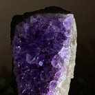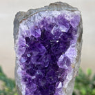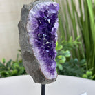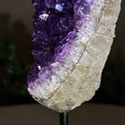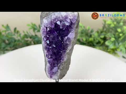 Infuse your room with the natural elegance of this Small Extra Plus Quality Natural Brazilian Amethyst Cluster skewered on a black metal base from Brazil Gems®. This gemstone has deep purple amethyst points with rough edges. Its outer shell is the natural basalt rock.