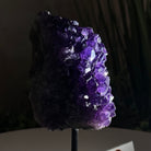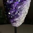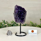 Infuse your room with the natural elegance of this Small Extra Plus Quality Natural Brazilian Amethyst Cluster skewered on a black metal base from Brazil Gems®. This gemstone has deep purple amethyst points with rough edges. Its outer shell is the natural basalt rock.