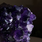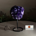Infuse your room with the natural elegance of this Small Extra Plus Quality Natural Brazilian Amethyst Cluster skewered on a black metal base from Brazil Gems®. This gemstone has deep purple amethyst points with rough edges. Its outer shell is the natural basalt rock.