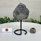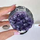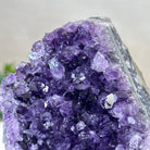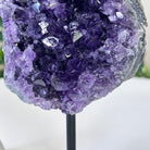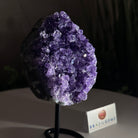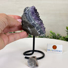 Infuse your room with the natural elegance of this Small Extra Plus Quality Natural Brazilian Amethyst Cluster skewered on a black metal base from Brazil Gems®. This gemstone has deep purple amethyst points with rough edges. Its outer shell is the natural basalt rock.