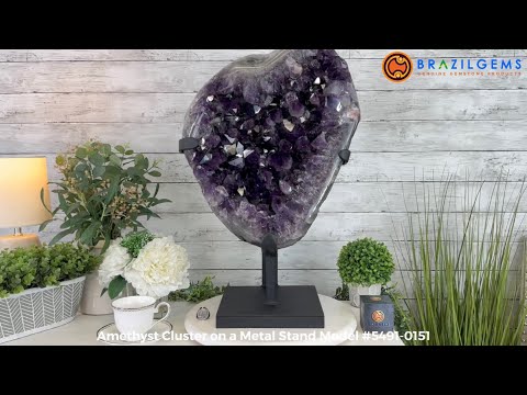 Infuse your room with the natural elegance of this Extra Plus Quality Natural Brazilian Amethyst Cluster on a black metal base from Brazil Gems®. This gemstone has deep purple amethyst points with lovely agate bands surrounding it. It is polished in the front with a natural rough outer shell.