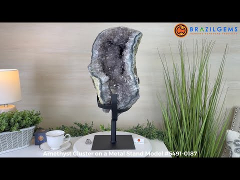 Infuse your room with the natural elegance of this Extra Quality Natural Brazilian Amethyst Cluster on a black metal base from Brazil Gems®. This gemstone has purple amethyst points with lovely agate bands along the edges. It is polished in the edges with a natural rough outer shell.