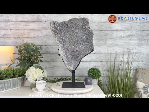 Infuse your room with the natural elegance of this Extra Quality Natural Brazilian White Amethyst Cluster on a black metal base from Brazil Gems®. This gemstone has sparkling amethyst points with rough edges. The back is also natural basalt stone.