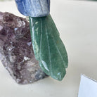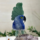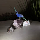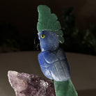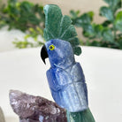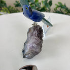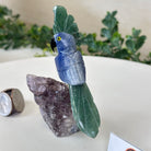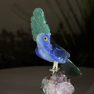 Marvel at our exquisite hand-carved X-Small Size Cockatoo gemstone bird perched on a captivating Amethyst cluster base, a harmonious blend of nature, art, and elegance. Crafted from premium Blue Quartz for its body, Black Onyx for its beak, Green Quartz for its crest and its tail and adorned with cute little metal feet, this stunning sculpture captures the essence of nature's beauty.