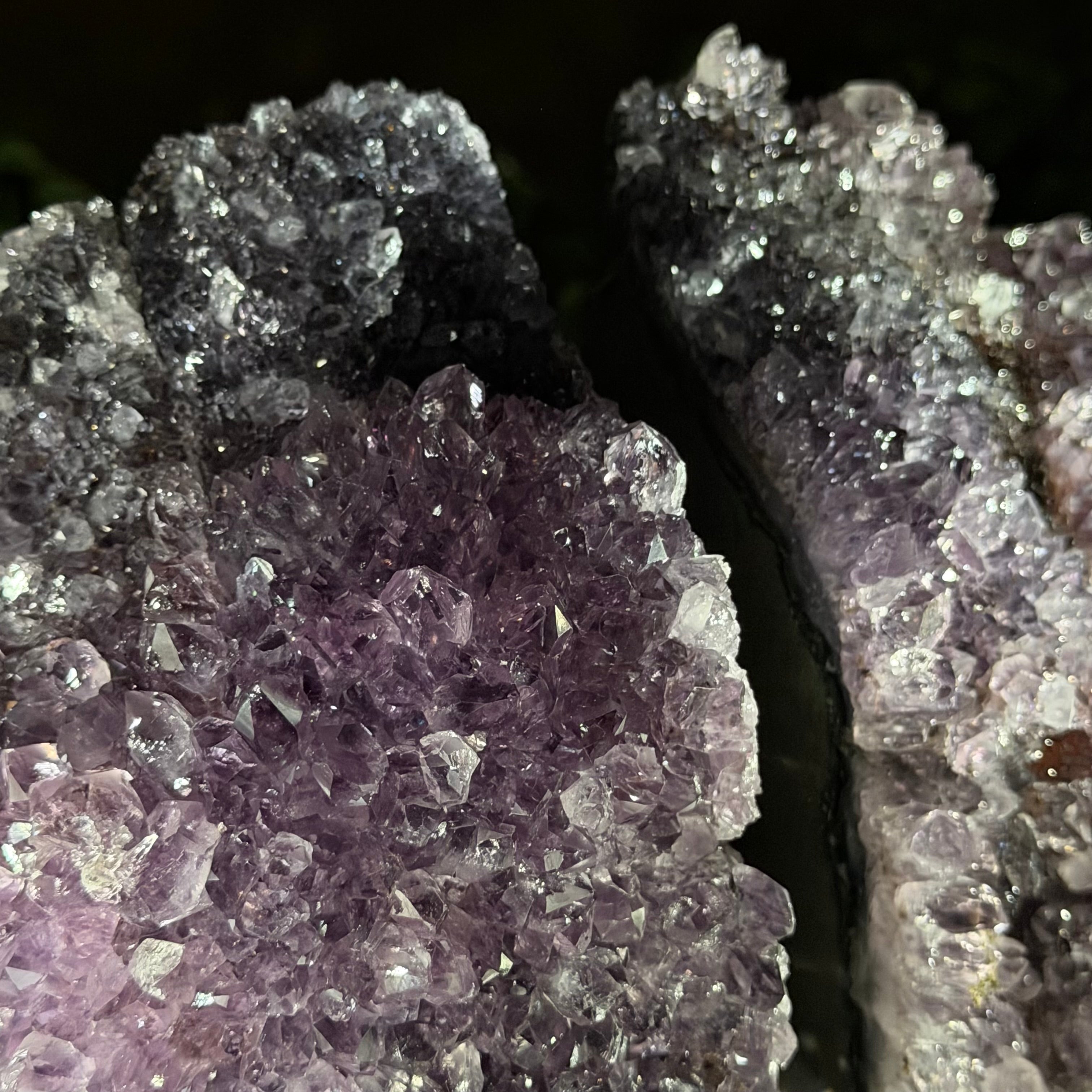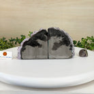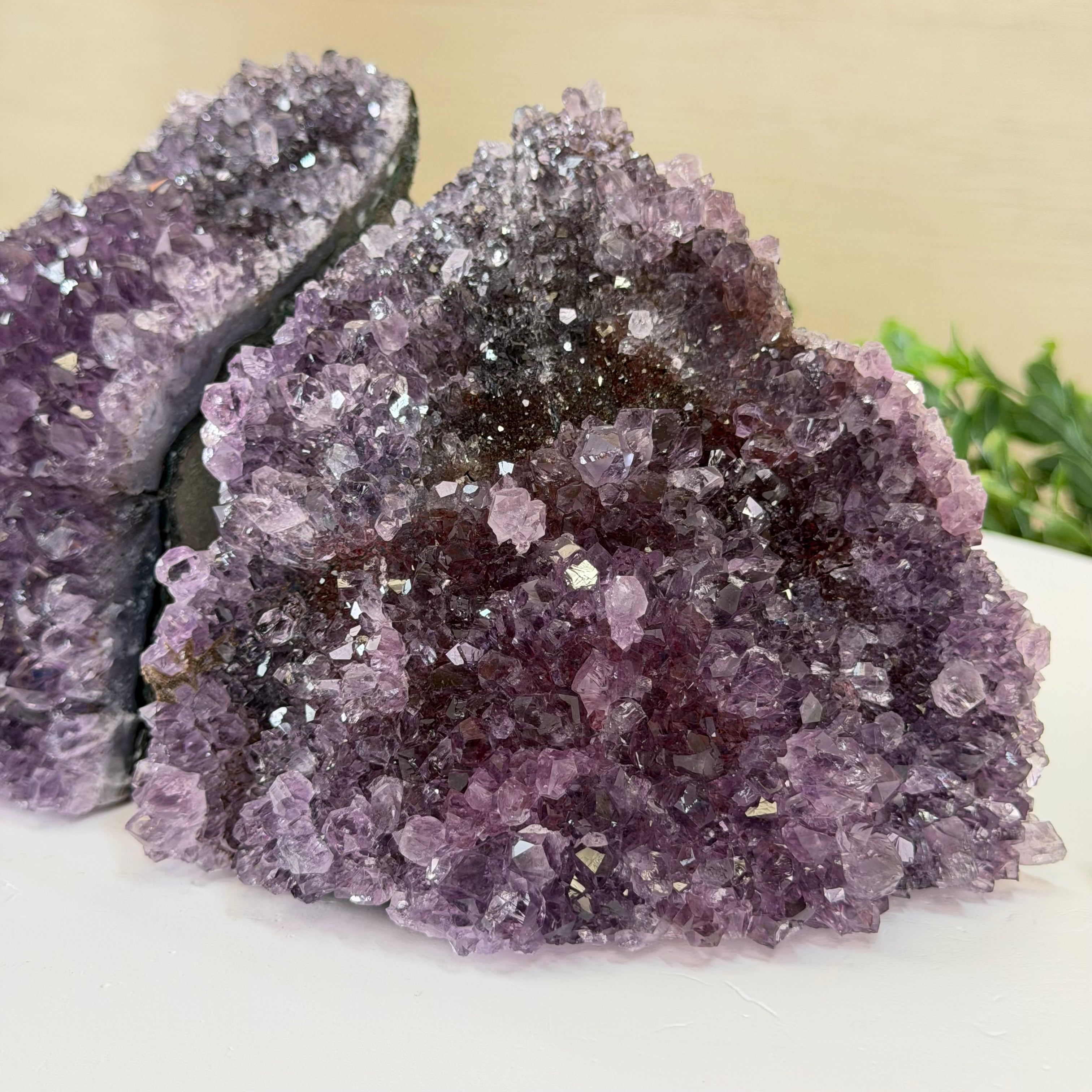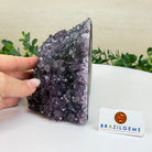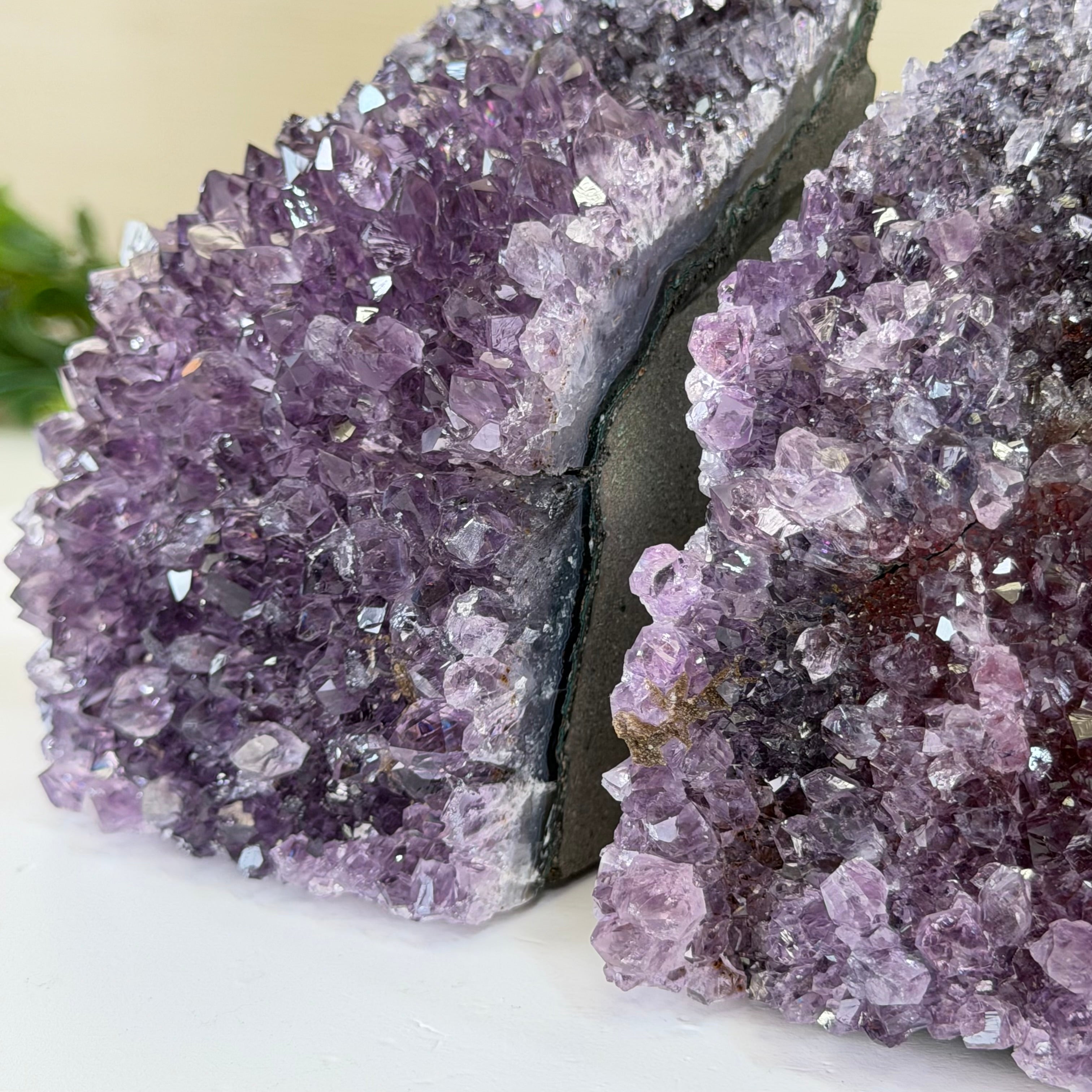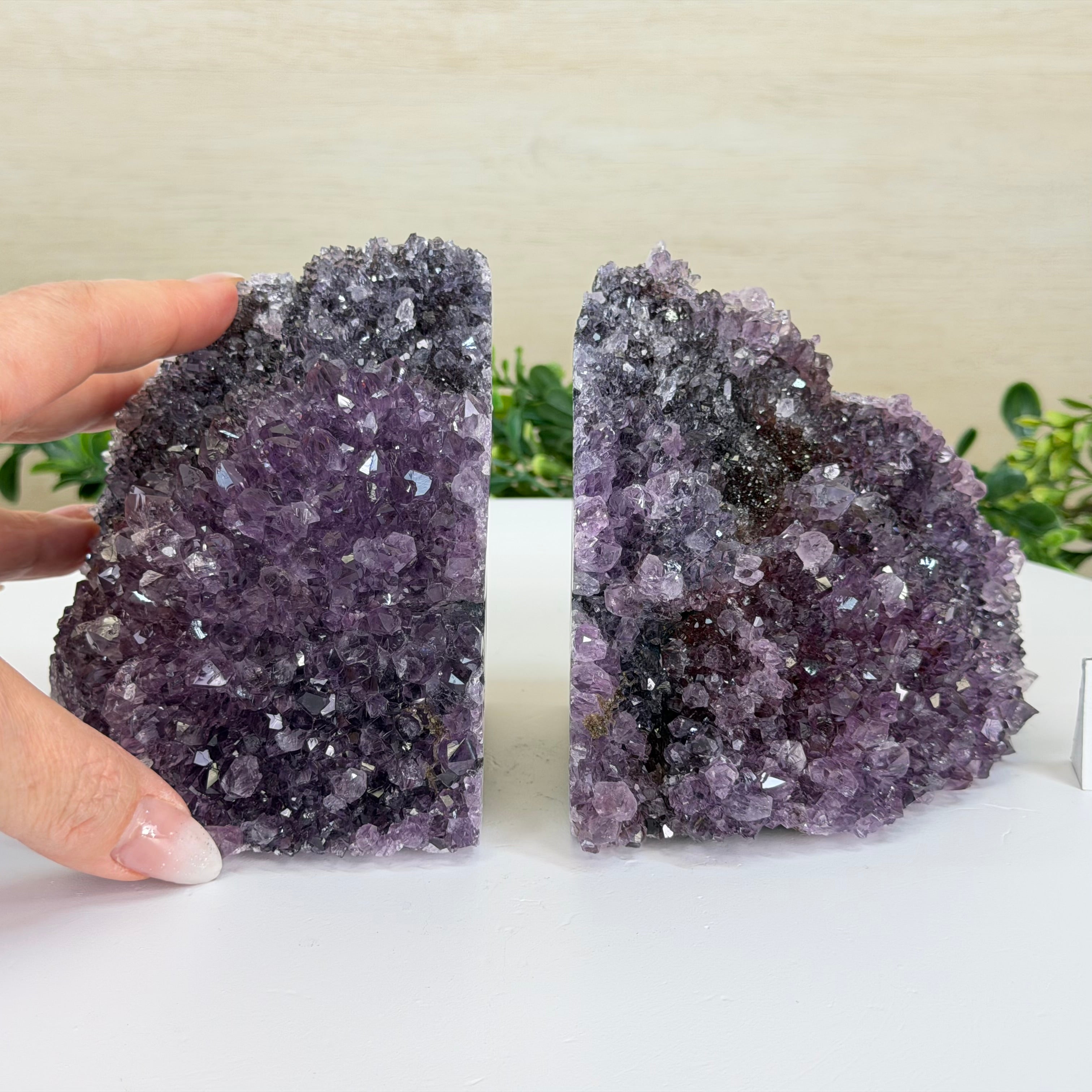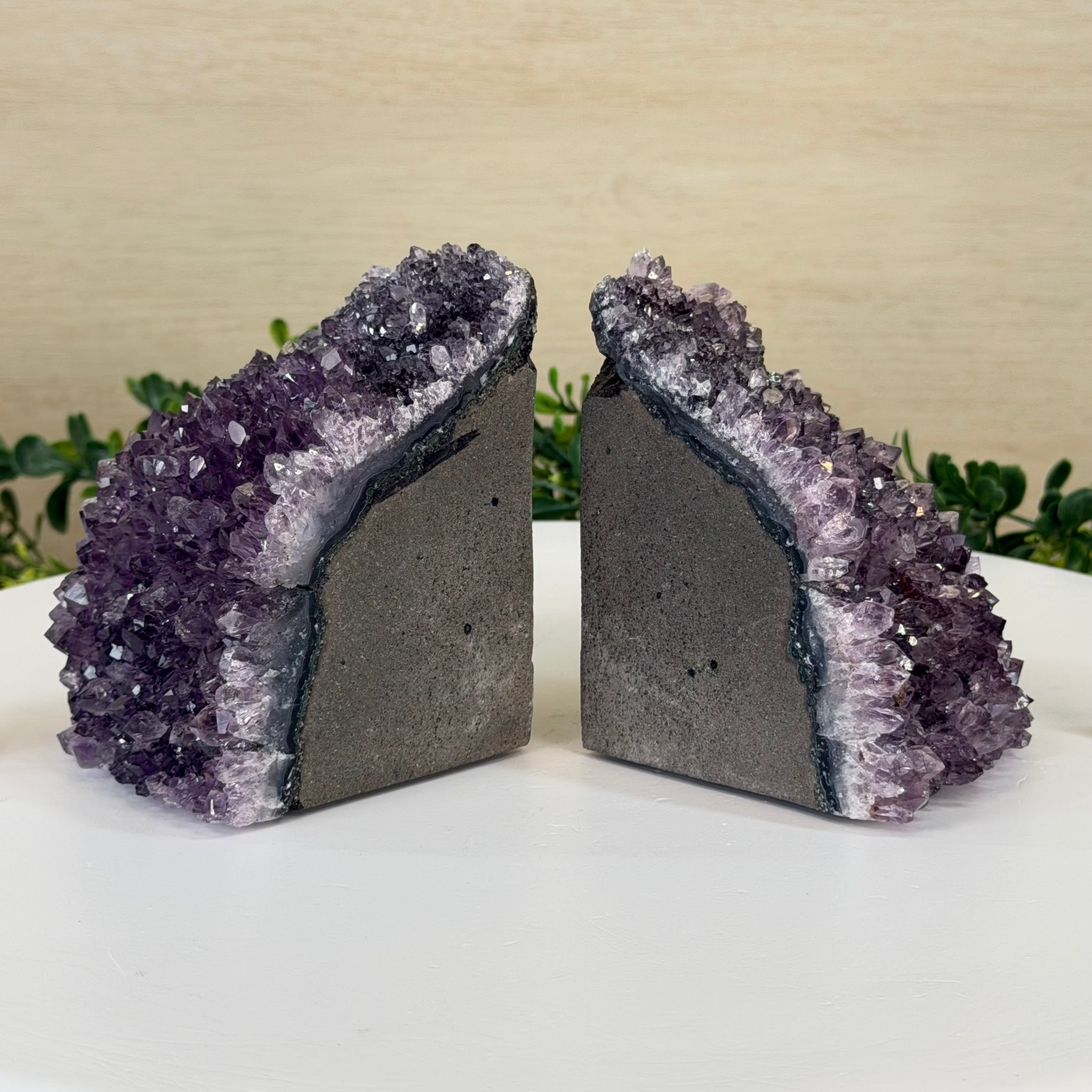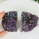 Formed from genuine Brazilian amethyst geodes, these Amethyst Crystal bookends showcase sparkling drusy crystal points across the front, with interior sides and bases polished smooth for balance and stability. This pair highlights amethyst’s natural purple hues, blending raw crystal beauty with refined craftsmanship.