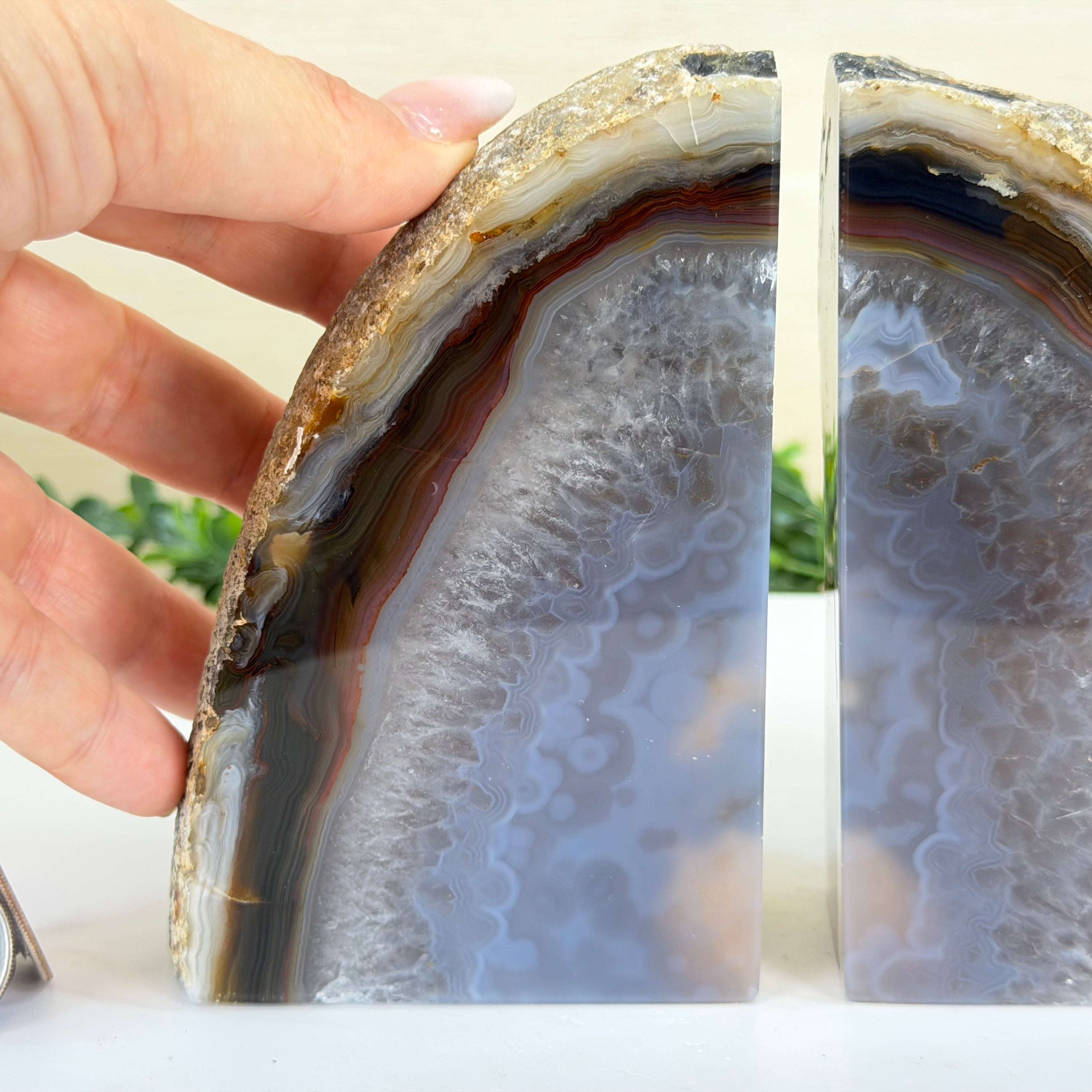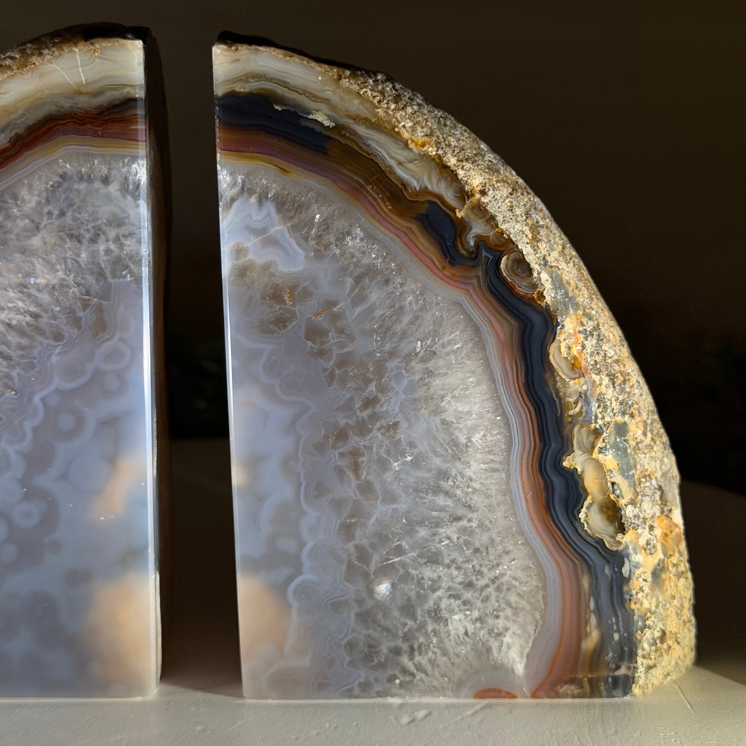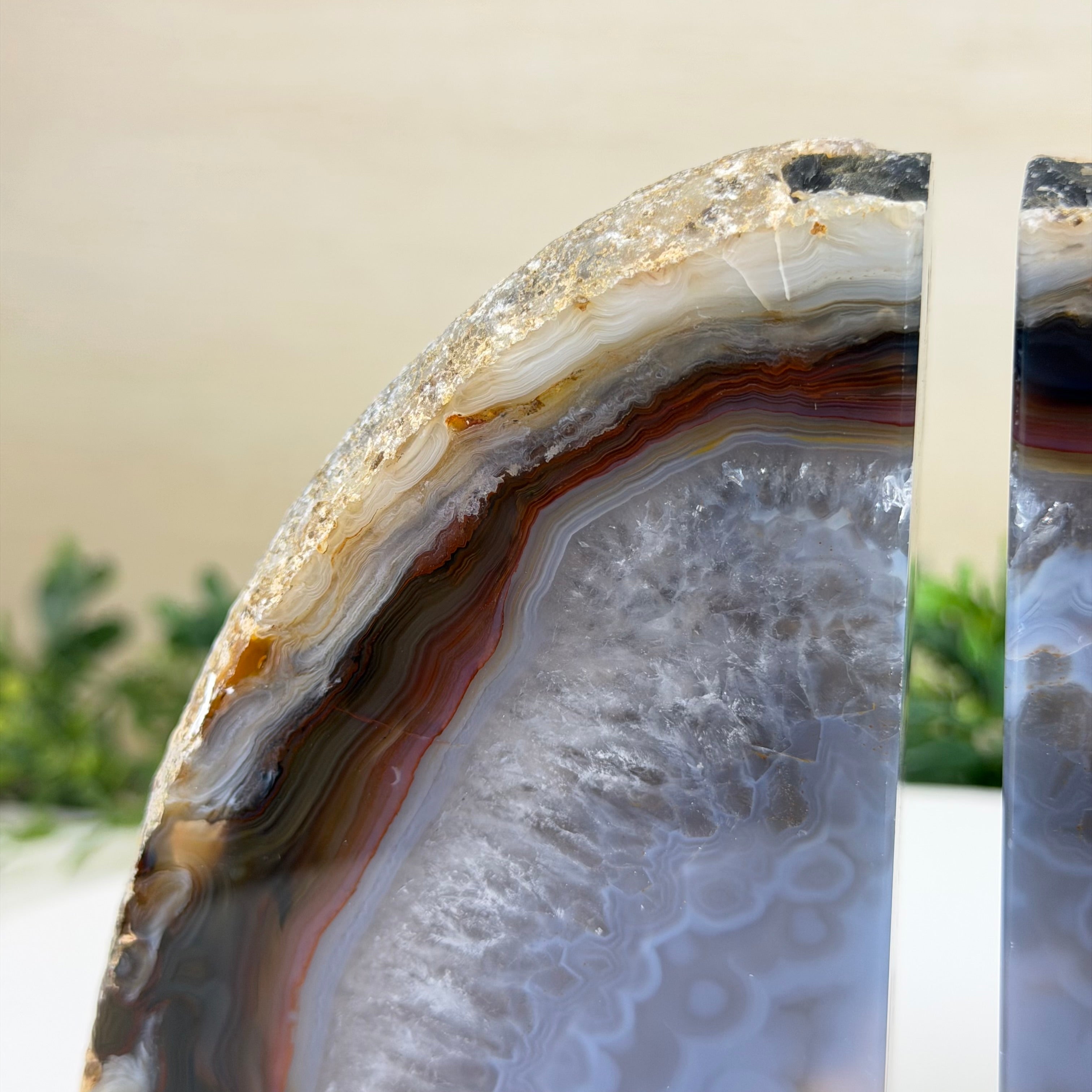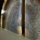Formed from genuine Brazilian Agate geodes, these Agate Crystal bookends showcase sparkling white crystals surrounded by colorful Agate bands across the front. With interior sides and bottom polished smooth for balance and stability. This pair highlights Agate's natural tones, blending raw crystal beauty with refined craftsmanship.