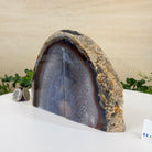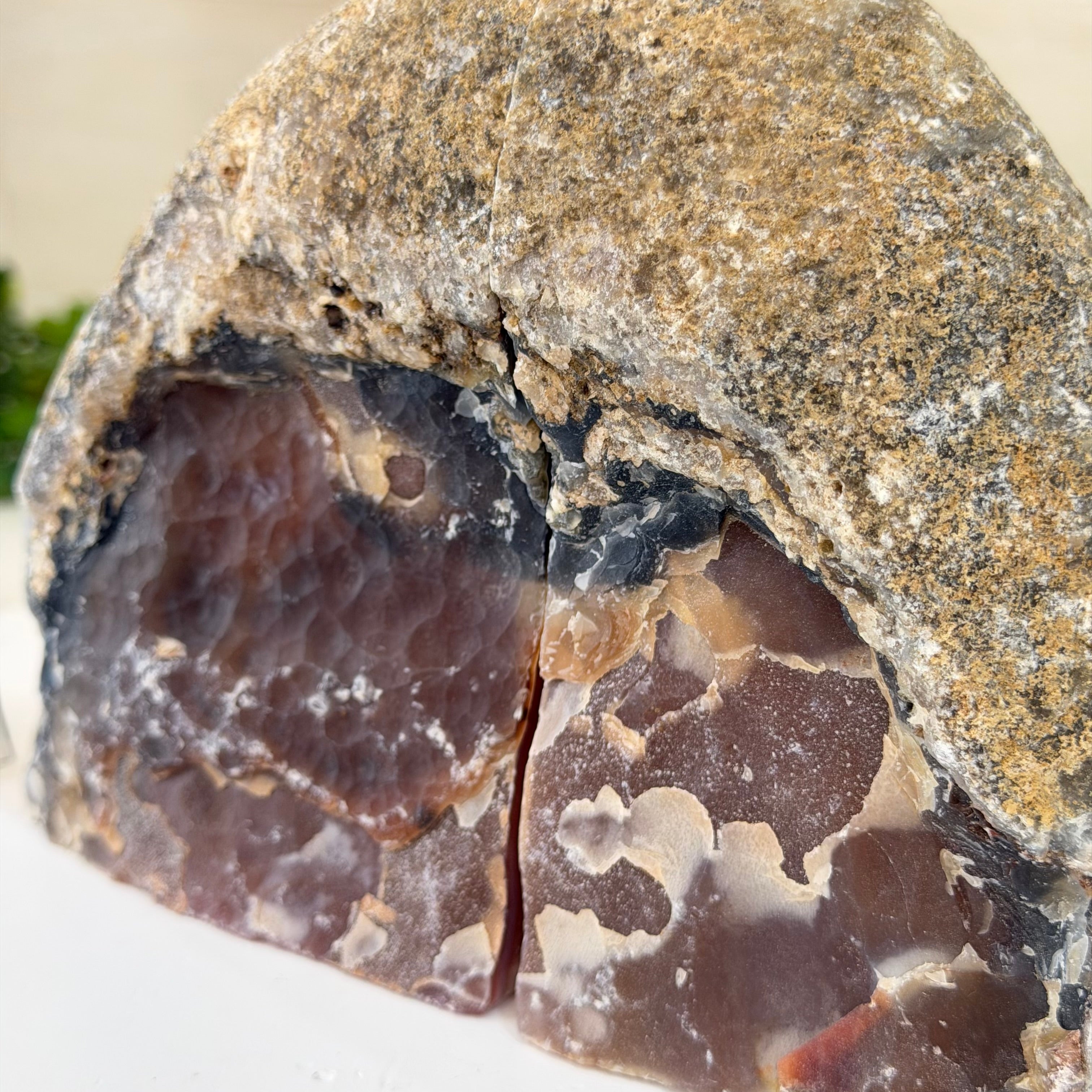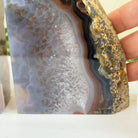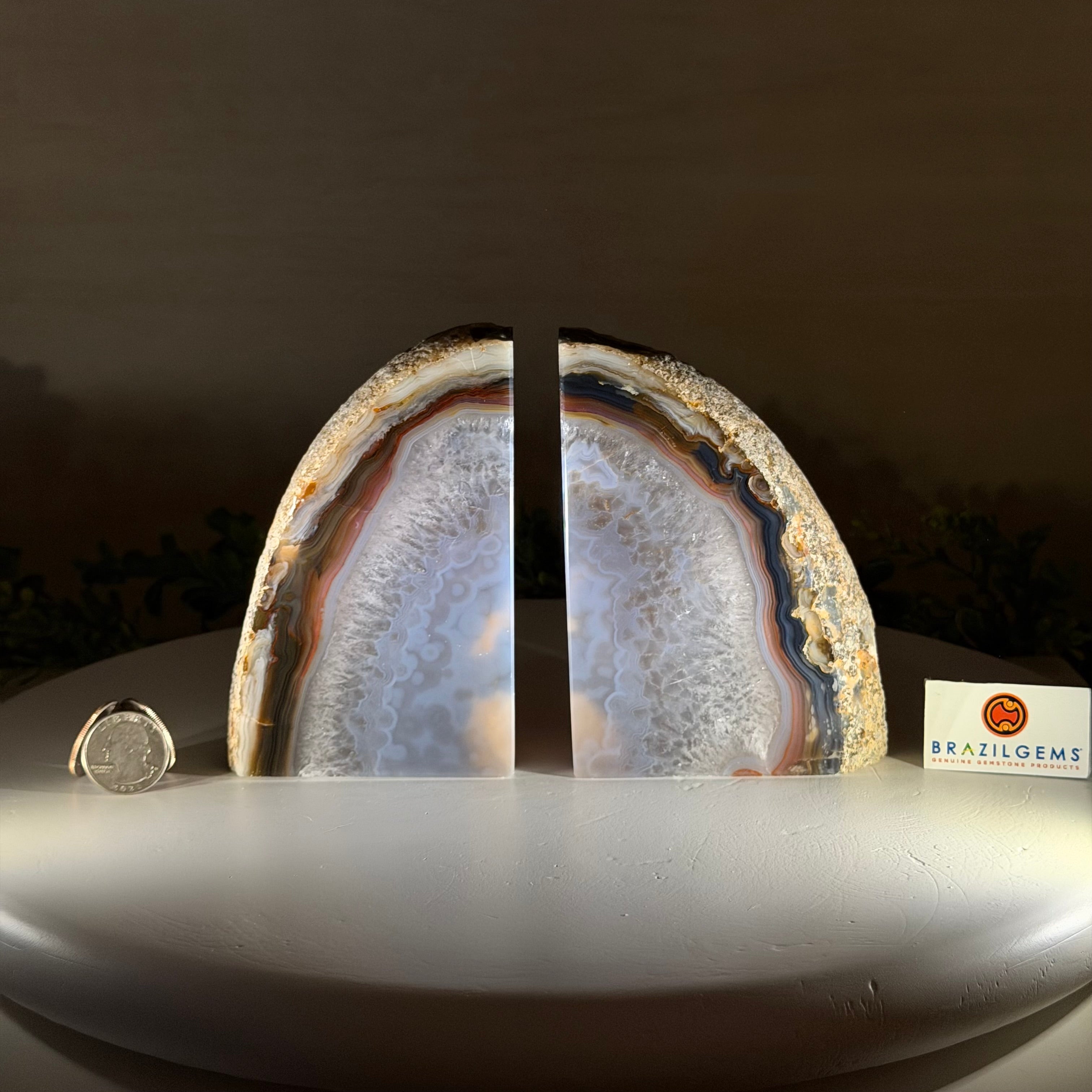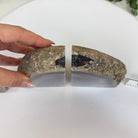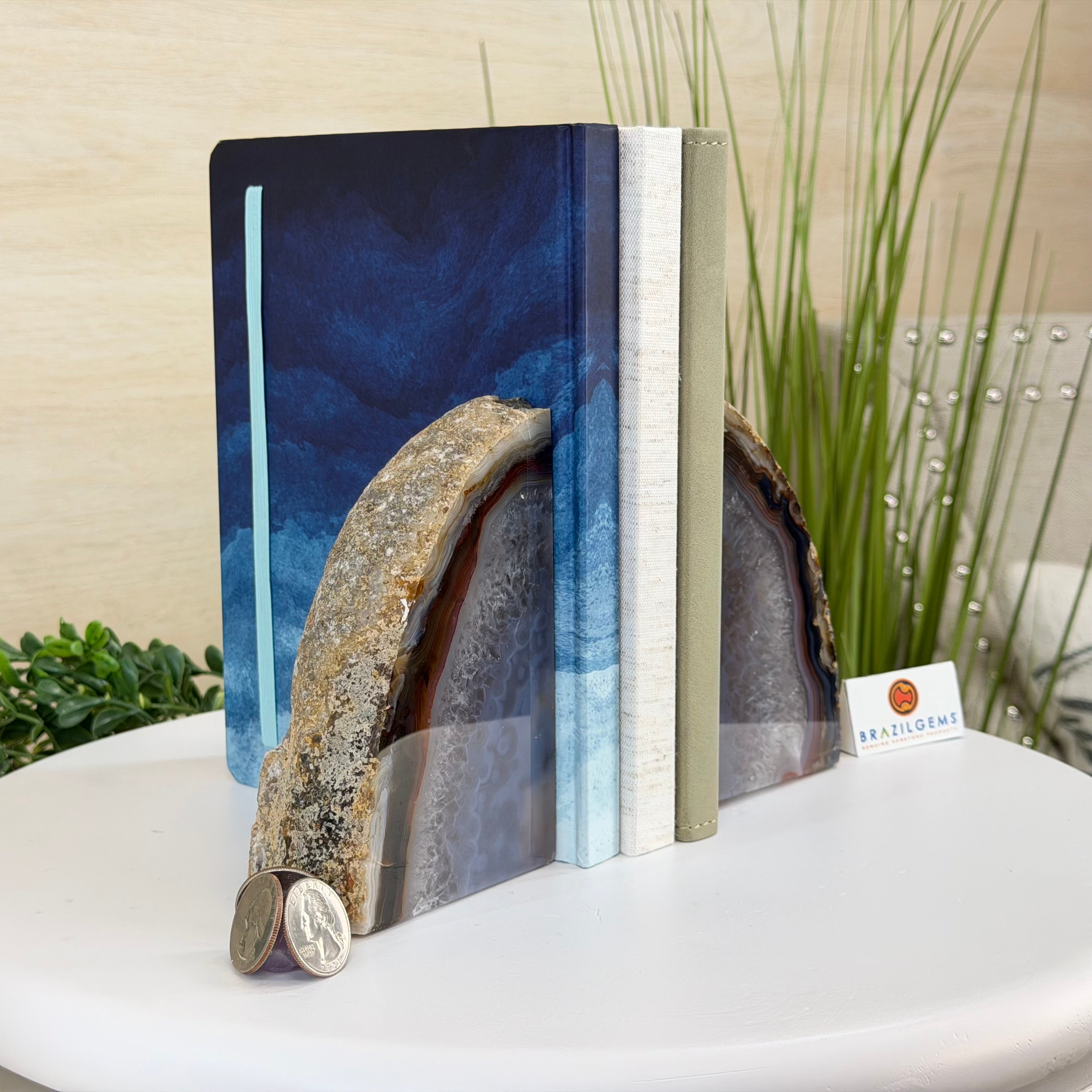 Formed from genuine Brazilian Agate geodes, these Agate Crystal bookends showcase sparkling white crystals surrounded by colorful Agate bands across the front. With interior sides and bottom polished smooth for balance and stability. This pair highlights Agate's natural tones, blending raw crystal beauty with refined craftsmanship.