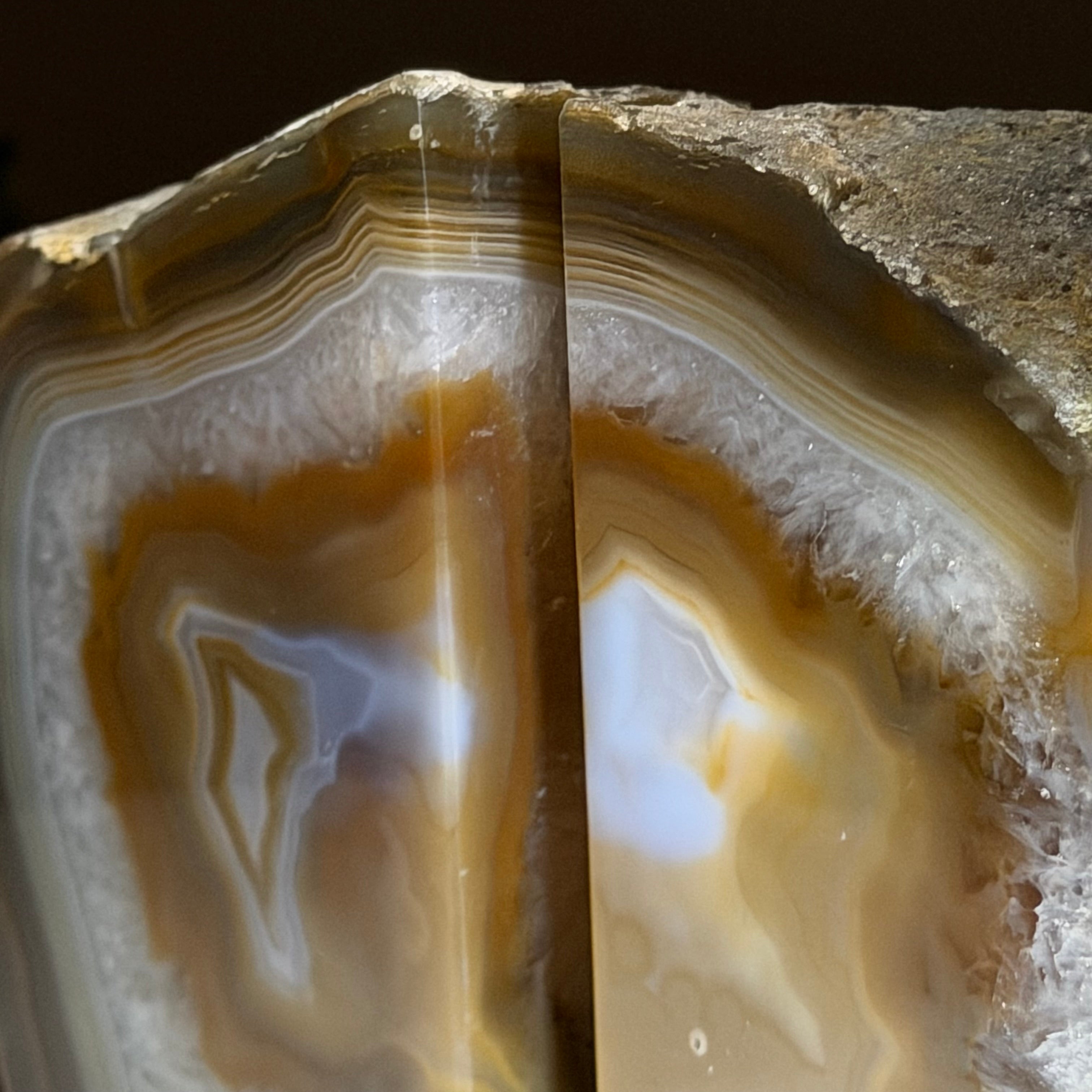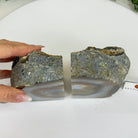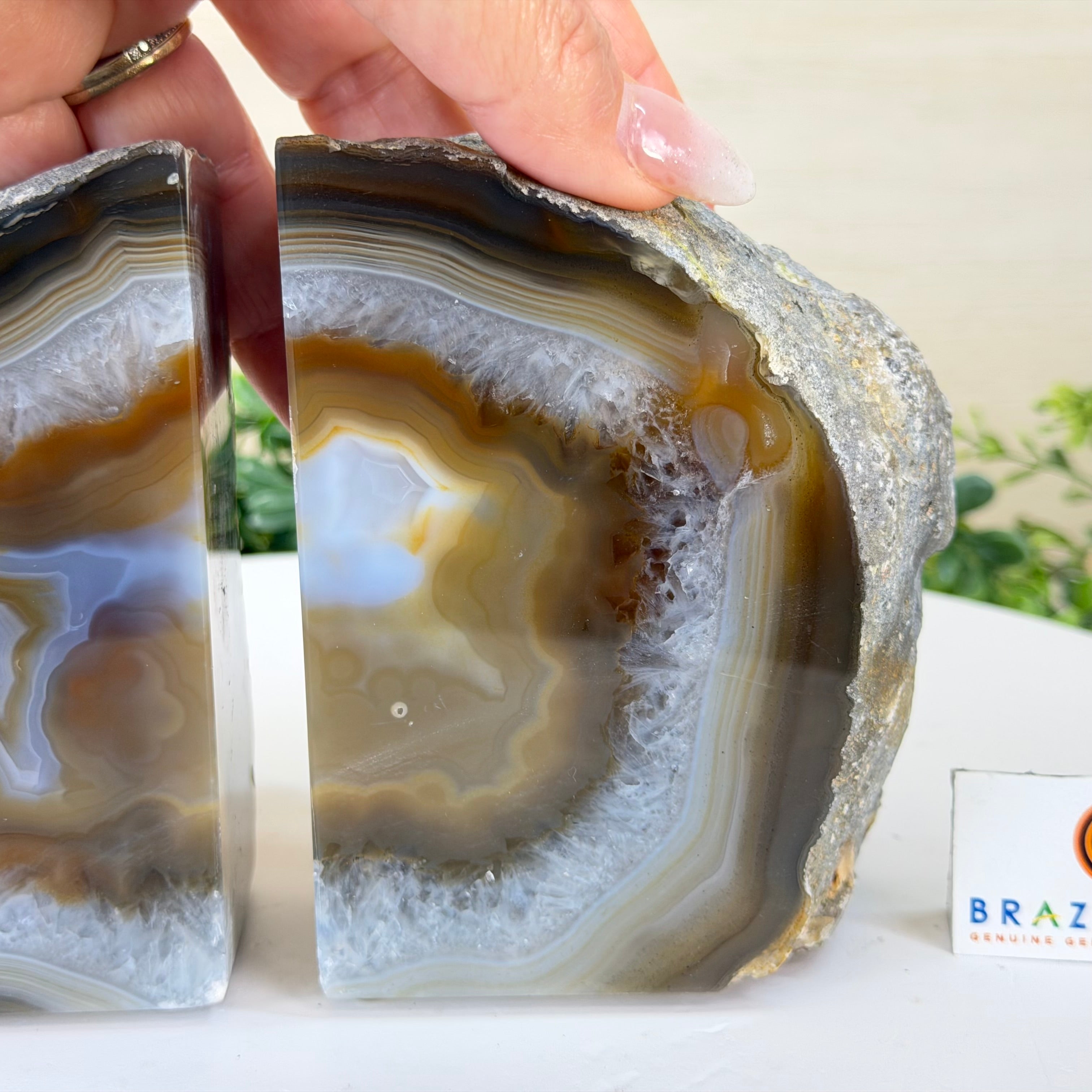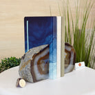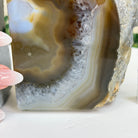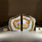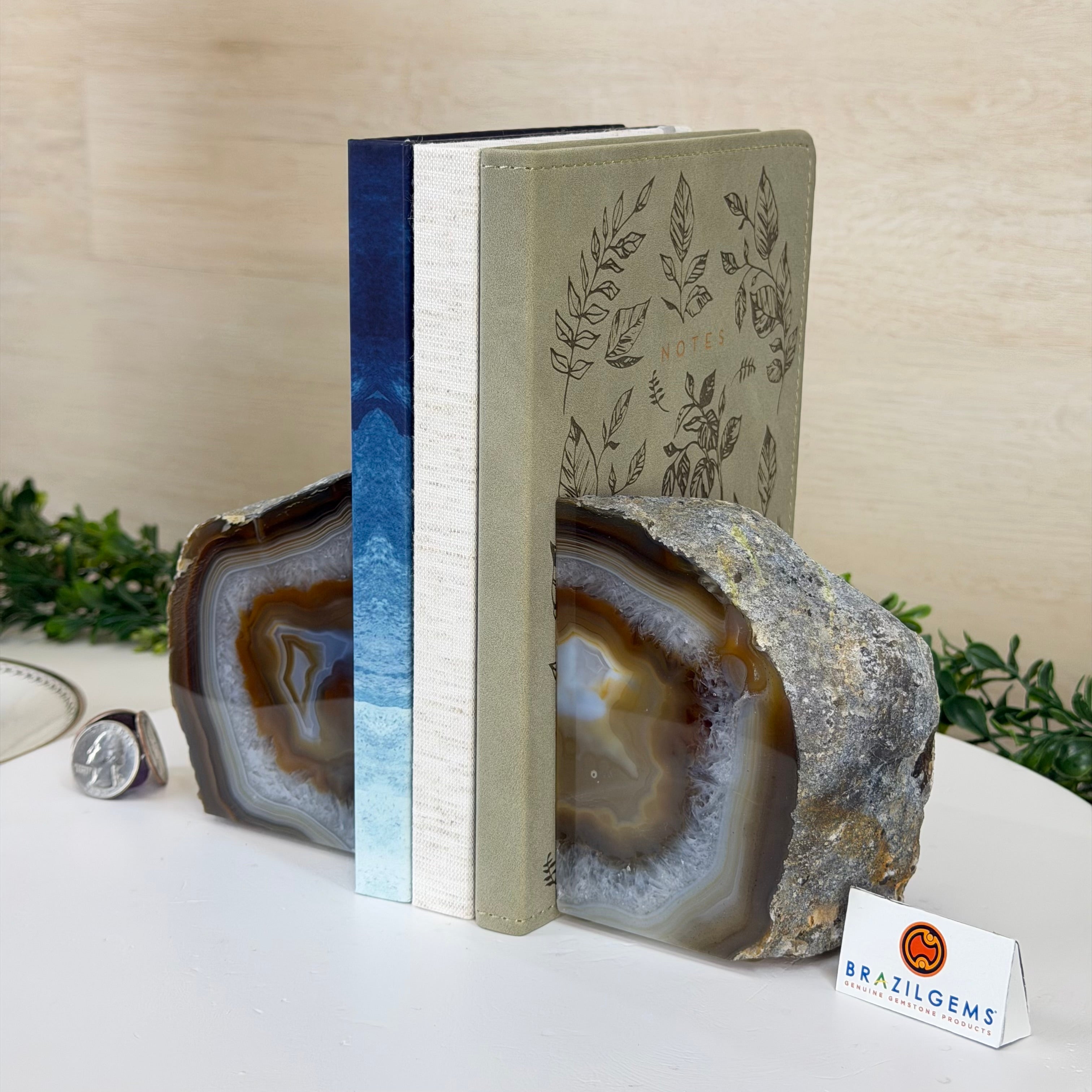 Formed from genuine Brazilian Agate geodes, these Agate Crystal bookends showcase sparkling white crystals surrounded by colorful Agate bands across the front. With interior sides and bottom polished smooth for balance and stability. This pair highlights Agate's natural tones, blending raw crystal beauty with refined craftsmanship.