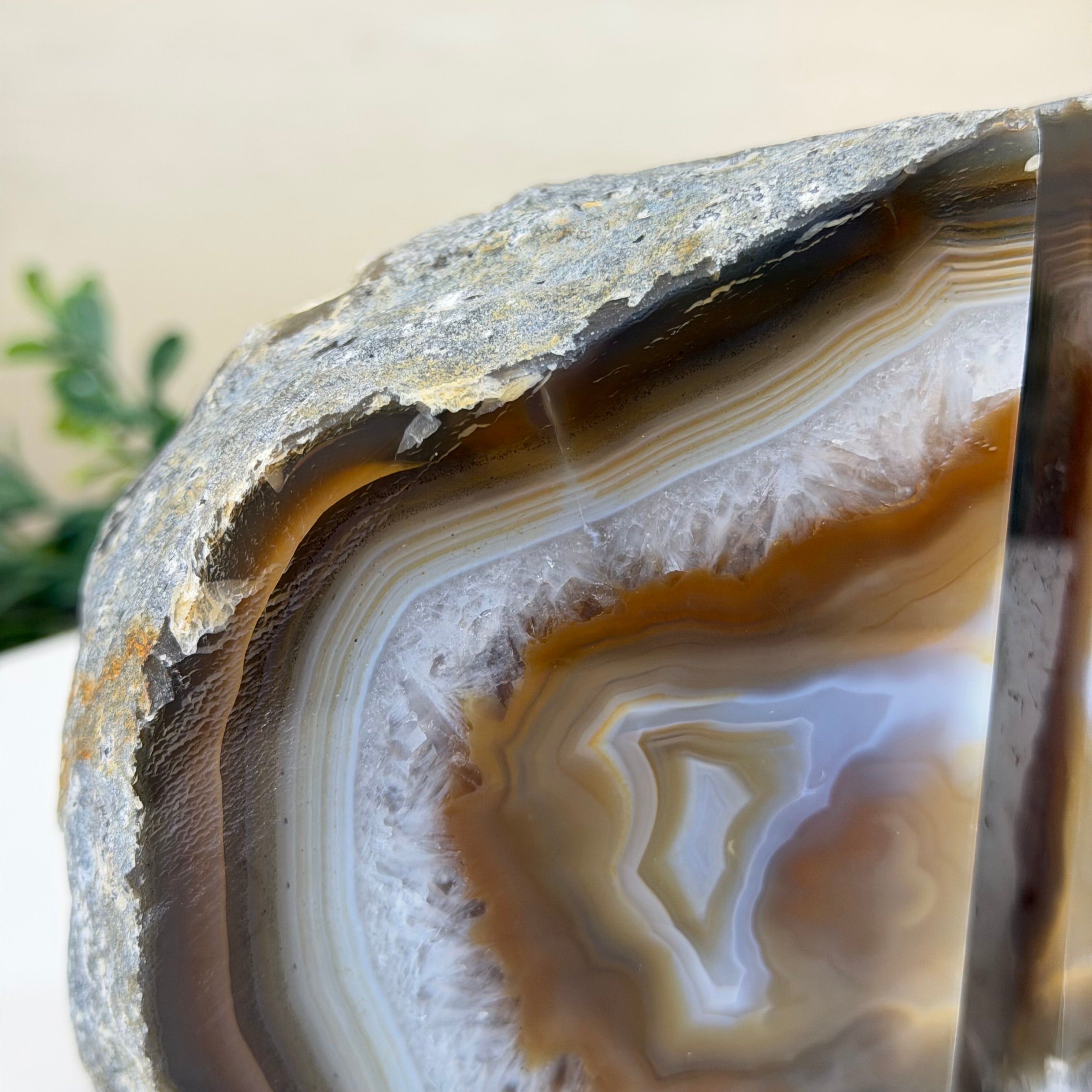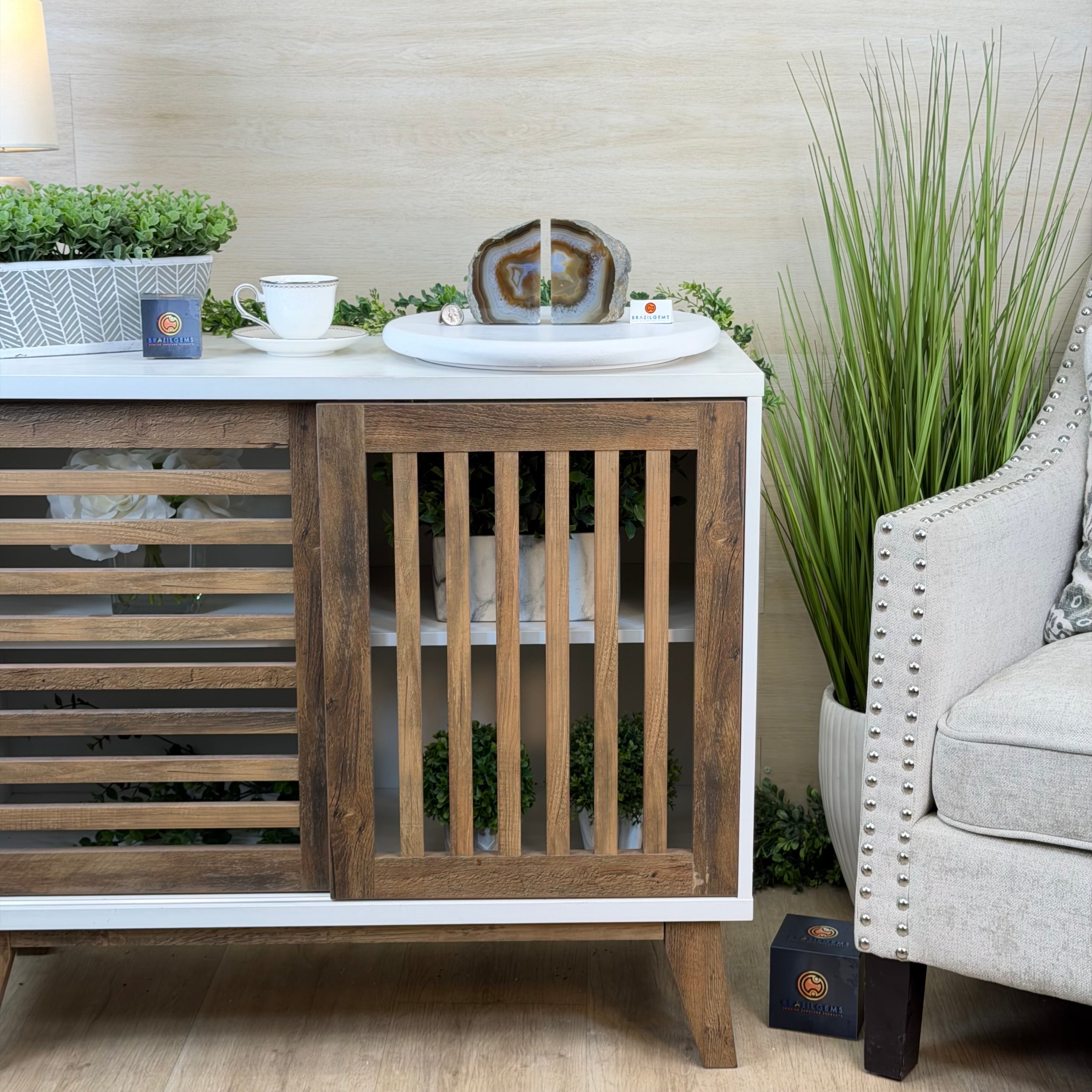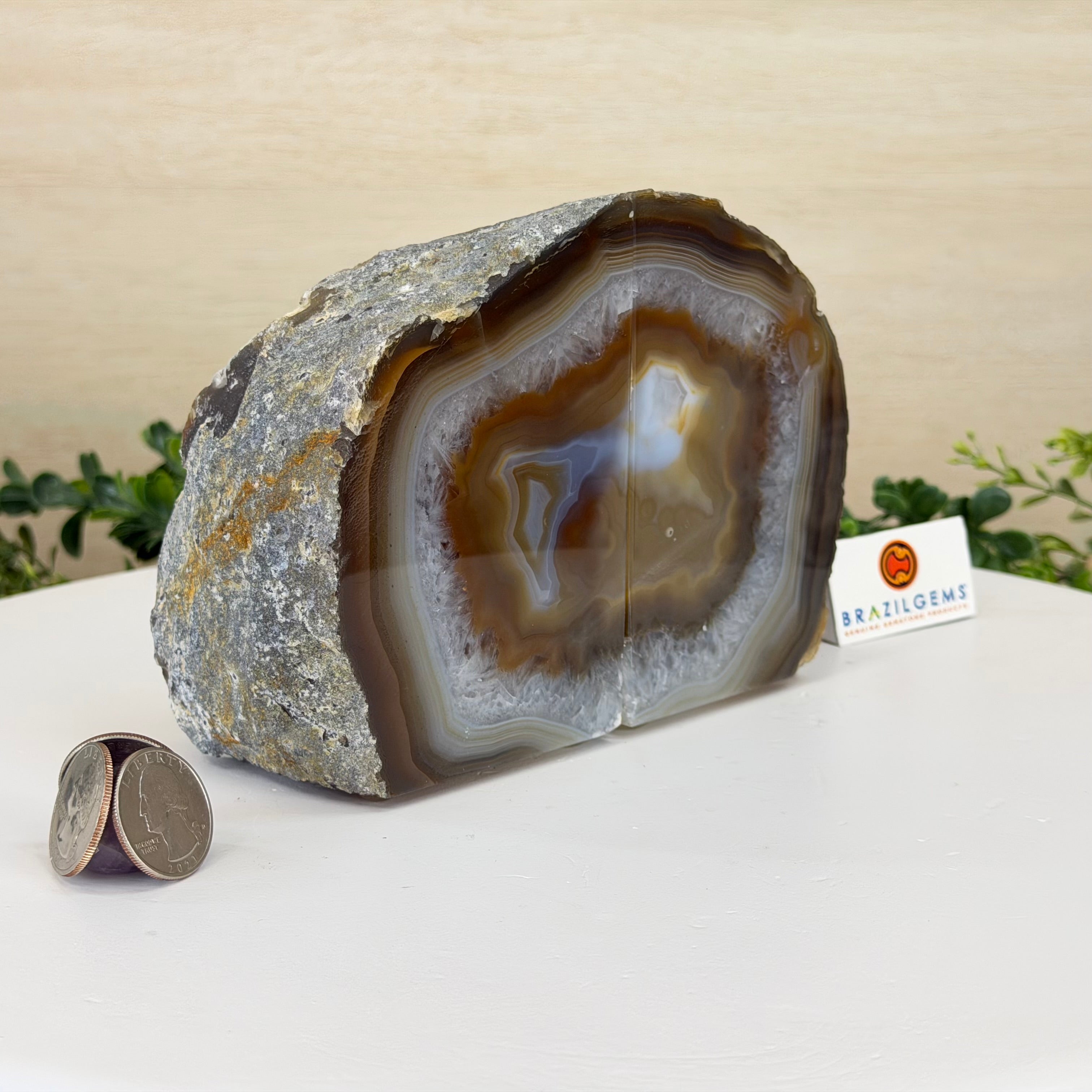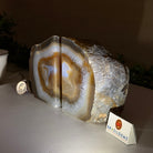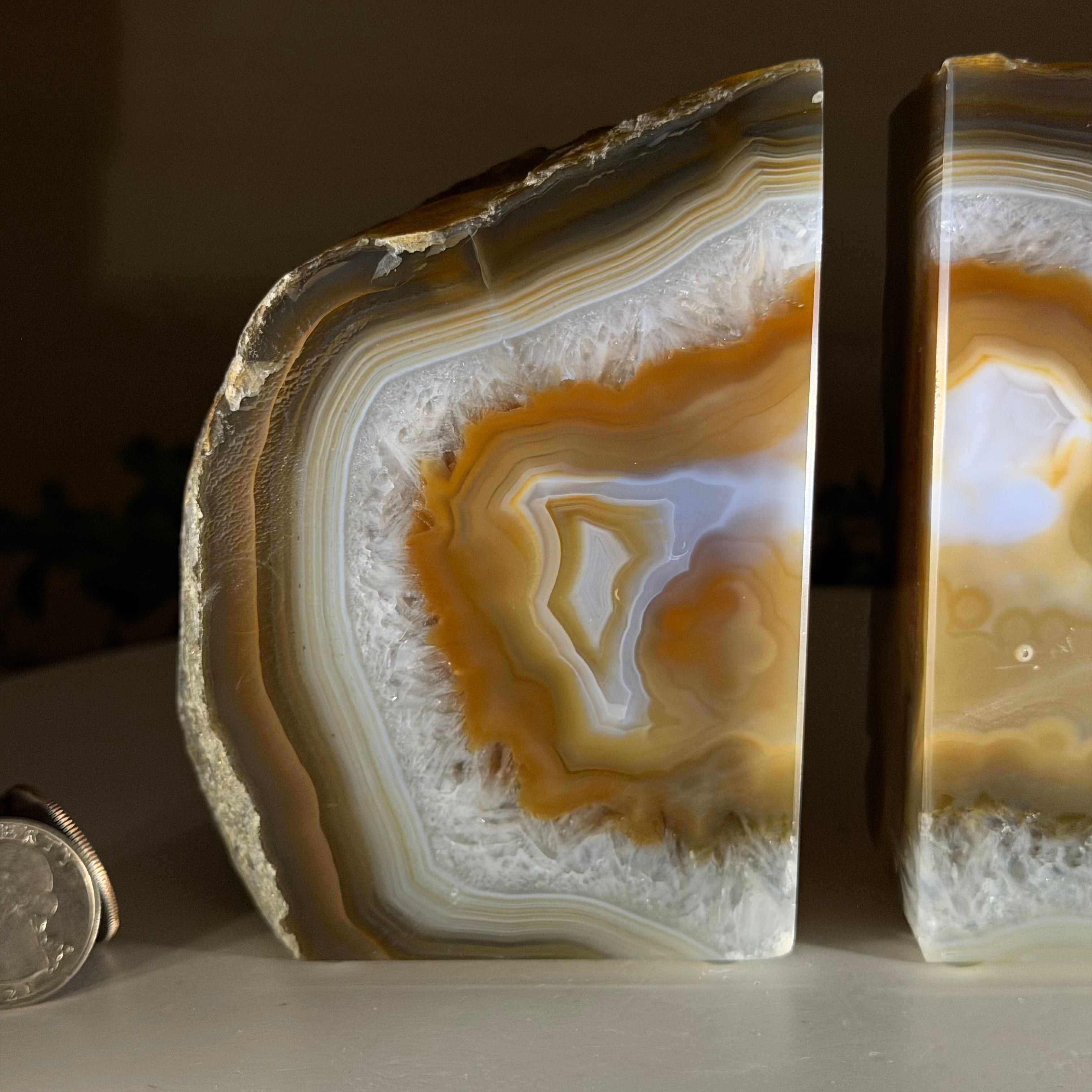 Formed from genuine Brazilian Agate geodes, these Agate Crystal bookends showcase sparkling white crystals surrounded by colorful Agate bands across the front. With interior sides and bottom polished smooth for balance and stability. This pair highlights Agate's natural tones, blending raw crystal beauty with refined craftsmanship.