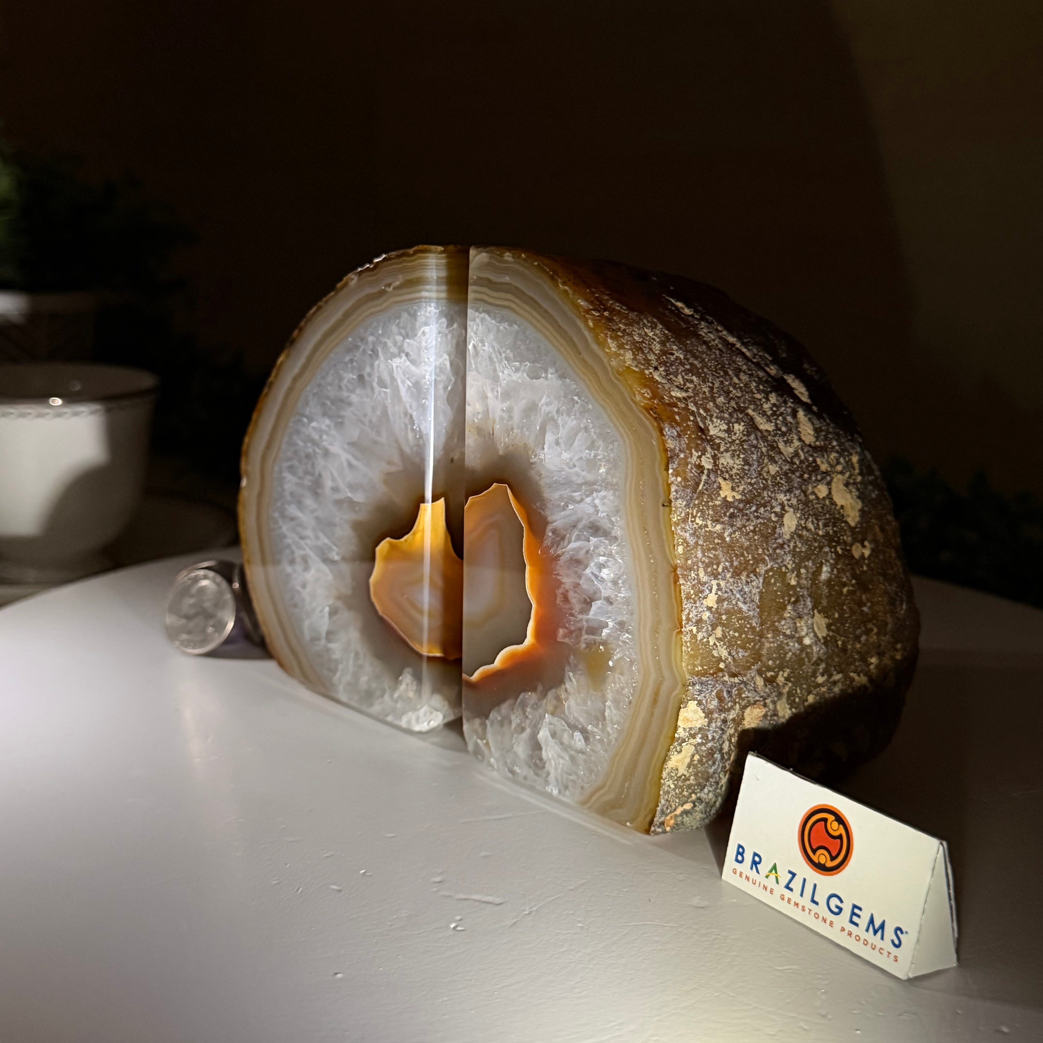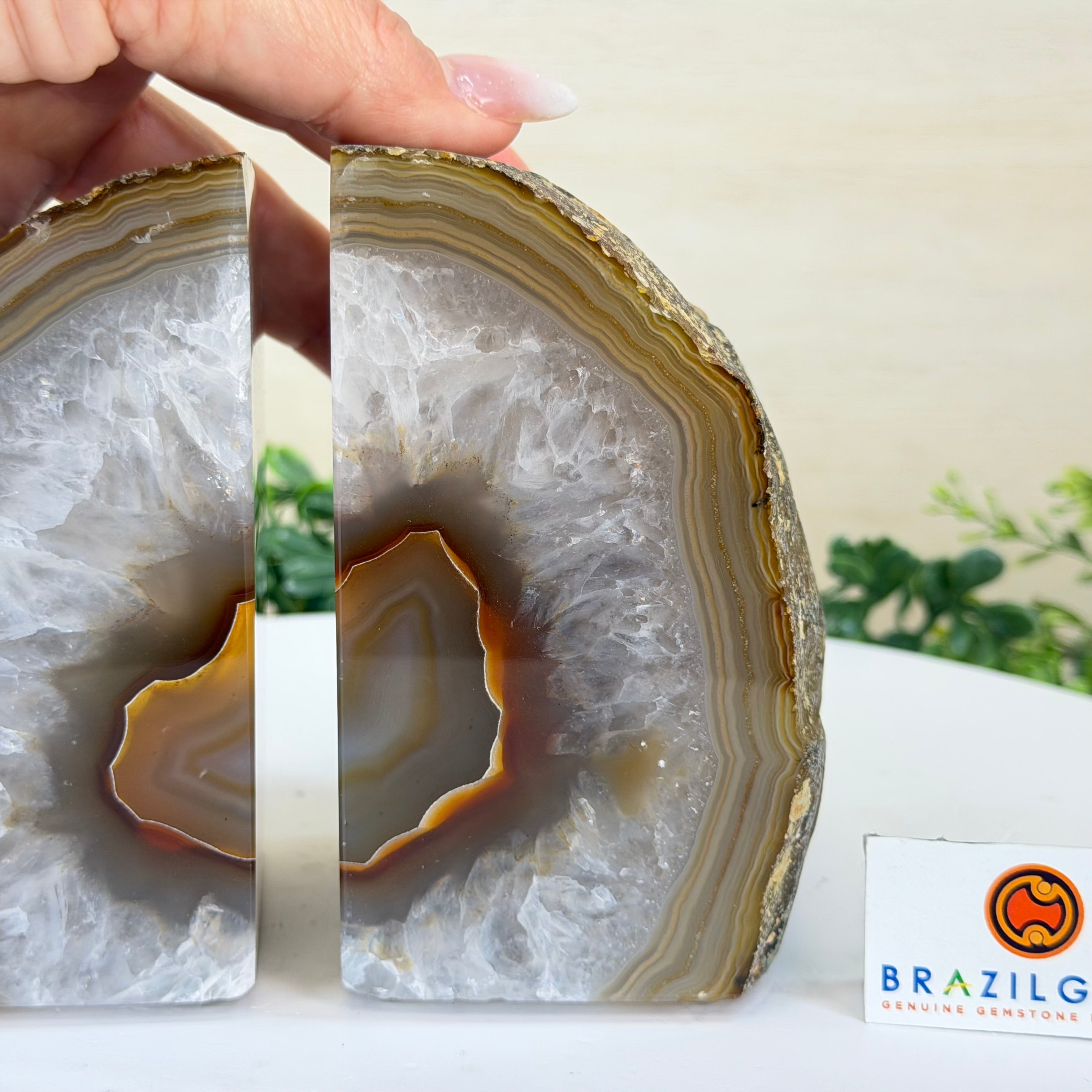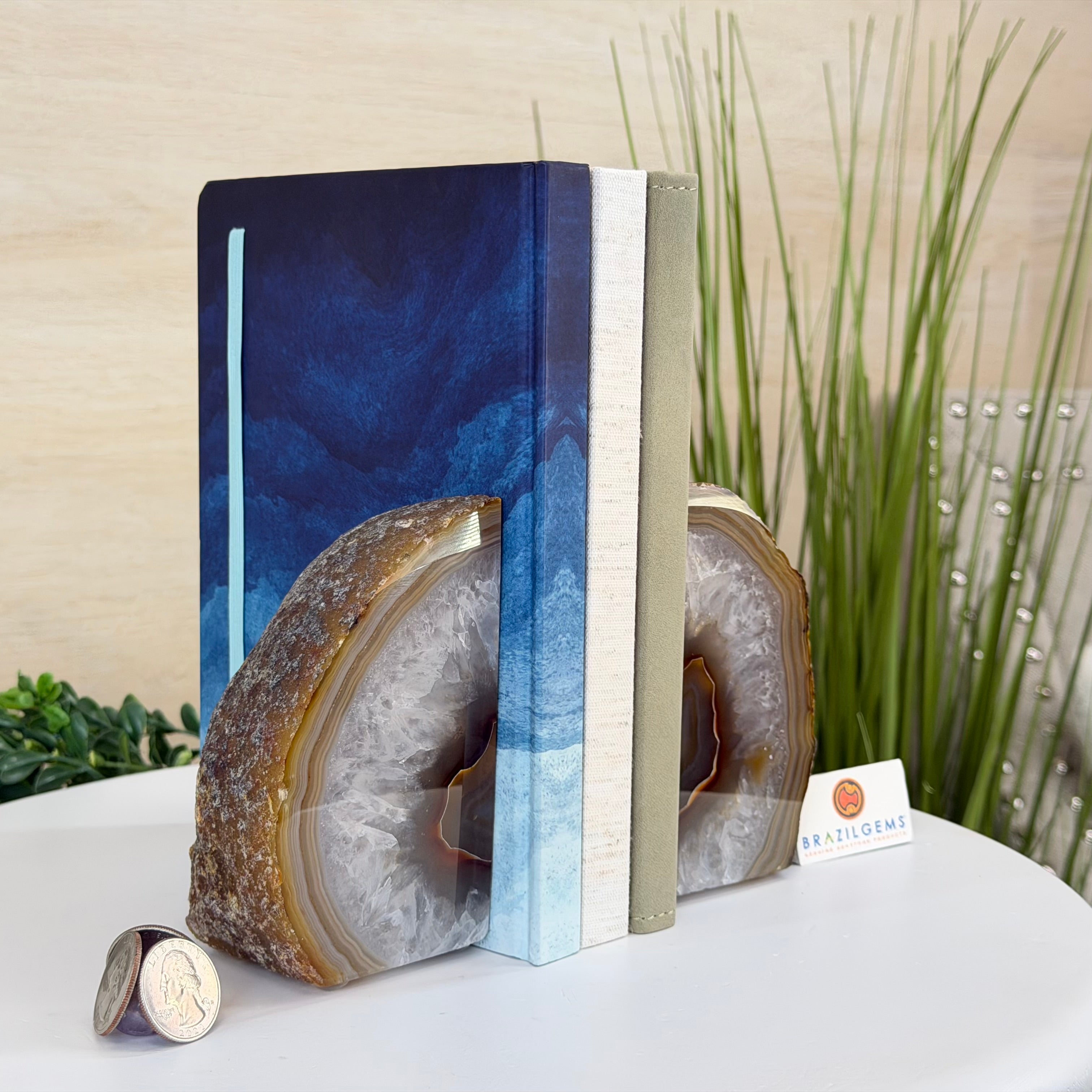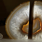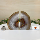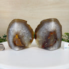 Formed from genuine Brazilian Agate geodes, these Agate Crystal bookends showcase sparkling white crystals surrounded by colorful Agate bands across the front. With interior sides and bottom polished smooth for balance and stability. This pair highlights Agate's natural tones, blending raw crystal beauty with refined craftsmanship.