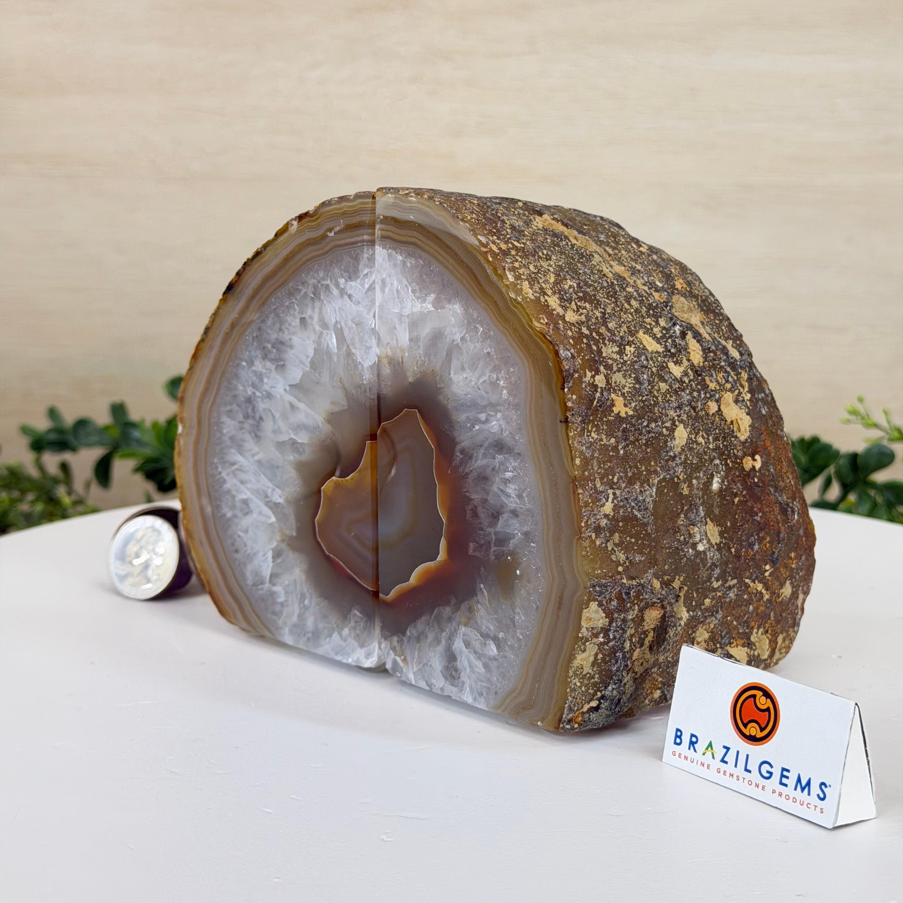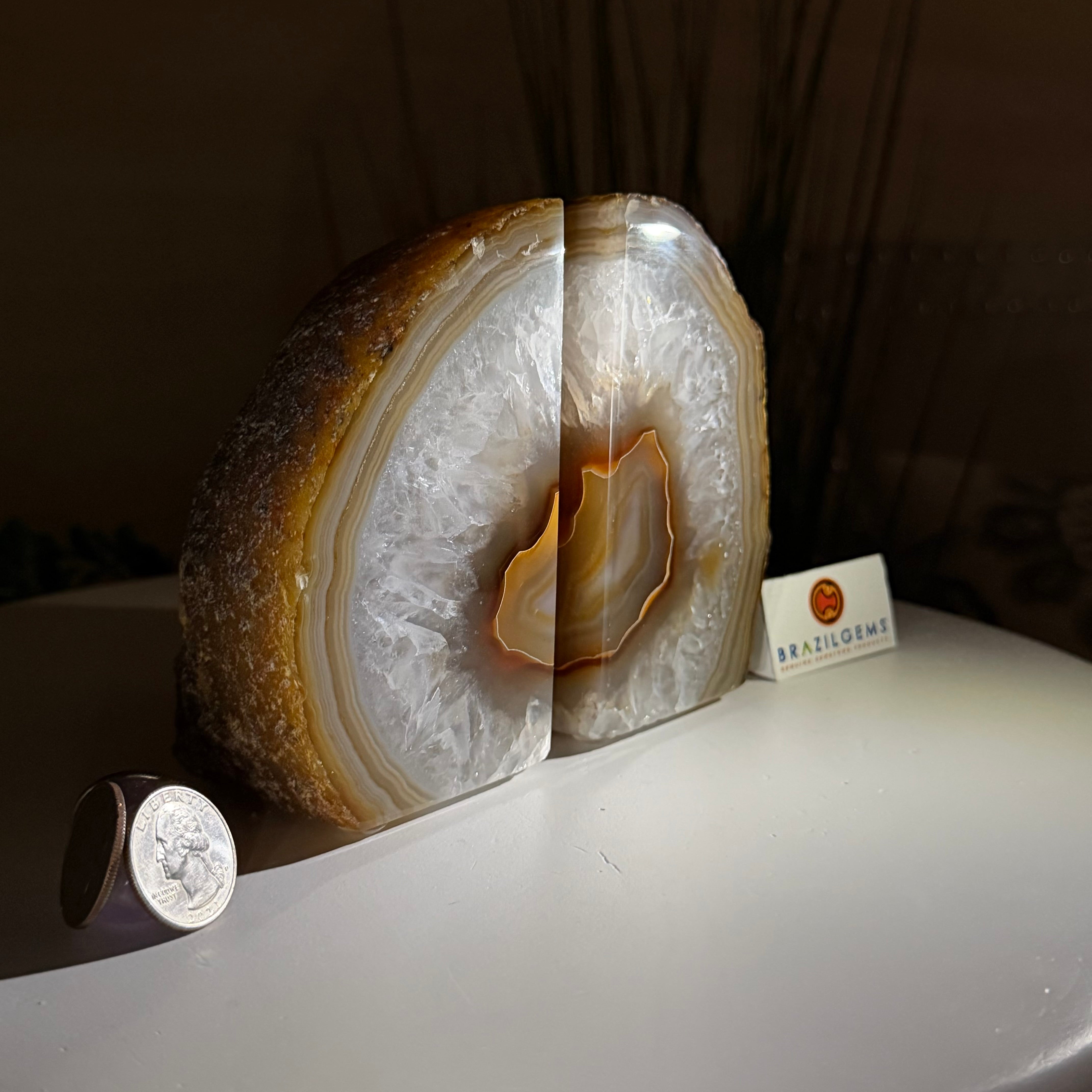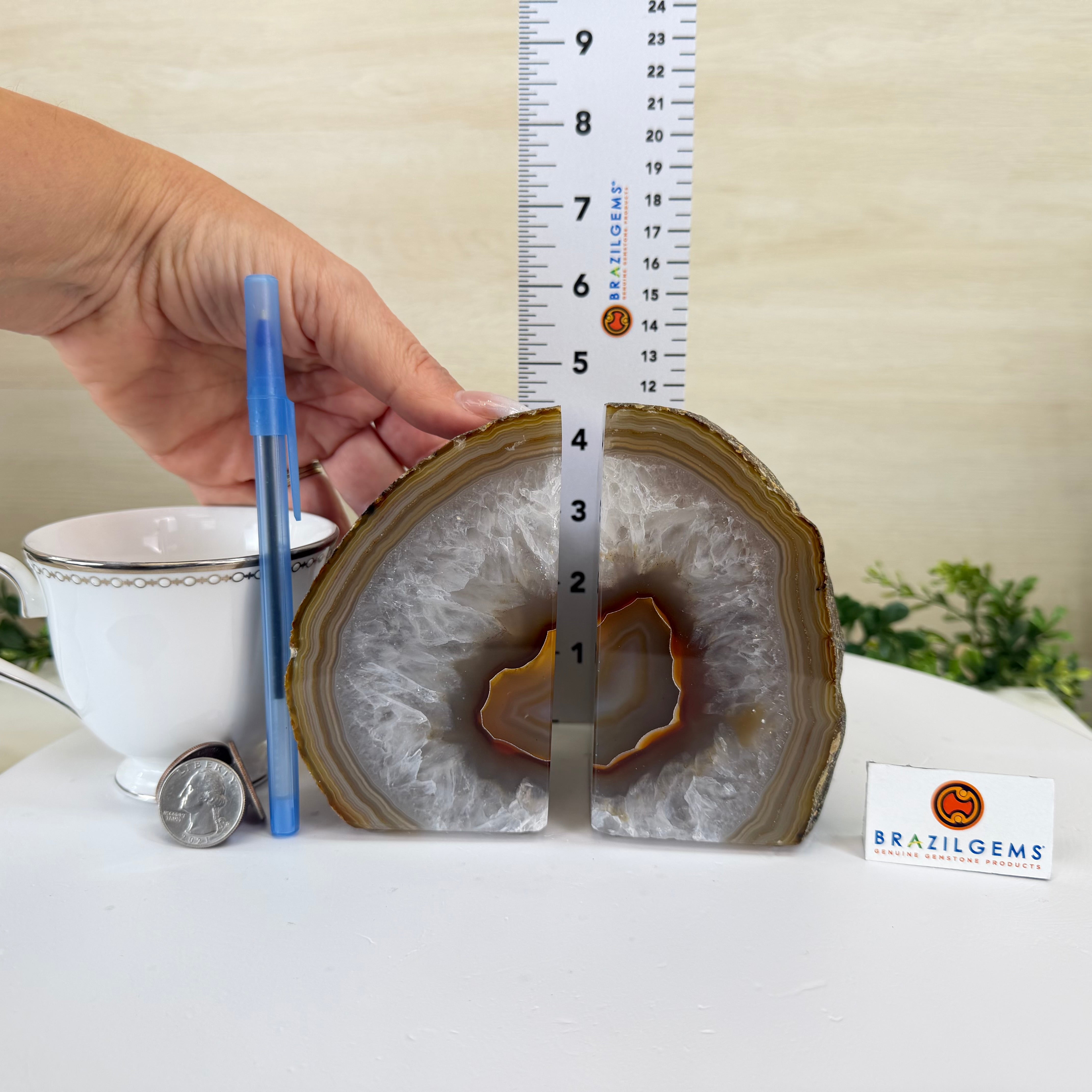 Formed from genuine Brazilian Agate geodes, these Agate Crystal bookends showcase sparkling white crystals surrounded by colorful Agate bands across the front. With interior sides and bottom polished smooth for balance and stability. This pair highlights Agate's natural tones, blending raw crystal beauty with refined craftsmanship.