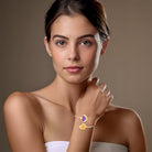 Embody grace and sophistication with this gorgeous Cuff Style 18k Gold Plated Bracelet featuring small fragments of natural gemstones formed into heart shapes on each end . A clear resin layer over the gemstone fragments elegantly displays the artisan process to make each piece a wearable piece of art.