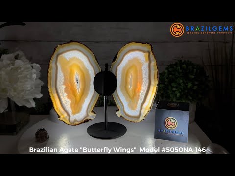 Brazil Gems® brings you this Natural Brazilian Agate Slices beautifully displayed as Butterfly Wings on a black metal stand. These are delicate and elegant pieces that will accent any décor and make for great gifts to a loved one. They are translucent and will look amazing with light behind or placed by a window.