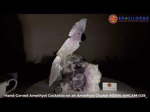 Each intricate detail of the bird is meticulously carved by skilled Brazilian artisans who have mastered the technique that combines the beauty of Brazil's gemstones with their colorful native birds into an amazing art piece. Elevate your space with the timeless charm of our Cockatoo gemstone bird on an Amethyst base.