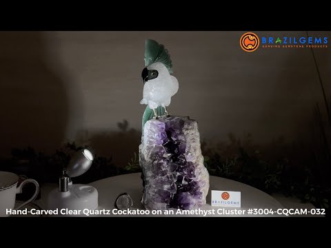 Each intricate detail of the bird is meticulously carved by skilled Brazilian artisans who have mastered the technique that combines the beauty of Brazil's gemstones with their colorful native birds into an amazing art piece. Elevate your space with the timeless charm of our Cockatoo gemstone bird on an Amethyst base.