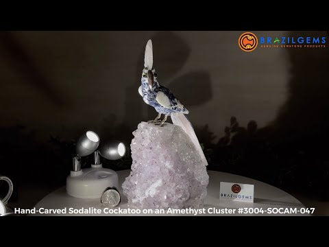 Marvel at our exquisite Large Size hand-carved Cockatoo gemstone bird perched on a captivating Amethyst cluster base, a harmonious blend of nature, art, and elegance. Crafted from premium Sodalite for its body, Brown Jasper for its beak, Rose Quartz for its crest and its tail, Blue Quartz for its tail accent and adorned with cute little metal feet, this stunning sculpture captures the essence of nature's beauty.