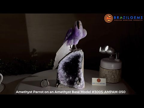 Each intricate detail of the bird is meticulously carved by skilled Brazilian artisans who have mastered the technique that combines the beauty of Brazil's gemstones with their colorful native birds into an amazing art piece. Elevate your space with the timeless charm of our Parrot gemstone bird on an Amethyst base.