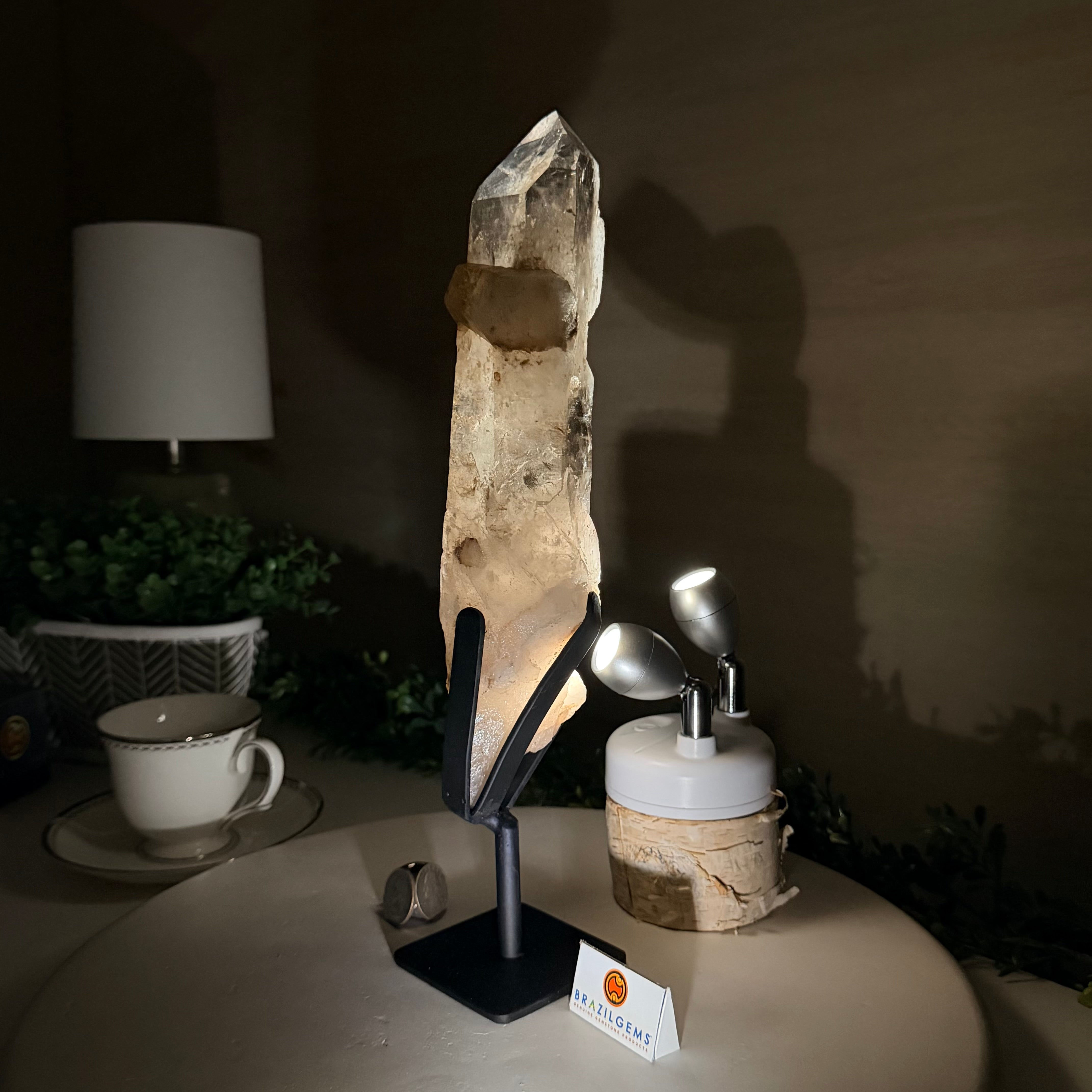 Elevate your space with this Extra Quality Brazilian Smoky Quartz Crystal Point, naturally formed in rich, warm brown tones with a soft golden glow. Mounted on a fixed black metal base, it stands upright with a striking presence that instantly draws the eye.