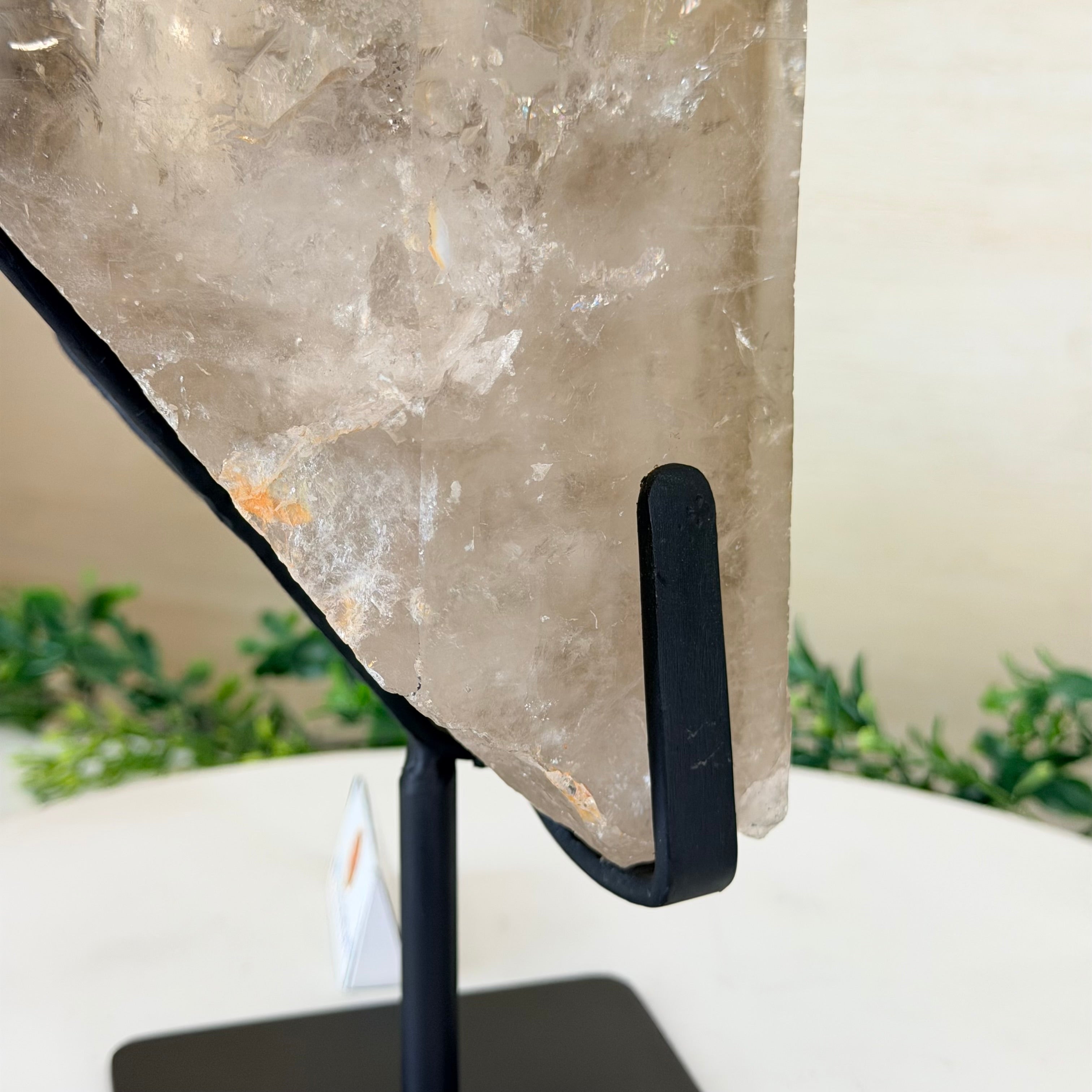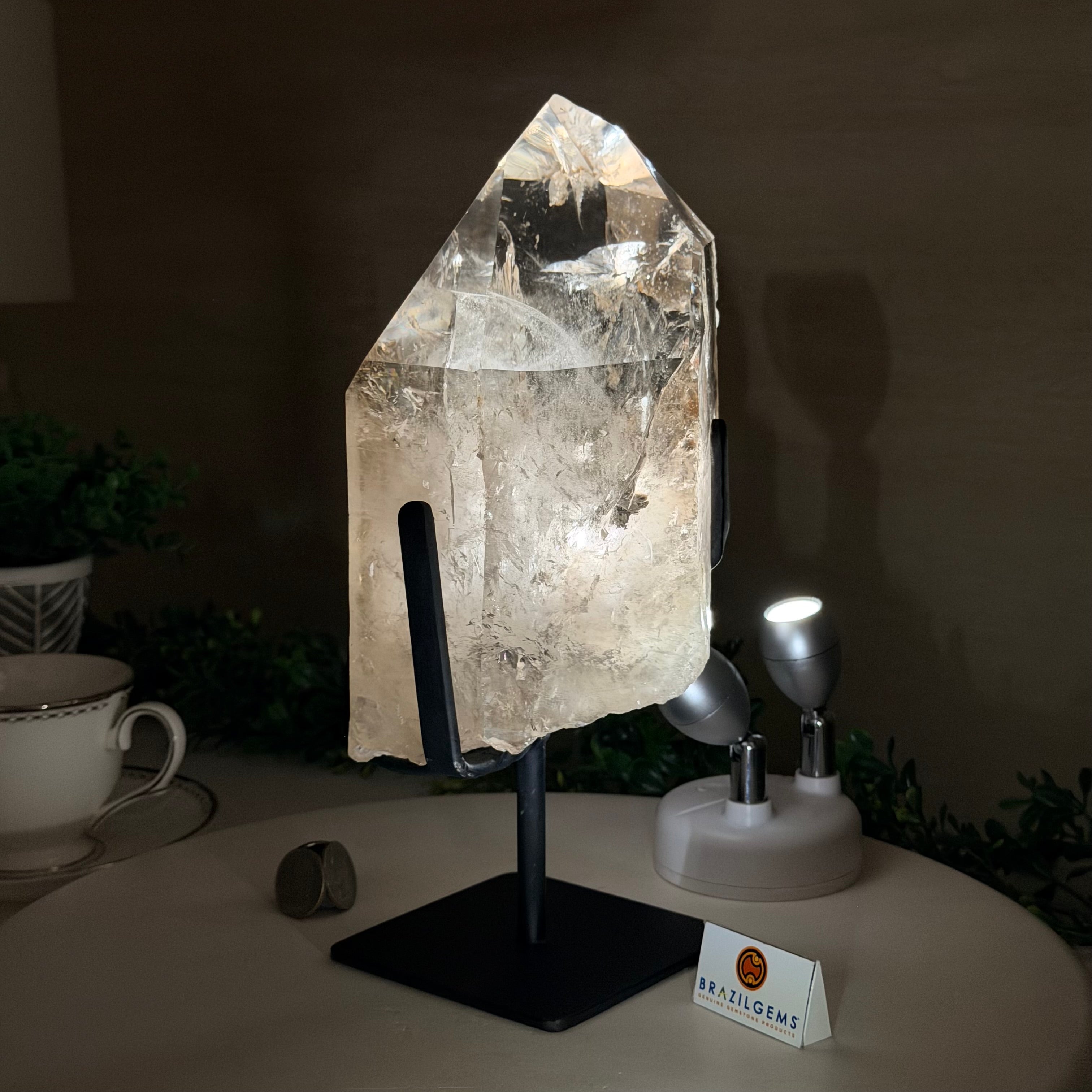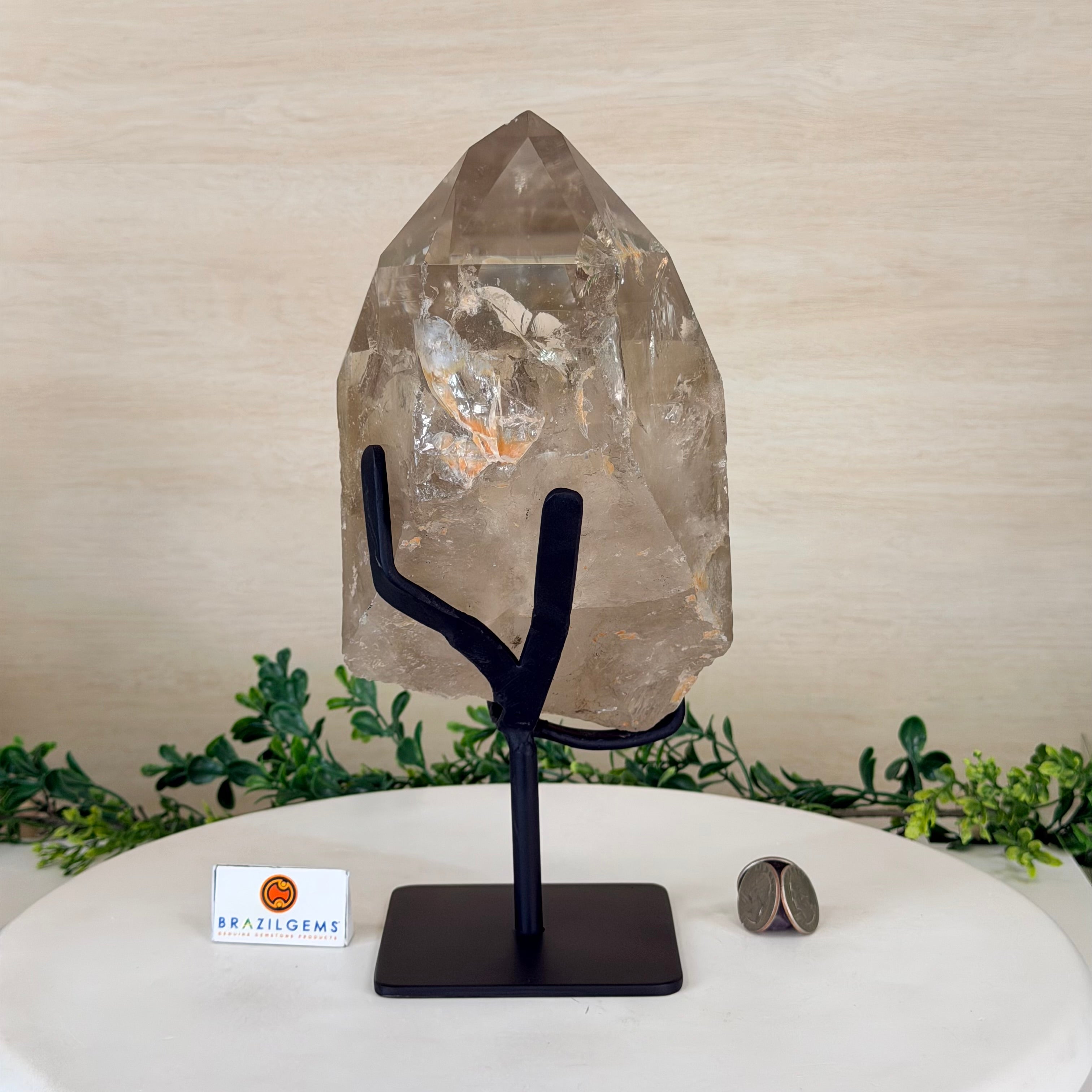 Elevate your space with this Super Quality Brazilian Phantom Smoky Quartz Crystal Point, naturally formed in warm brown tones with a soft golden glow. Mounted on a fixed black metal base, it stands upright with a striking presence that instantly draws the eye.