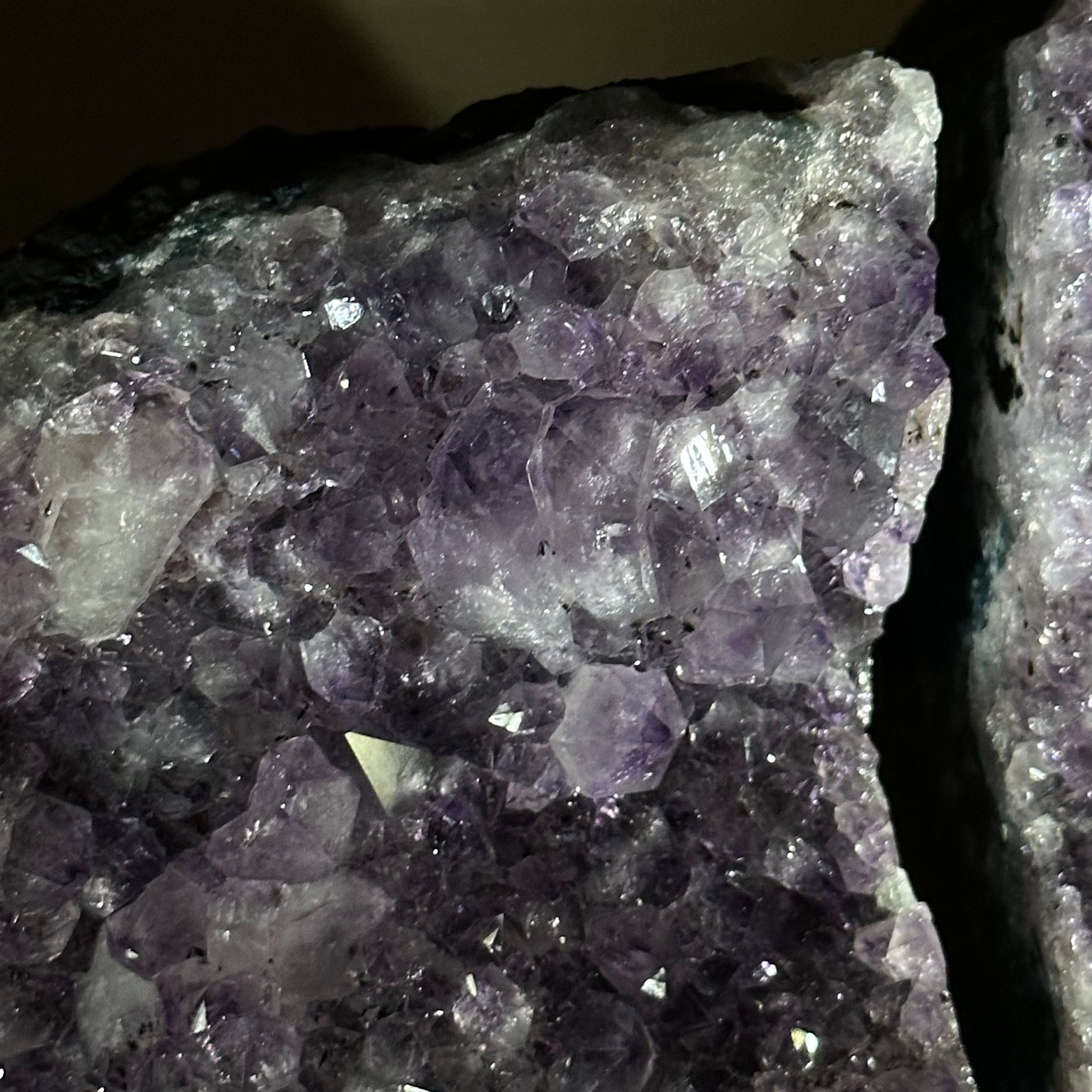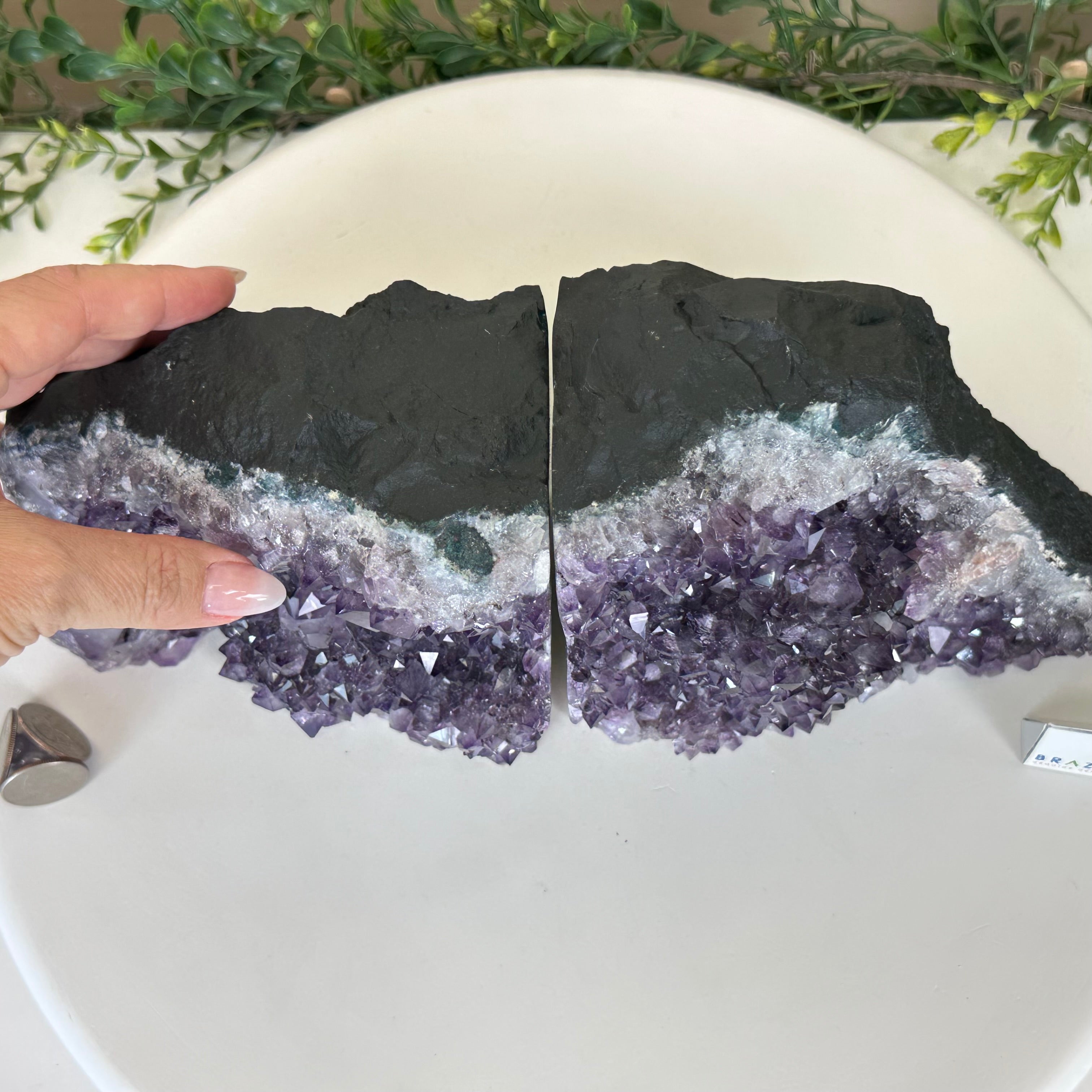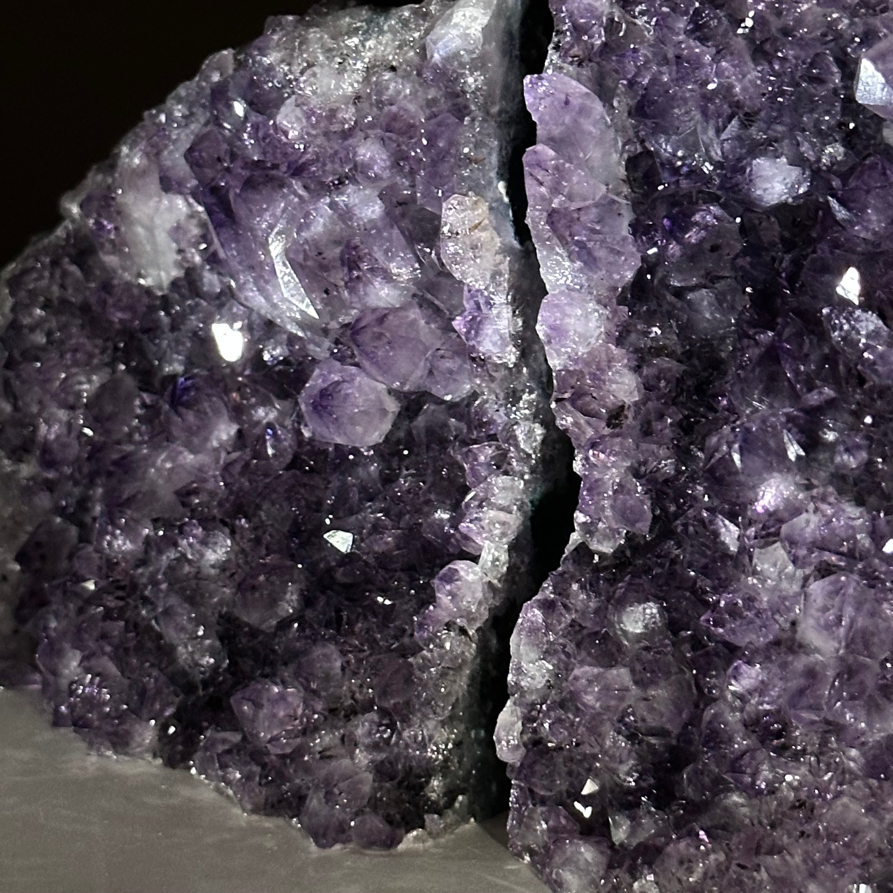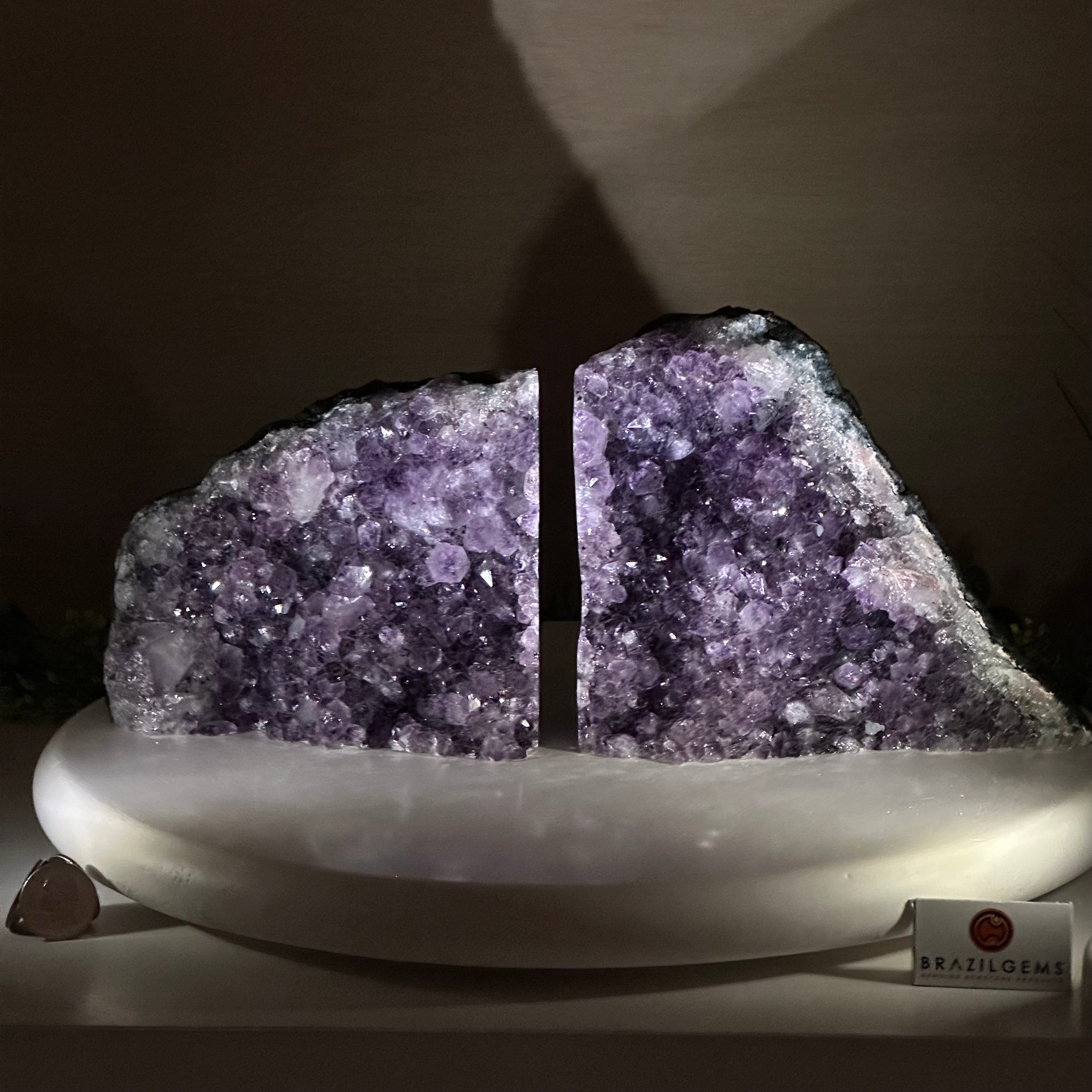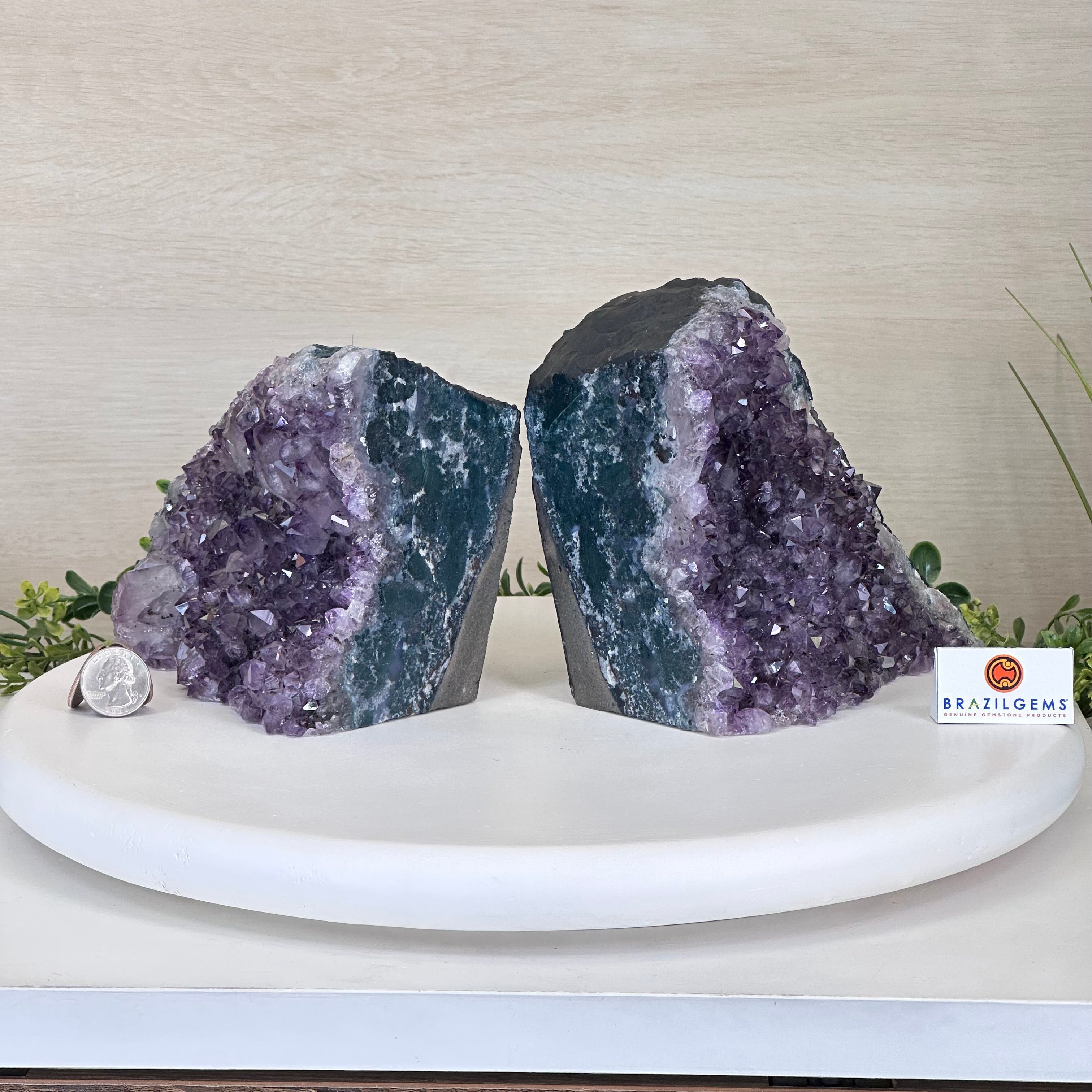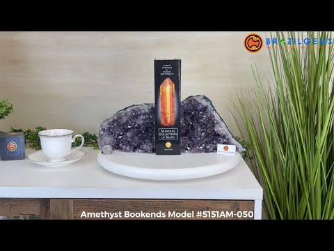 Formed from genuine Brazilian amethyst geodes, these Amethyst Crystal bookends showcase sparkling drusy crystal points across the front, with interior sides and bases polished smooth for balance and stability. Each pair highlights amethyst’s natural purple hues, blending raw crystal beauty with refined craftsmanship.