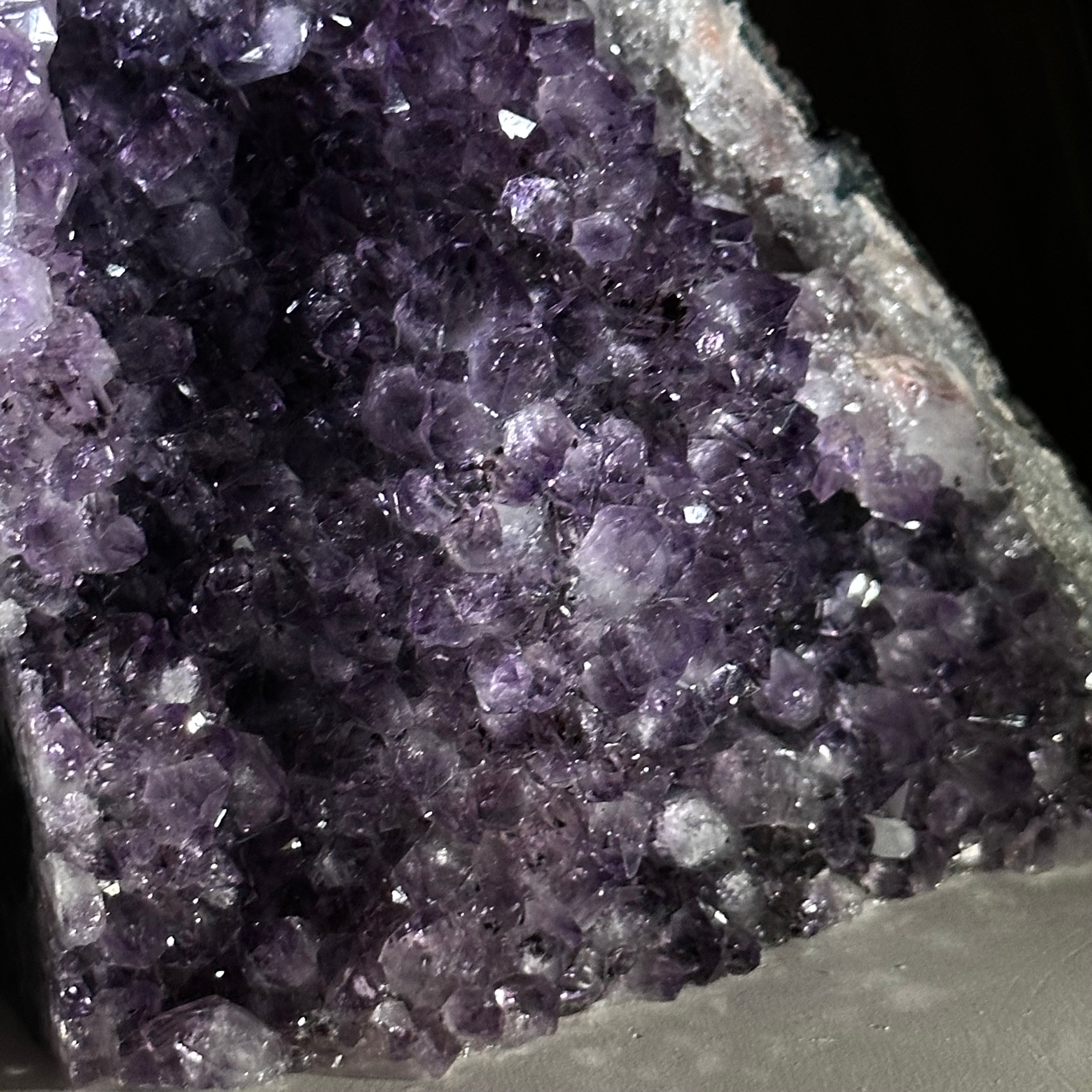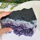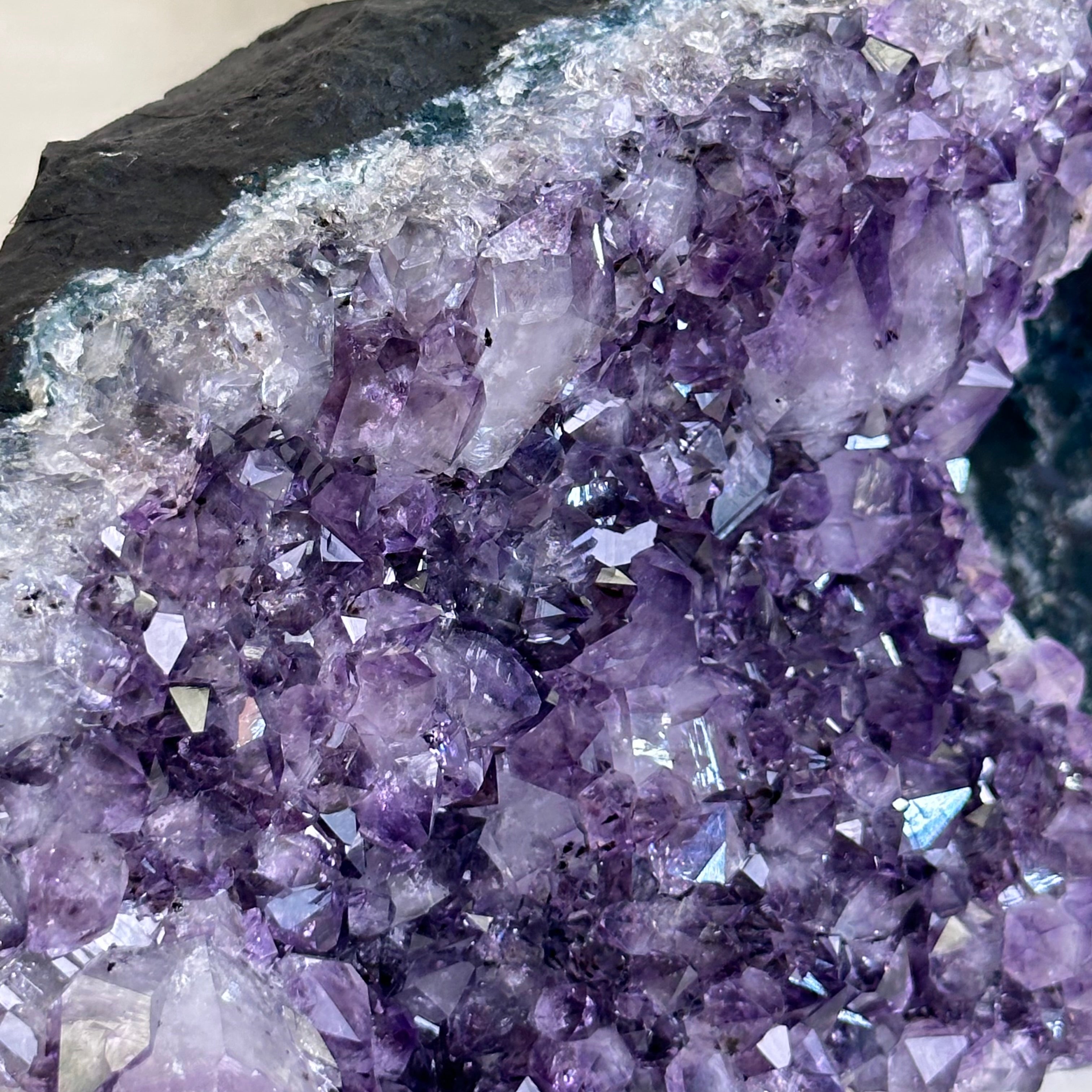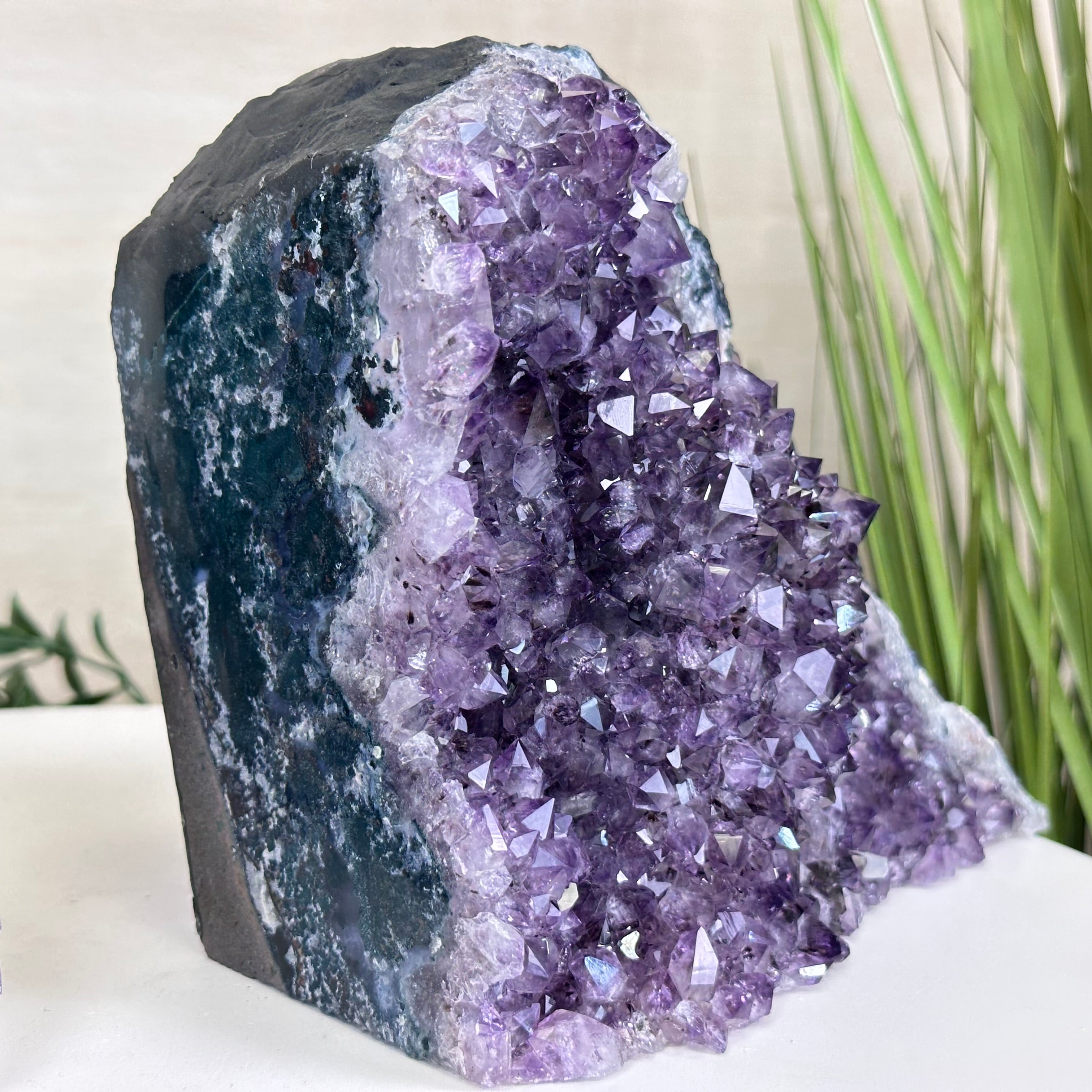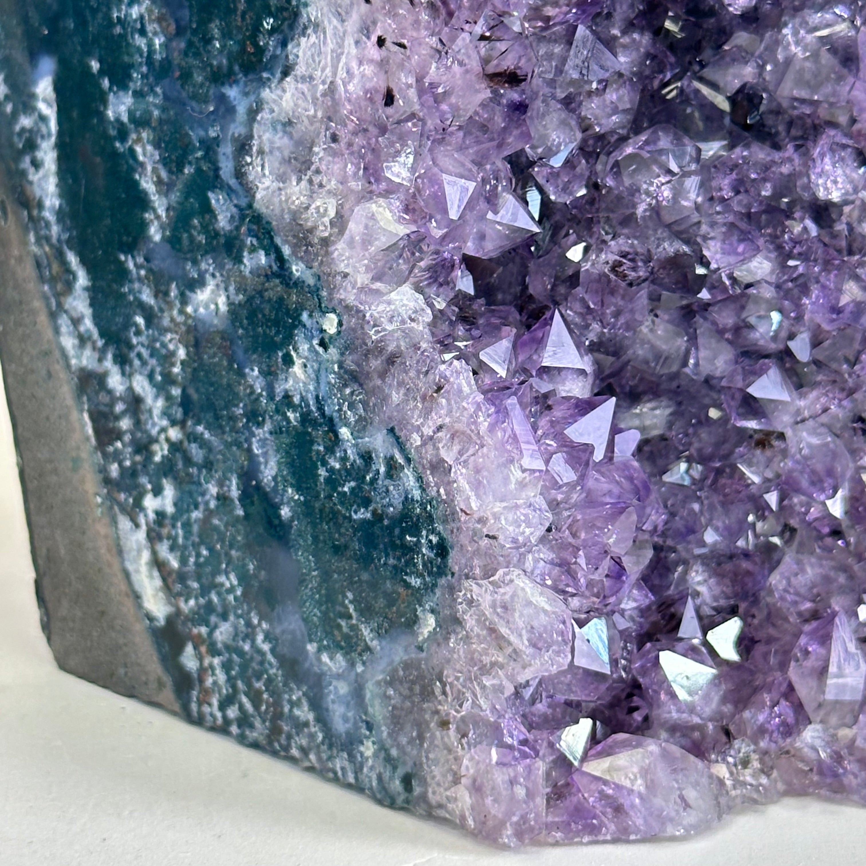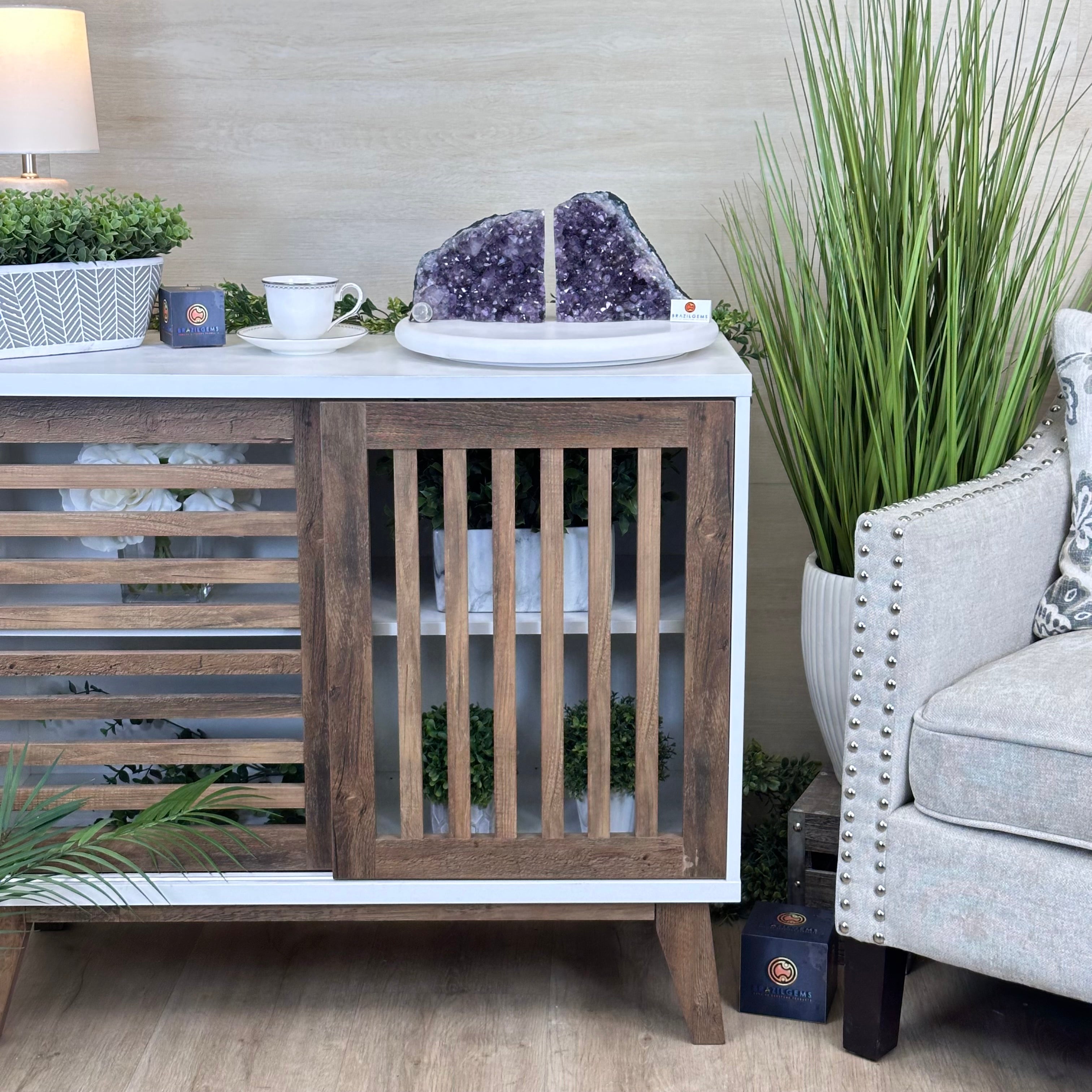 Formed from genuine Brazilian amethyst geodes, these Amethyst Crystal bookends showcase sparkling drusy crystal points across the front, with interior sides and bases polished smooth for balance and stability. Each pair highlights amethyst’s natural purple hues, blending raw crystal beauty with refined craftsmanship.