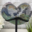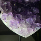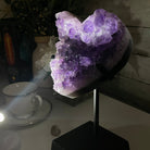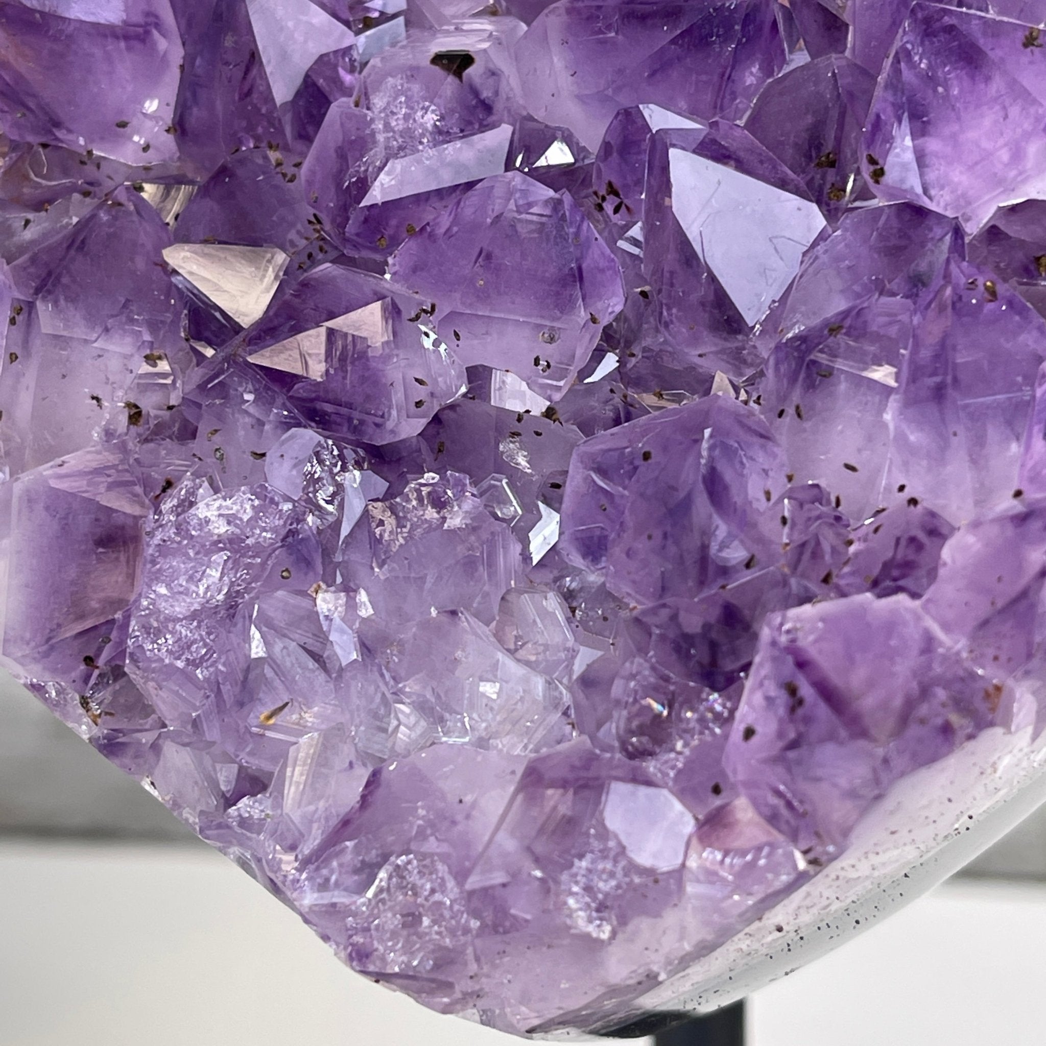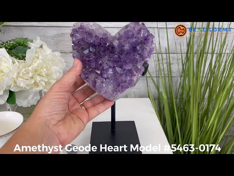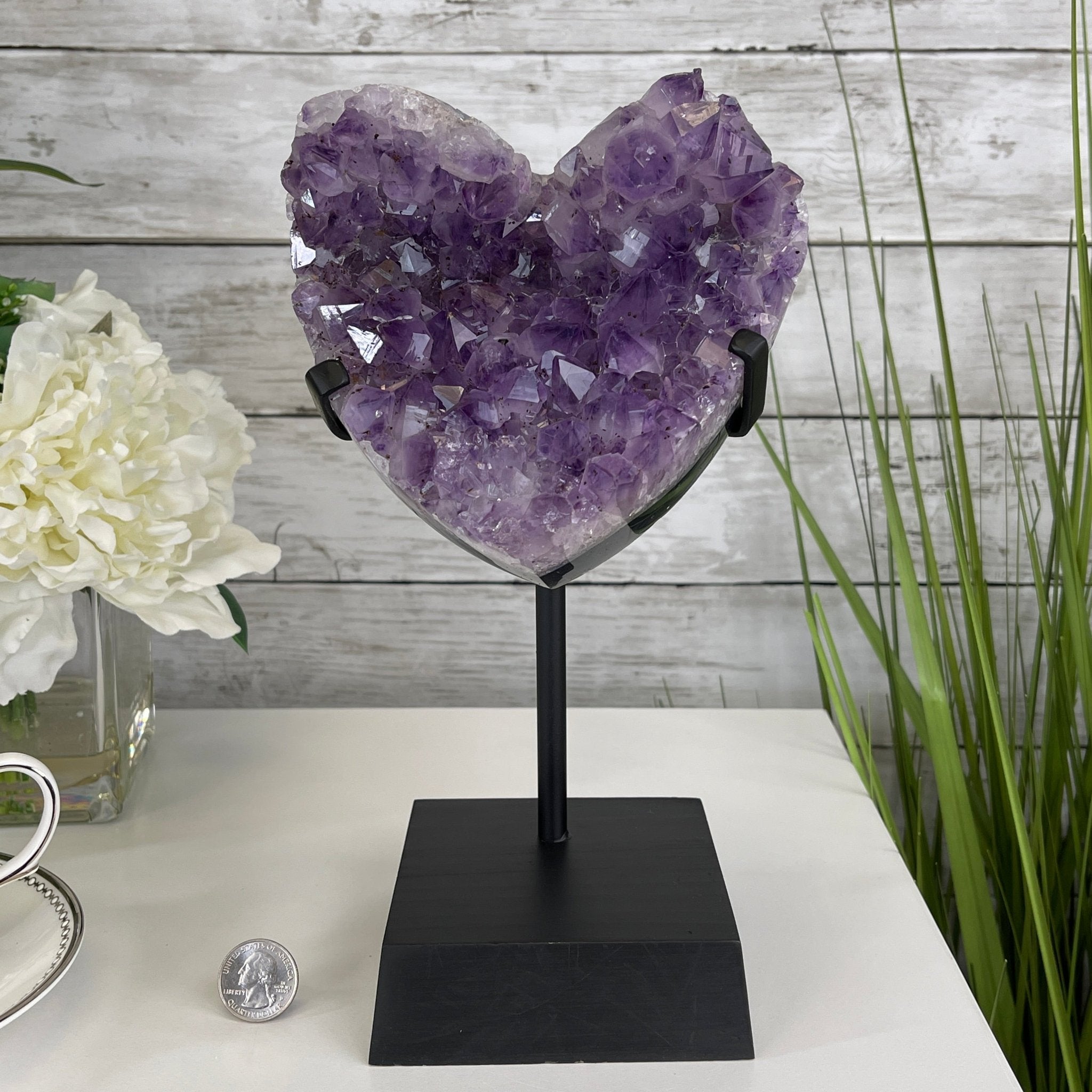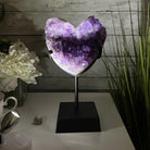 Extra Quality Heart-Shaped Amethyst Geode on a black metal and wood stand. This beautiful gemstone has polished edges and it's backside exposes its natural rough stone on the back. It also features vibrant violet colors and nicely shaped crystal points to admire for years to come. Its polished heart shape will make the ultimate romantic gift to the one you love.