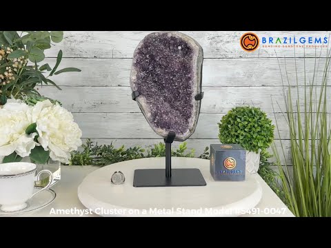 Brazil Gems® brings you this Extra Quality Natural Uruguayan Amethyst Cluster on a black metal base. This gemstone has sparkling and nicely shaped amethyst points with lovely agate bands surrounding.