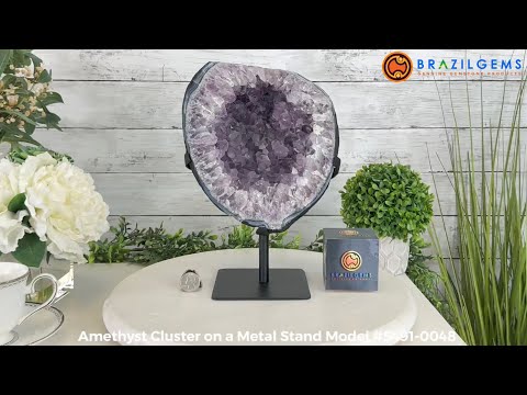 Brazil Gems® brings you this Extra Quality Natural Uruguayan Amethyst Cluster on a black metal base. This gemstone has sparkling and nicely shaped amethyst points with lovely agate bands surrounding.