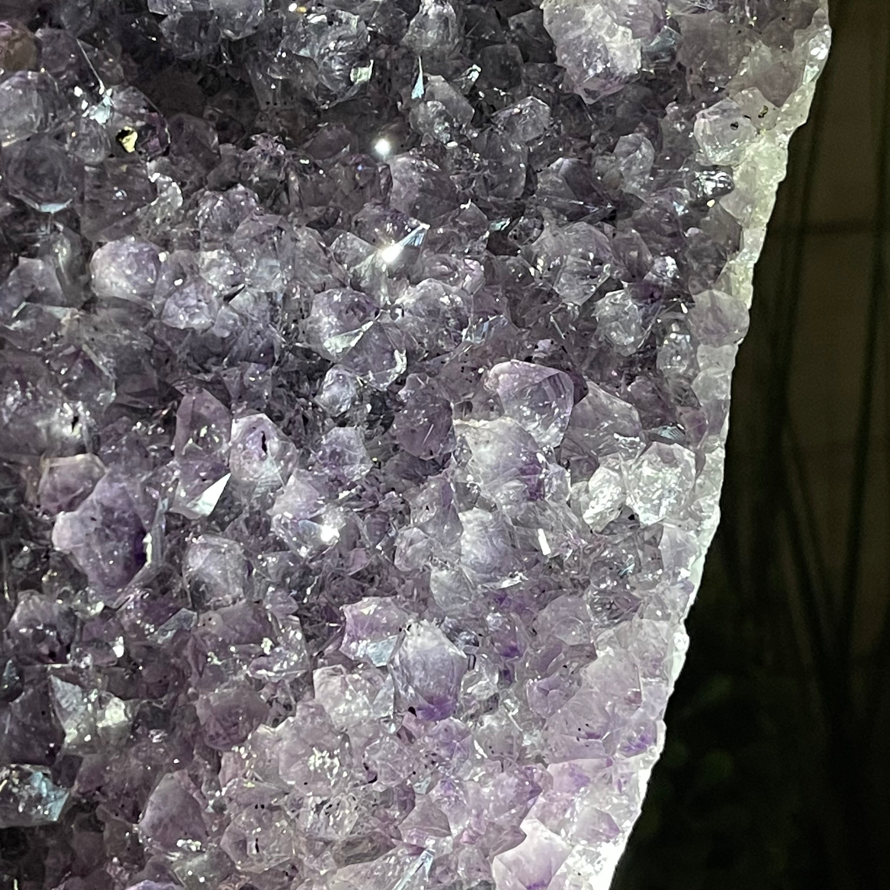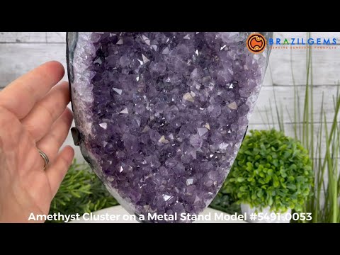 Brazil Gems® brings you this Extra Quality Natural Uruguayan Amethyst Cluster on a black metal base. This gemstone has sparkling and nicely shaped amethyst points with lovely agate bands surrounding.