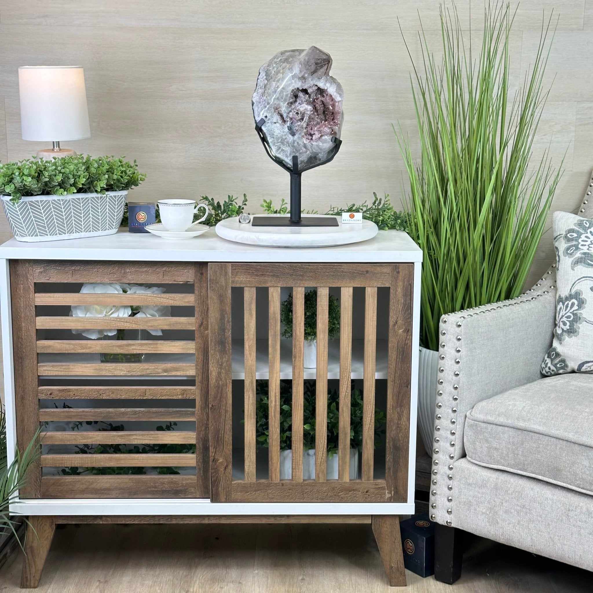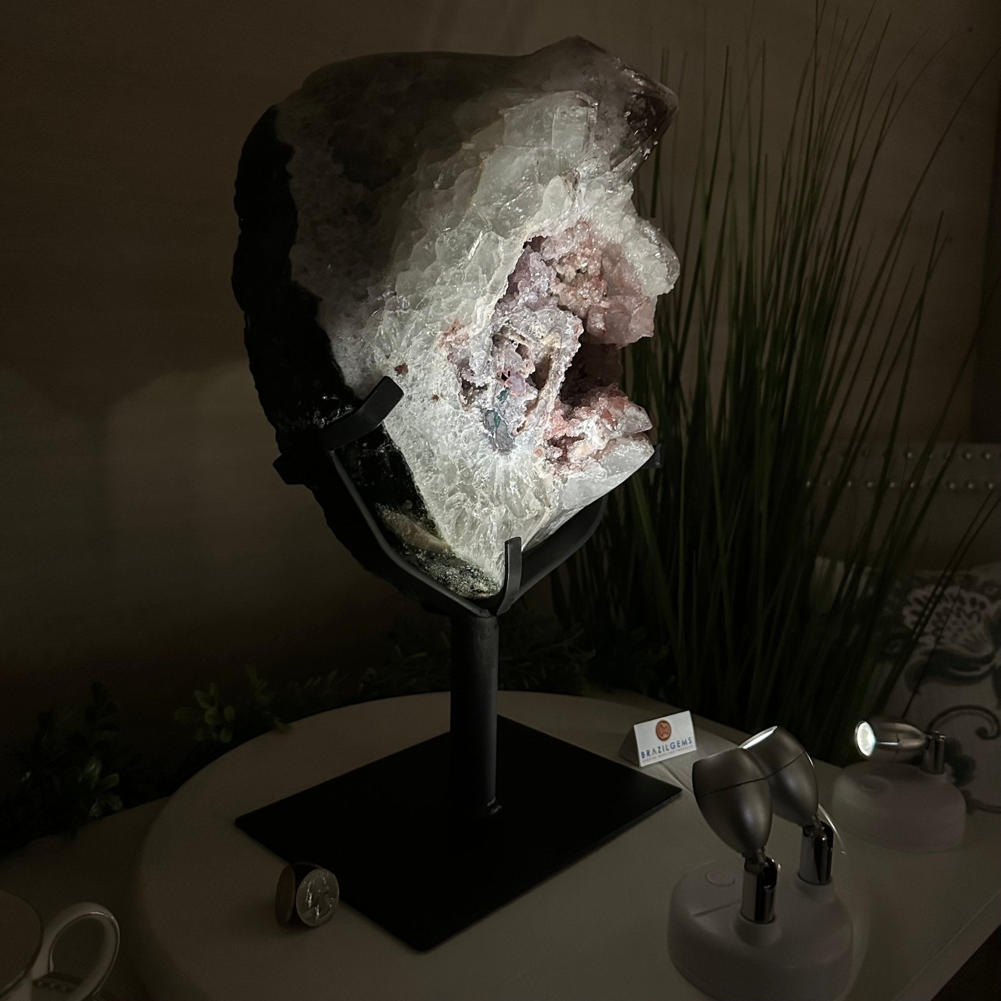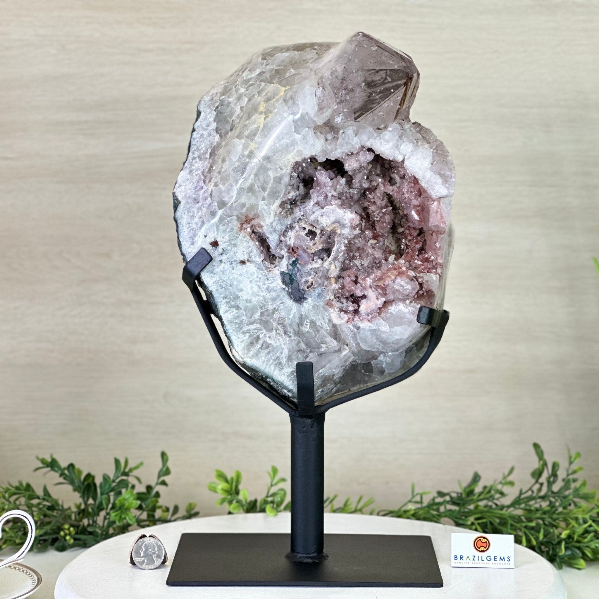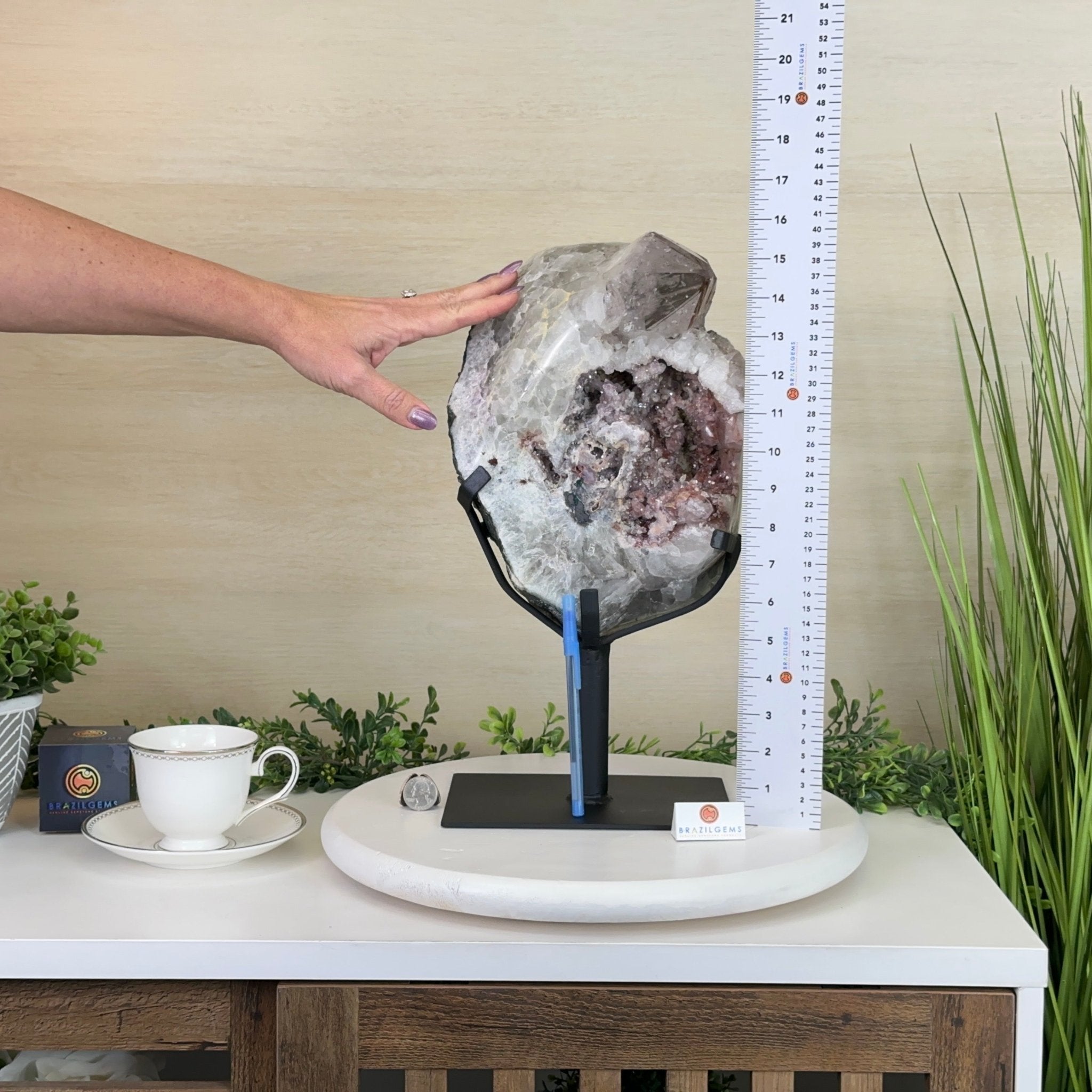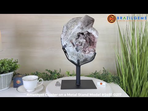 Disclaimer: This is a natural gemstone crystal sold by Brazil Gems® as is and as you see it in its images and video. It is the exact piece you will receive. It may contain natural imperfections as well as imperfections, repairs, scratches and/or broken edges from the extraction, polishing, mounting and prepping processes. The metal stand has been hand welded to fit this exact piece and then painted black. The crystal piece cannot be removed from its metal stand. At Brazil Gems®, we make every effort to get measurements as exact as possible but they are done by human hands and eyes and therefore may have minor discrepancies.