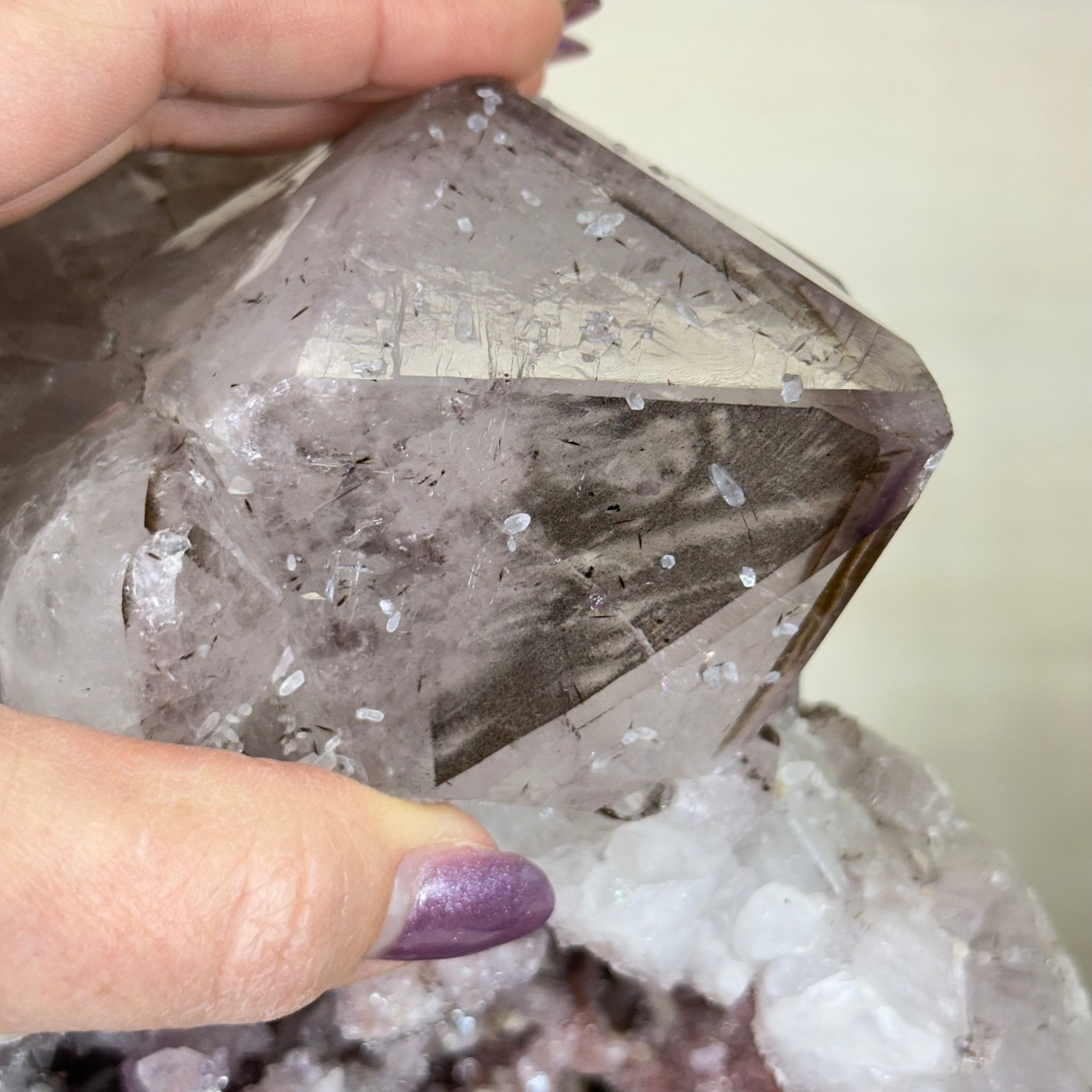 Infuse your room with the natural elegance of this Extra Quality Natural Brazilian Amethyst Cluster on a black metal base from Brazil Gems®. This gemstone has purple amethyst crystal points with a very large point on the top. It is polished in the front with a natural rough outer shell.