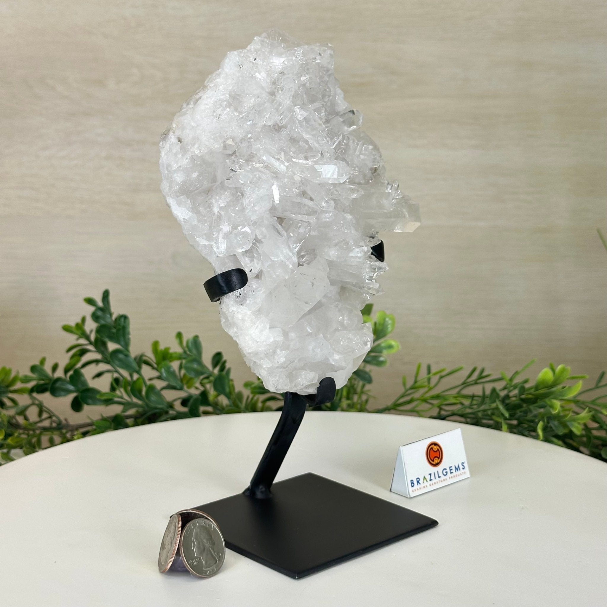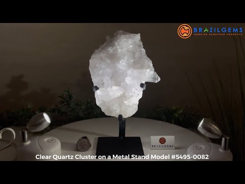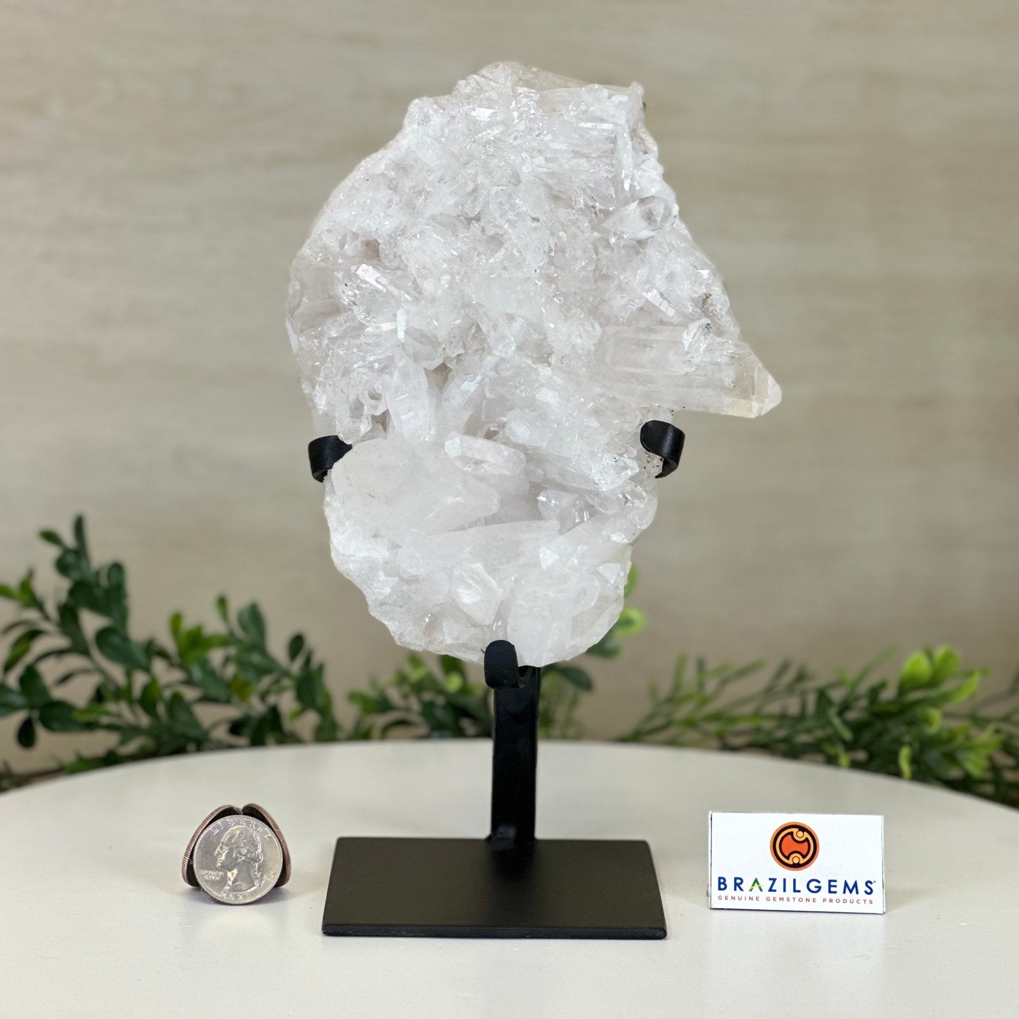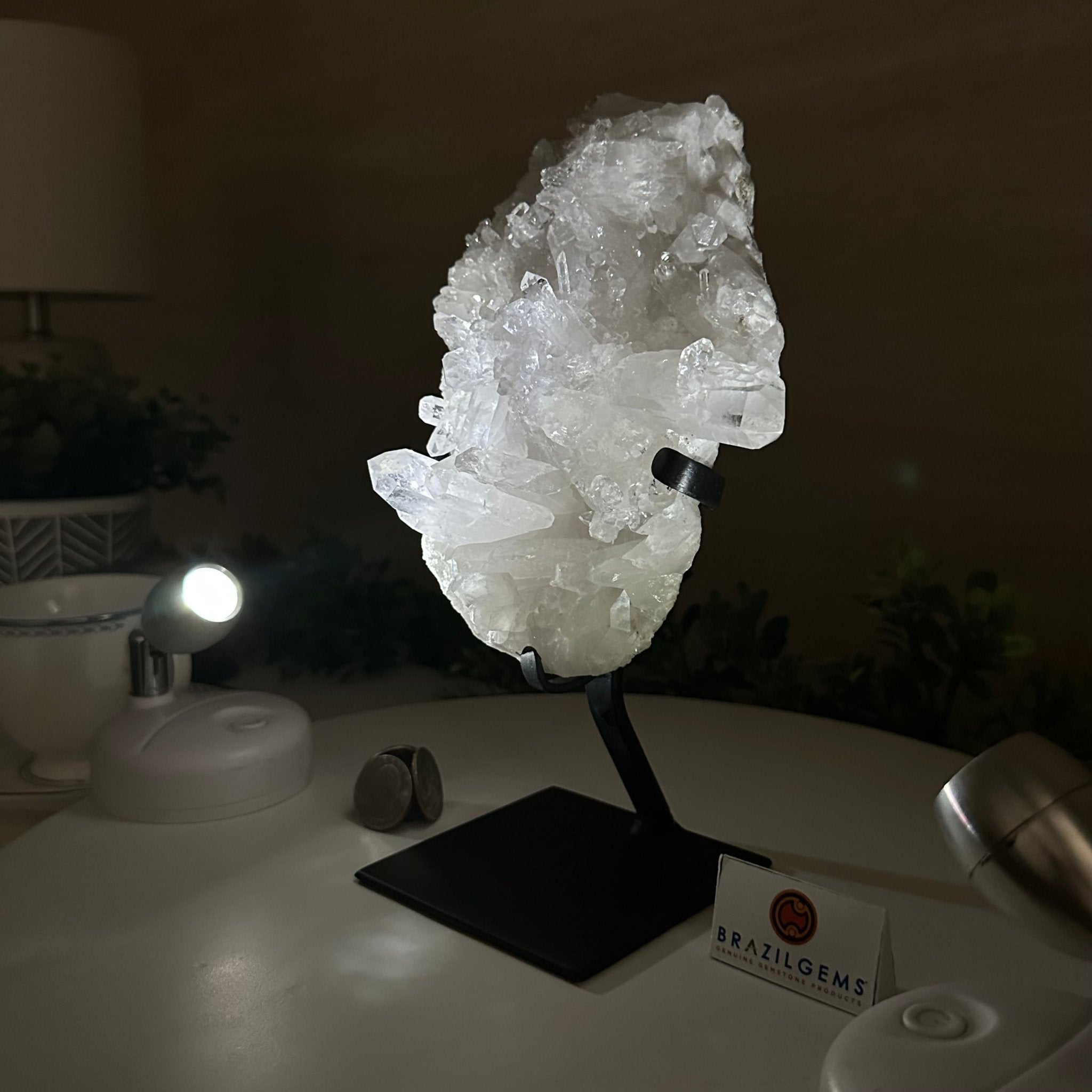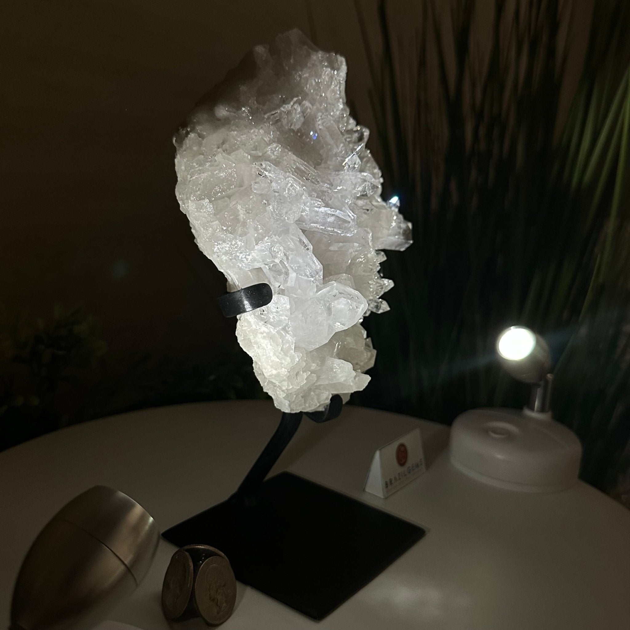 A testament to nature's sublime artistry, this extraordinary Brazilian Super Quality Clear Quartz Cluster by Brazil Gems® will boost your crystal collection to new heights. Elevated upon an elegant metal foundation, its commanding presence and radiant crystalline formations instantly captivate the observer's gaze. Each transparent facet reveals an intricate tableau of geological phenomena—a silent narrative of Earth's patient craftsmanship over countless millennia.