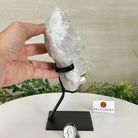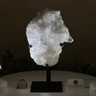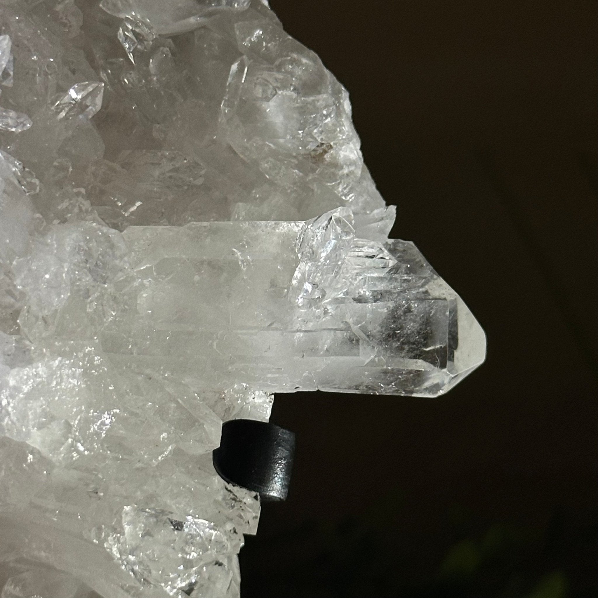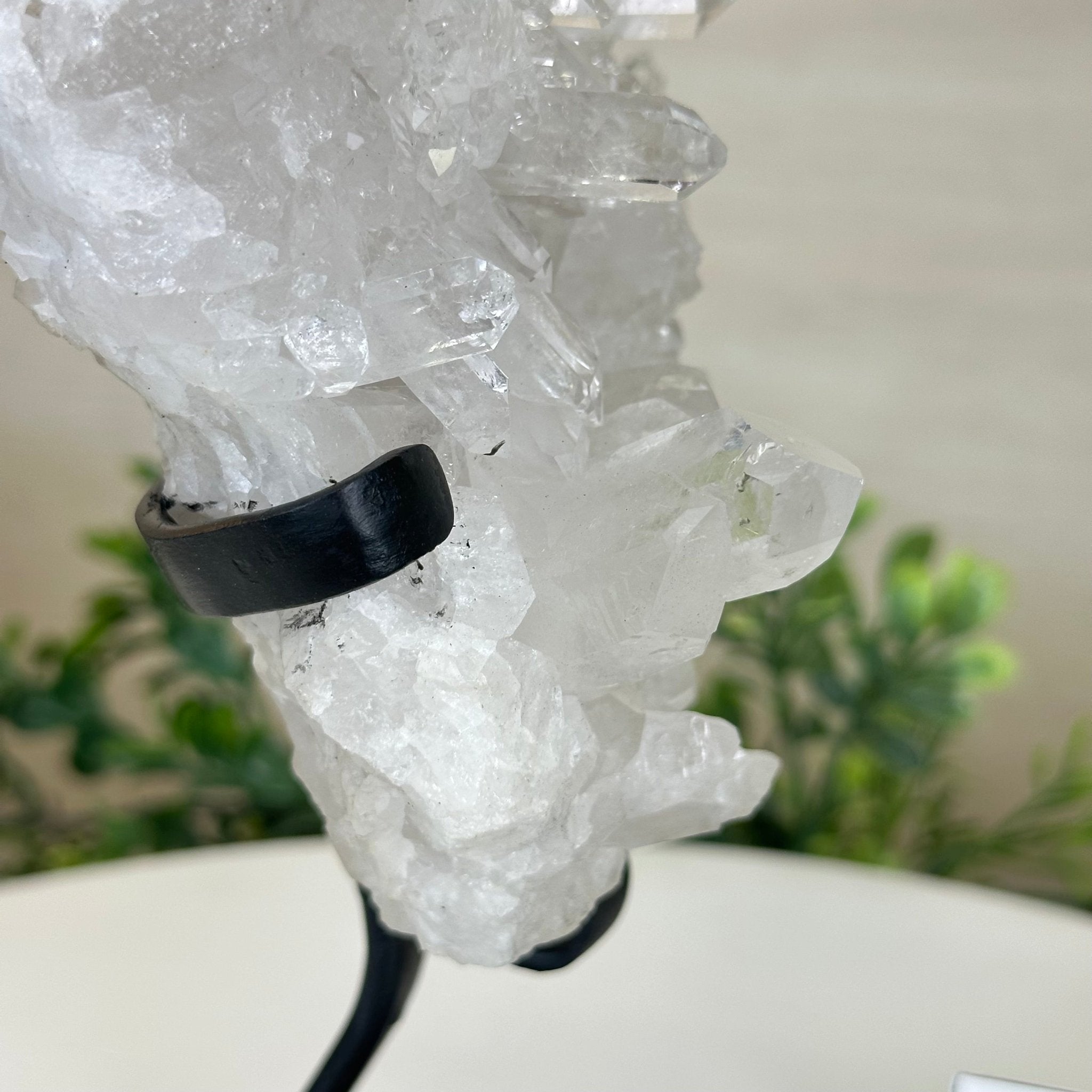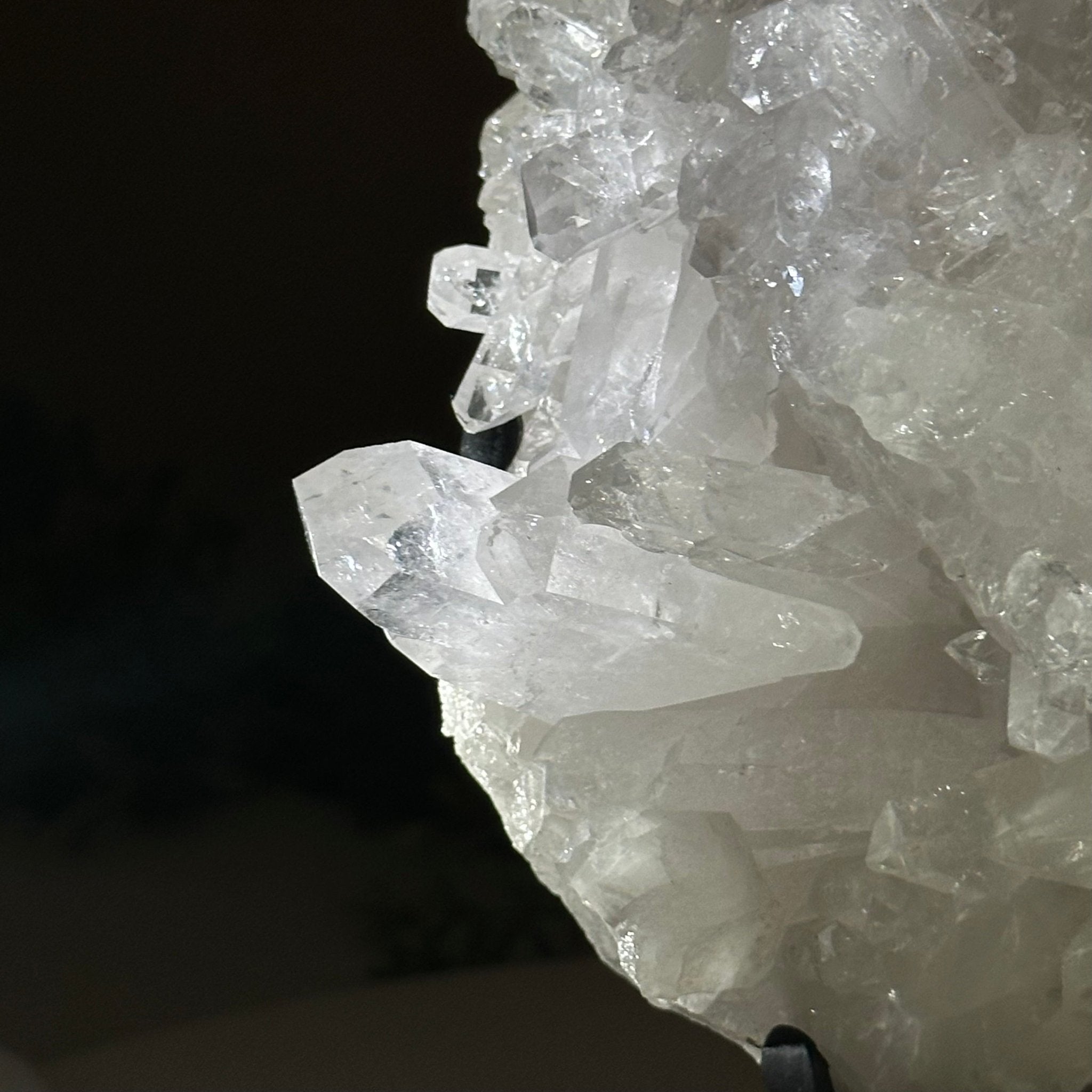 A testament to nature's sublime artistry, this extraordinary Brazilian Super Quality Clear Quartz Cluster by Brazil Gems® will boost your crystal collection to new heights. Elevated upon an elegant metal foundation, its commanding presence and radiant crystalline formations instantly captivate the observer's gaze. Each transparent facet reveals an intricate tableau of geological phenomena—a silent narrative of Earth's patient craftsmanship over countless millennia.